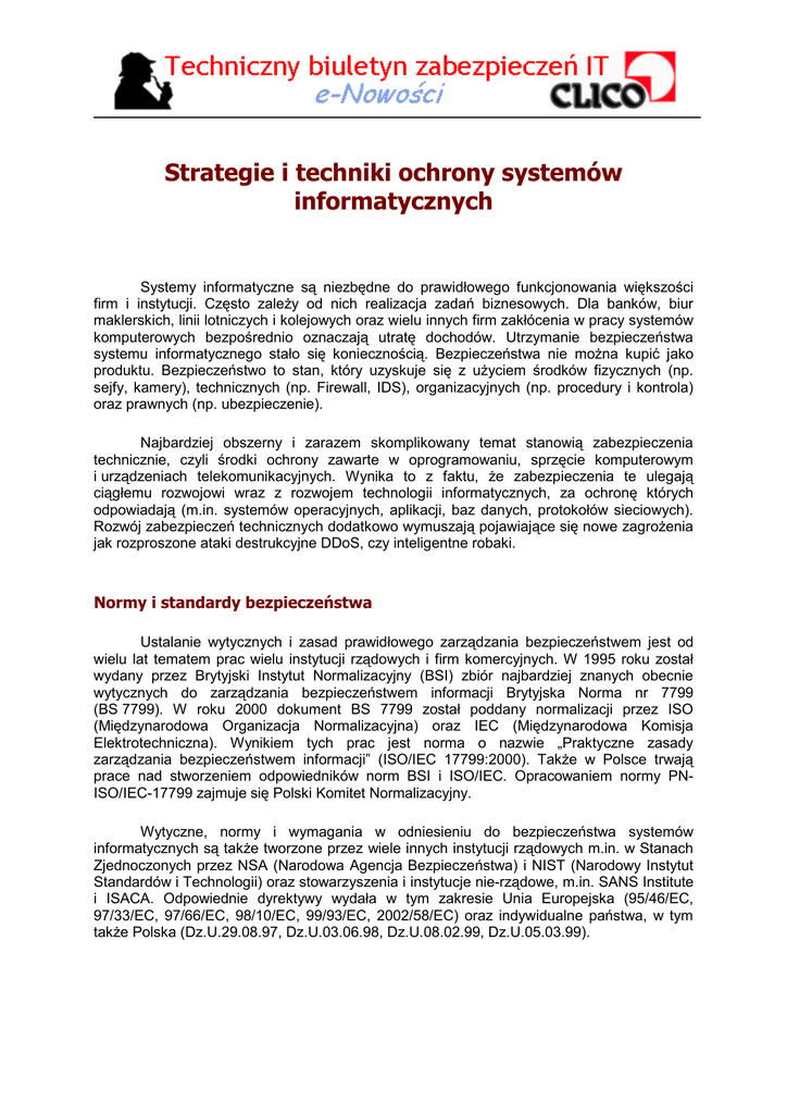 Strategie i techniki ochrony systemów informatycznych Systemy informatyczne są niezbędne do prawidłowego funkcjonowania większości firm i instytucji. Często zależy od nich realizacja zadań biznesowych. Dla banków, biur maklerskich, linii lotniczych i kolejowych oraz wielu innych firm zakłócenia w pracy systemów komputerowych bezpośrednio oznaczają utratę dochodów. Utrzymanie bezpieczeństwa systemu informatycznego stało się koniecznością. Bezpieczeństwa nie można kupić jako produktu. Bezpieczeństwo to stan, który uzyskuje się z użyciem środków fizycznych (np. sejfy, kamery), technicznych (np. Firewall, IDS), organizacyjnych (np. procedury i kontrola) oraz prawnych (np. ubezpieczenie). Najbardziej obszerny i zarazem skomplikowany temat stanowią zabezpieczenia technicznie, czyli środki ochrony zawarte w oprogramowaniu, sprzęcie komputerowym i urządzeniach telekomunikacyjnych. Wynika to z faktu, że zabezpieczenia te ulegają ciągłemu rozwojowi wraz z rozwojem technologii informatycznych, za ochronę których odpowiadają (m.in. systemów operacyjnych, aplikacji, baz danych, protokołów sieciowych). Rozwój zabezpieczeń technicznych dodatkowo wymuszają pojawiające się nowe zagrożenia jak rozproszone ataki destrukcyjne DDoS, czy inteligentne robaki. Normy i standardy bezpieczeństwa Ustalanie wytycznych i zasad prawidłowego zarządzania bezpieczeństwem jest od wielu lat tematem prac wielu instytucji rządowych i firm komercyjnych. W 1995 roku został wydany przez Brytyjski Instytut Normalizacyjny (BSI) zbiór najbardziej znanych obecnie wytycznych do zarządzania bezpieczeństwem informacji Brytyjska Norma nr 7799 (BS 7799). W roku 2000 dokument BS 7799 został poddany normalizacji przez ISO (Międzynarodowa Organizacja Normalizacyjna) oraz IEC (Międzynarodowa Komisja Elektrotechniczna). Wynikiem tych prac jest norma o nazwie „Praktyczne zasady zarządzania bezpieczeństwem informacji” (ISO/IEC 17799:2000). Także w Polsce trwają prace nad stworzeniem odpowiedników norm BSI i ISO/IEC. Opracowaniem normy PNISO/IEC-17799 zajmuje się Polski Komitet Normalizacyjny. Wytyczne, normy i wymagania w odniesieniu do bezpieczeństwa systemów informatycznych są także tworzone przez wiele innych instytucji rządowych m.in. w Stanach Zjednoczonych przez NSA (Narodowa Agencja Bezpieczeństwa) i NIST (Narodowy Instytut Standardów i Technologii) oraz stowarzyszenia i instytucje nie-rządowe, m.in. SANS Institute i ISACA. Odpowiednie dyrektywy wydała w tym zakresie Unia Europejska (95/46/EC, 97/33/EC, 97/66/EC, 98/10/EC, 99/93/EC, 2002/58/EC) oraz indywidualne państwa, w tym także Polska (Dz.U.29.08.97, Dz.U.03.06.98, Dz.U.08.02.99, Dz.U.05.03.99). Strategie i techniki ochrony systemów informatycznych Strategie ochrony Istnieją dwie wiodące strategie ochrony systemów informatycznych. Pierwsza, tradycyjna strategia opiera się na analizie ryzyka. Druga strategia ma charakter bardziej praktyczny. Wychodzi ona z założenia, że nadużycia bezpieczeństwa w systemach informatycznych są nieuniknione (np. ataki wirusów, włamania) i należy odpowiednio przygotować się do ich obsługi. Analiza ryzyka identyfikuje obszary systemu informatycznego, gdzie wymagane jest wprowadzenia zabezpieczeń. Przy czym zabezpieczenia powinny być zastosowane w pierwszej kolejności do ochrony zasobów stanowiących największą wartość dla instytucji oraz tych zasobów, dla których istnieje duże zagrożenie i które są na to zagrożenie podatne. W zakresie zabezpieczeń technicznych podstawowym dokumentem w tym zakresie jest RFC 2196 o nazwie „Site Security Handbook”. Rys 1) Zarządzanie bezpieczeństwem systemu informatycznego wg metodyki SKiP Popularna strategia ochrony, oparta na metodach praktycznych to Security Knowledge in Practice (SKiP). Jest ona rozwinięciem ogólnej strategii bezpieczeństwa "Defense in Depth" w zakresie zabezpieczeń technicznych. Została opracowana przez CERT i współpracujących z tą instytucją specjalistów. SKiP zakłada, iż należy przygotować się do właściwej obsługi nadużyć bezpieczeństwa, które nieuchronnie kiedyś wystąpią. Proces zarządzania bezpieczeństwem rozpoczyna się od analizy i wzmocnienia istniejących w systemie informatycznym środków bezpieczeństwa. W pierwszej kolejności należy wzmocnić systemy operacyjne i aplikacje, czyli elementy będące najczęściej obiektem ataków. Następnie należy przygotować się na określone zdarzenia (m.in. analizować nowe zagrożenia i podatności), monitorować system w celu ich wykrywania, sprawnie obsługiwać incydenty i poprawiać zabezpieczenia, aby się nie powtórzyły (patrz rysunek 1). Zintegrowane systemy zabezpieczeń Zabezpieczenia techniczne systemu informatycznego można umownie podzielić na warstwy ochrony, które w poprawnie zaprojektowanym systemie uzupełniają i ubezpieczają się wzajemnie. Do podstawowych warstw ochrony można zaliczyć: • warstwa zabezpieczeń systemu operacyjnego, • warstwa zabezpieczeń systemu bazy danych, • warstwa zabezpieczeń aplikacji, • warstwa zabezpieczeń sieciowych. © 2003 CLICO SP. Z O.O. WSZELKIE PRAWA ZASTRZEŻONE 2 Strategie i techniki ochrony systemów informatycznych Każda z w/w warstw ochrony spełnia istotne, specyficzne dla siebie zadania. Poziom bezpieczeństwa zasobów systemu informatycznego zależy od stanu i prawidłowego współdziałania wszystkich warstw ochrony. Zabezpieczenia różnych warstw powinny być ze sobą logicznie powiązane tak, aby ewentualne braki występujące w jednej warstwie zostały uzupełnione przez zabezpieczenia innych warstw. Dla przykładu, podatność serwera WWW na określony atak Exploit może zostać ukryta przed intruzem za pomocą odpowiednio skonfigurowanego systemu zaporowego Firewall, który zablokuje wszystkie nadchodzące z Internetu zapytania HTTP, zawierające wzorzec tego ataku (np. odpowiednio skonfigurowany dobrej klasy Firewall 