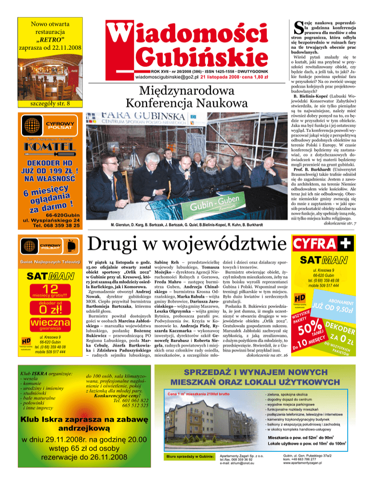 S Nowo otwarta restauracja „RETRO” zaprasza od 22.11.2008 szczegóły str. 8 Międzynarodowa Konferencja Naukowa M. Gierstun, D. Karg, B. Bartczak, J. Bartczak, G. Quiel, B.Bielinis-Kopeć, R. Kuhn, B. Burkhardt Drugi w województwie Świat Najlepszych Telewizji SAT Telewizja wysokiej rozdzielczości ul. Kresowa 9 66-620 Gubin tel. (0 68) 359 48 08 mobile 509 517 444 Klub ISKRA organizuje: - wesela - komunie - urodziny i imieniny - studniówki - bale maturalne - połowinki i inne imprezy W piątek 14 listopada o godz. 15.00 oficjalnie otwarty został obiekt sportowy „Orlik 2012” w Gubinie przy ul. Kresowej, który jest szansą dla młodzieży osiedla Barlickiego, jak i Komorowa. Zgromadzenie otworzył Andrzej Nowak, dyrektor gubińskiego MOS. Ciepło przywitał burmistrza Bartłomieja Bartczaka, któremu udzielił głosu. Burmistrz powitał dostojnych gości w osobach Marcina Jabłońskiego – marszałka województwa lubuskiego, posłankę Bożennę Bukiewicz – przewodniczącą PO Regionu Lubuskiego, posła Marka Cebulę, Józefa Bartkowiaka i Zdzisława Paduszyńskiego – radnych sejmiku lubuskiego, do 100 osób, sala klimatyzowana, profesjonalne nagłośnienie i oświetlenie, pokój z łazienką dla młodej pary. Konkurencyjne ceny! Tel. 601 061 822 665 512 525 Klub Iskra zaprasza na zabawę andrzejkową w dniu 29.11.2008r. na godzinę 20.00 wstęp 65 zł od osoby rezerwacje do 26.11.2008 Sabinę Reh – przedstawicielkę wojewody lubuskiego, Tomasza Możejko – dyrektora Agencji Nieruchomości Rolnych z Gorzowa, Freda Mahro – zastępcę burmistrza Guben, Andrzeja Chinalskiego – burmistrza Krosna Odrzańskiego, Marka Babula – wójta gminy Bobrowice, Dariusza Jarocińskiego – wójta gminy Maszewo, Leszka Olgrzymka – wójta gminy Bytnica, proboszcza parafii pw. Podwyższenia św. Krzyża w Komorowie ks. Andrzeja Pielę, Ryszarda Kaczmarka – wykonawcę inwestycji, dyrektorów szkół Genowefę Barabasz i Roberta Siegela, radnych powiatowych i miejskich oraz członków rady osiedla, mieszkańców, a szczególnie mło- dzież i dzieci oraz działaczy sportowych i trenerów. Burmistrz otwierając obiekt, życzył młodym mieszkańcom, żeby na tym boisku wyrośli reprezentanci Gubina i Polski. Wspominał swoje treningi piłkarskie w tym miejscu. Było dużo kwiatów i serdecznych gratulacji. Posłanka B. Bukiewicz powiedziała, że jest dumna, iż mogła uczestniczyć w otwarciu drugiego w województwie obiektu „Orlik 2012”. Gratulowała gospodarzom sukcesu. Marszałek Jabłoński zachwycał się szybkością, z jaką zrealizowano, z dużym pożytkiem dla młodzieży, to przedsięwzięcie. Stwierdził, że z Gubina powinni brać przykład inni. dokończenie na str. 16 esję naukową poprzedziła godzinna konferencja prasowa dla mediów z obu stron pogranicza, która odbyła się bezpośrednio w ruinach fary na tle trwających obecnie prac budowlanych. Wśród pytań znalazły się te o kształt, jaki ma przybrać w przyszłości rewitalizowany obiekt, czy będzie dach, a jeśli tak, to jaki? Jakie funkcje powinna spełniać fara w przyszłości? Na co zwrócić uwagę podczas kolejnych prac projektowobudowlanych? B. Bielinis-Kopeć (Lubuski Wojewódzki Konserwator Zabytków) stwierdziła, że nie tylko pieniądze są tu najważniejsze, należy mieć również dobry pomysł na to, co będzie w przyszłości w tym obiekcie. Jaka ma być funkcja i jej ostateczny wygląd. Ta konferencja pozwoli wypracować jakąś wizję z perspektywą odbudowy podobnych obiektów na terenie Polski i Europy. W czasie konferencji będziemy się zastanawiać, co z dotychczasowych doświadczeń w tej materii będziemy mogli przenieść na grunt gubiński. Prof. B. Burkhardt (Uniwersytet Braunschweig) także trafnie odniósł się do zagadnienia: Jestem z zawodu architektem, na terenie Niemiec odbudowałem wiele kościołów. Ale teraz już ich nie odbudowuję. Obecnie niemieckie gminy zwracają się do mnie z zapytaniem - w jaki sposób przekształcić obiekty sakralne na nowe funkcje, aby spełniały inną rolę, niż tylko miejsca kultu religijnego. dokończenie str. 7 SAT ul. Kresowa 9 66-620 Gubin tel. (0 68) 359 48 08 mobile 509 517 444 Telewizja wysokiej rozdzielczości Miasto i okolice Urodzenia Dawid Nowak, Michał Aleksandrowicz, Norbert Płóciennik, Oliwia Michalak, Filip Szcześniewicz, Szymon Gusztyn. Zgony Jan Lasota l. 74, Helena Bielaszewska l. 82, Antoni Kużownik l. 61, Marcin Florczak l. 34, Franciszek Piasecki l. 82, Antoni Subocz l. 85, Marianna Żelichowska l. 83. Z okazji Dnia Pracownika Socjalnego Wszystkim pracownikom gubińskich instytucji i placówek, które zajmują się pracą społeczną, życzymy wytrwałości i dużo satysfakcji płynącej z wykonywanej pracy Redakcja „Wiadomości Gubińskich” KOMUNIKAT PUM Przedsiębiorstwo Usług Miejskich Sp. Z o.o. w Gubinie informuje odbiorców usług świadczonych przez PUM, iż zaleganie z opłatami za te usługi powyżej dwóch miesięcy spowoduje przerwanie ich świadczenia. Wiąże się to ze wstrzymaniem dostawy wody i odbioru ścieków oraz zaprzestanie wywozu nieczystości stałych. Ponowne rozpoczęcie tych świadczeń wiązać się będzie z poniesieniem dodatkowych kosztów. wiceprezes Leszek Linda Apel do byłych żołnierzy Już minęło sześć lat, jak zniesiony został wojskowy garnizon gubiński, jeden z nielicznych, gdzie stacjonowało wiele jednostek wojskowych, m. in. od 1951 do 1957r. 19. Dywizji Pancernej, 1957-1988 r. 5.Dywizji Pancernej i 5.Dywizji Zmechanizowanej, a 1998-2002 5.Brygady Zmechanizowanej. W 2002 r garnizon został zniesiony. Tu też, w Gubinie i Guben, odbyła się 22 sierpnia 1998 r. pierwsza w historii wojska, wspólna przysięga żołnierzy Wojska Polskiego 73. Pułku Zmechanizowanego Ułanów Karpackich i żołnierzy Bundeswehry. Zacierają się już fakty, odchodzą ludzie, niszczeją dokumenty. Chcąc je odtworzyć, zbieram materiały do opracowania historii tych dywiz