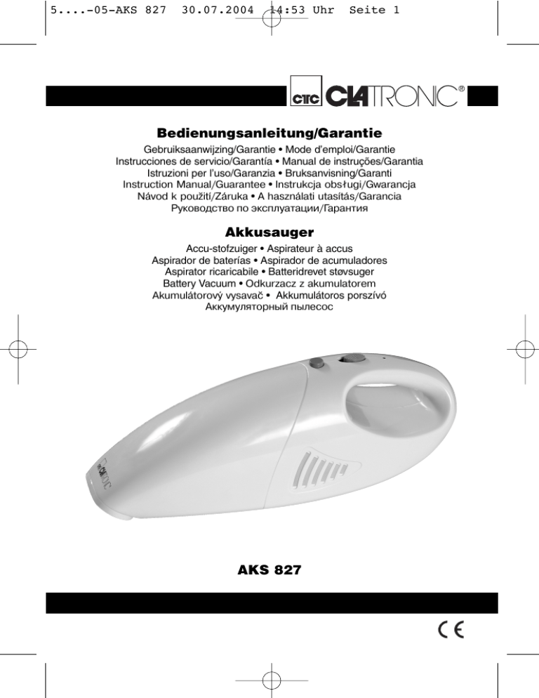 5....-05-AKS 827 30.07.2004 14:53 Uhr Seite 1 Bedienungsanleitung/Garantie Gebruiksaanwijzing/Garantie • Mode d’emploi/Garantie Instrucciones de servicio/Garantía • Manual de instruções/Garantia Istruzioni per l’uso/Garanzia • Bruksanvisning/Garanti Instruction Manual/Guarantee • Instrukcja obsługi/Gwarancja Návod k použití/Záruka • A használati utasítás/Garancia Руководство по эксплуатации/Гарантия Akkusauger Accu-stofzuiger • Aspirateur à accus Aspirador de baterías • Aspirador de acumuladores Aspirator ricaricabile • Batteridrevet støvsuger Battery Vacuum • Odkurzacz z akumulatorem Akumulátorový vysavač • Akkumulátoros porszívó Аккумуляторный пылесос AKS 827 5....-05-AKS 827 30.07.2004 14:53 Uhr Seite 2 Inhalt D NL F E P I N GB PL CZ H RUS Inhoud • Sommaire • Indice • Índice • Indice • Innhold Contents • Spis treści • Obsah • Tartalom • Содержание Übersicht Bedienelemente . . . . . . . . . . . . . . . . . . . . . . . . . . . .Seite Bedienungsanleitung . . . . . . . . . . . . . . . . . . . . . . . . . . . . . . . .Seite Garantie . . . . . . . . . . . . . . . . . . . . . . . . . . . . . . . . . . . . . . . . . .Seite Overzicht bedieningselementen . . . . . . . . . . . . . . . . . . . . . . . .Pagina Gebruiksaanwijzing . . . . . . . . . . . . . . . . . . . . . . . . . . . . . . . . .Pagina Garantie . . . . . . . . . . . . . . . . . . . . . . . . . . . . . . . . . . . . . . . . . .Pagina Aperçu des éléments de commande . . . . . . . . . . . . . . . . . . . .Page Mode d’emploi . . . . . . . . . . . . . . . . . . . . . . . . . . . . . . . . . . . . .Page Garantie . . . . . . . . . . . . . . . . . . . . . . . . . . . . . . . . . . . . . . . . . .Page Vista de conjunto Elementos de mando . . . . . . . . . . . . . . . . .Página Instrucciones de servicio . . . . . . . . . . . . . . . . . . . . . . . . . . . . .Página Garantia . . . . . . . . . . . . . . . . . . . . . . . . . . . . . . . . . . . . . . . . . .Página Vista geral dos elemntos de comando . . . . . . . . . . . . . . . . . .Página Manual de instruções . . . . . . . . . . . . . . . . . . . . . . . . . . . . . . . .Página Garantía . . . . . . . . . . . . . . . . . . . . . . . . . . . . . . . . . . . . . . . . . .Página Descrizione dei singoli pezzi . . . . . . . . . . . . . . . . . . . . . . . . .Pagina Istruzioni per l’uso . . . . . . . . . . . . . . . . . . . . . . . . . . . . . . . . . .Pagina Garanzia . . . . . . . . . . . . . . . . . . . . . . . . . . . . . . . . . . . . . .Pagina Oversikt over betjeningselementer . . . . . . . . . . . . . . . . . . . . . .Side Bruksanvisning . . . . . . . . . . . . . . . . . . . . . . . . . . . . . . . . . . . . .Side Garanti . . . . . . . . . . . . . . . . . . . . . . . . . . . . . . . . . . . . . . . . . . .Side Control element overview . . . . . . . . . . . . . . . . . . . . . . . . . . . . .Page Instruction Manual . . . . . . . . . . . . . . . . . . . . . . . . . . . . . . . . . .Page Guarantee . . . . . . . . . . . . . . . . . . . . . . . . . . . . . . . . . . . . . . . .Page Przegląd elemetów obsługi . . . . . . . . . . . . . . . . . . . . . . . . . .Strona Instrukcja obsługi . . . . . . . . . . . . . . . . . . . . . . . . . . . . . . . . . .Strona Gwarancja . . . . . . . . . . . . . . . . . . . . . . . . . . . . . . . . . . . . .Strona Přehled obsluhovací prvky . . . . . . . . . . . . . . . . . . . . . . . . . . .Strana Návod k použití . . . . . . . . . . . . . . . . . . . . . . . . . . . . . . . . . . . .Strana Záruka . . . . . . . . . . . . . . . . . . . . . . . . . . . . . . . . . . . . . . .Strana A hasznalt elemek megtekintése . . . . . . . . . . . . . . . . . . . . . .Oldal A hasznalati utasítás . . . . . . . . . . . . . . . . . . . . . . . . . . . . . . . .Oldal Garancia . . . . . . . . . . . . . . . . . . . . . . . . . . . . . . . . . . . . . . . . . .Oldal Обзор управляющих элементов . . . . . . . . . . . . . . . . . . . . .стр. Руководство по эксплуатации . . . . . . . . . . . . . . . . . . . . . . .стр. Гарантия . . . . . . . . . . . . . . . . . . . . . . . . . . . . . . . . . . . . . . . . . . .стр. 3 4 6 3 7 9 3 10 12 3 13 15 3 17 19 3 21 23 3 25 27 3 28 30 3 31 33 3 35 37 3 38 40 3 41 43 5....-05-AKS 827 30.07.2004 14:53 Uhr Seite 3 Bedienelemente 1 Arretierung Staubbehälter 2 Lade-Kontrolleuchte 3 Ein/Aus-Schalter 4 Ansaugöffnung 5 Wandhalterung 6 Akku’s 7 Akkufachdeckel 3 5....-05-AKS 827 30.07.2004 14:53 Uhr Seite 4 Allgemeine Sicherheitshinweise D • • • • • • • • • Lesen Sie vor Inbetriebnahme dieses Gerätes die Bedienungsanleitung sehr sorgfältig durch und bewahren Sie diese inkl. Garantieschein, Kassenbon und nach Möglichkeit den Karton mit Innenverpackung gut auf. Benutzen Sie das Gerät ausschließlich für den privaten und den dafür vorgesehenen Zweck. Dieses Gerät ist nicht für den gewerblichen Gebrauch bestimmt. Benutzen Sie es nicht im Freien (außer es ist für den bedingten Einsatz im Freien vorgesehen). Halten Sie es vor Hitze, direkter Sonneneinstrahlung, Feuchtigkeit (auf keinen Fall in Flüssigkeiten tauchen) und scharfen Kanten fern. Benutzen Sie das Gerät nicht mit feuchten Händen. Bei feucht oder nass gewordenem Gerät sofort den Netzstecker ziehen. Nicht ins Wasser greifen. Schalten Sie das Gerät aus und ziehen Sie immer den Stecker aus der Steckdose (ziehen Sie am Stecker, nicht am Kabel) wenn Sie das Gerät nicht benutzen, Zubehörteile anbringen, zur Reinigung oder bei Störung. Betreiben Sie das Gerät nicht unbeaufsichtigt. Sollten Sie den Arbeitsplatz verlassen, schalten Sie das Gerät bitte immer aus, bzw. ziehen Sie den Stecker aus der Steckdose (ziehen Sie am Stecker, nicht am Kabel). Um Kinder vor Gefahren elektrischer Geräte zu schützen, sorgen Sie bitte dafür, dass das Kabel nicht herunter