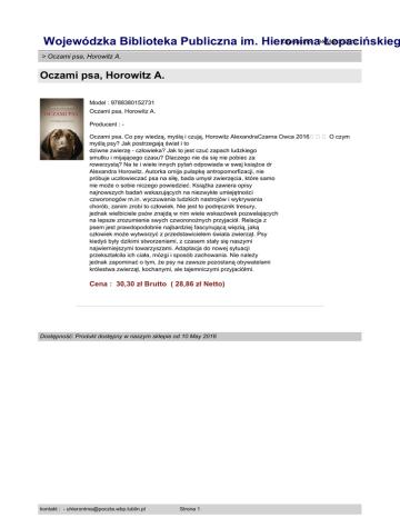 Utworzono : 04Łopacińskieg March 2017 Wojewódzka Biblioteka Publiczna im. Hieronima > Oczami psa, Horowitz A. Oczami psa, Horowitz A. Model : 9788380152731 Oczami psa, Horowitz A. Producent : Oczami psa, Co psy wiedzą, myślą i czują, Horowitz AlexandraCzarna Owca 2016��� O czym myślą psy? Jak postrzegają świat i to dziwne zwierzę - człowieka? Jak to jest czuć zapach ludzkiego smutku i mijającego czasu? Dlaczego nie da się nie pobiec za rowerzystą? Na te i wiele innych pytań odpowiada w swej książce dr Alexandra Horowitz. Autorka omija pułapkę antropomorfizacji, nie próbuje uczłowieczać psa na siłę, bada umysł zwierzęcia, które samo nie może o sobie niczego powiedzieć. Książka zawiera opisy najnowszych badań wskazujących na niezwykłe umiejętności czworonogów m.in. wyczuwania ludzkich nastrojów i wykrywania chorób, zanim zrobi to człowiek. Nie jest to podręcznik tresury, jednak wielbiciele psów znajdą w nim wiele wskazówek pozwalających na lepsze zrozumienie swych czworonożnych przyjaciół. Relacja z psem jest prawdopodobnie najbardziej fascynującą więzią, jaką człowiek może wytworzyć z przedstawicielem świata zwierząt. Psy kiedyś były dzikimi stworzeniami, z czasem stały się naszymi najwierniejszymi towarzyszami. Adaptacja do nowej sytuacji przekształciła ich ciała, mózgi i sposób zachowania. Nie należy jednak zapominać o tym, że psy na zawsze pozostaną obywatelami królestwa zwierząt, kochanymi, ale tajemniczymi przyjaciółmi. Cena : 30,30 zł Brutto ( 28,86 zł Netto) Dostępność: Produkt dostępny w naszym sklepie od 10 May 2016 kontakt : - [email protected] Strona 1