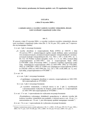 Tekst ustawy przekazany do Senatu zgodnie z art. 52 regulaminu Sejmu USTAWA z dnia 23 stycznia 2009 r. o zmianie ustawy o wyrobie i rozlewie wyrobów winiarskich, obrocie tymi wyrobami i organizacji rynku wina Art. 1. W ustawie z dnia 22 stycznia 2004 r. o wyrobie i rozlewie wyrobów winiarskich, obrocie tymi wyrobami i organizacji rynku wina (Dz. U. Nr 34, poz. 292, z późn. zm.1)) wprowadza się następujące zmiany: 1) w art. 3 pkt 2 otrzymuje brzmienie: „2) wyroby określone w rozporządzeniu Rady (EWG) nr 1601/91 z dnia 10 czerwca 1991 r. ustanawiającym ogólne zasady definicji, opisu i prezentacji win aromatyzowanych, aromatyzowanych napojów winopochodnych i aromatyzowanych koktajli winopodobnych (Dz. Urz. WE L 149 z 14.06.1991, str. 1; Dz. Urz. UE Polskie wydanie specjalne, rozdz. 3, t. 11, str. 286), zwanym dalej „rozporządzeniem nr 1601/1991”, oraz w rozporządzeniu Rady (WE) nr 479/2008 z dnia 29 kwietnia 2008 r. w sprawie wspólnej organizacji rynku wina, zmieniającym rozporządzenia (WE) nr 1493/1999, (WE) nr 1782/2003, (WE) nr 1290/2005 i (WE) nr 3/2008 oraz uchylającym rozporządzenia (EWG) nr 2392/86 i (WE) nr 1493/1999 (Dz. Urz. UE L 148 z 6.06.2008, str. 1), zwanym dalej „rozporządzeniem nr 479/2008”.”; 2) w art. 14: a) w ust. 2 pkt 1 otrzymuje brzmienie: „1) spełniające wymagania określone w ustawie, rozporządzeniu nr 1601/1991 lub rozporządzeniu nr 479/2008;”, b) w ust. 3 pkt 2 otrzymuje brzmienie: „2) wyrobów winiarskich, o których mowa w art. 3 pkt 2, wyrobionych z przeznaczeniem wyłącznie na eksport, jeżeli wynika to z rozporządzenia nr 1601/1991 lub rozporządzenia nr 479/2008.”; 3) w art. 17 w ust. 1 wprowadzenie do wyliczenia otrzymuje brzmienie: „Przedsiębiorca wykonujący działalność gospodarczą w zakresie wyrobu lub rozlewu wyrobów winiarskich oraz podmiot, o którym mowa w art. 16 ust. 3, z zastrzeżeniem art. 17a ust. 1, jest obowiązany spełniać następujące warunki:”; 4) w art. 17a w ust. 1 wprowadzenie do wyliczenia otrzymuje brzmienie: 1) Zmiany wymienionej ustawy zostały ogłoszone w Dz. U. z 2004 r. Nr 96, poz. 959 i Nr 173, poz. 1808, z 2006 r. Nr 171, poz. 1225 i Nr 208, poz. 1541, z 2008 r. Nr 145, poz. 915 oraz z 2009 r. Nr 3, poz. 11. 2 „Podmiot, o którym mowa w art. 16 ust. 3, który na podstawie art. 47 ust. 1 pkt 2 ustawy z dnia 6 grudnia 2008 r. o podatku akcyzowym (Dz. U. z 2009 r. Nr 3, poz. 11) nie podlega obowiązkowi produkcji wina gronowego w składzie podatkowym, jest obowiązany spełniać następujące warunki:”; 5) art. 23 otrzymuje brzmienie: „Art. 23. 1. Do wyrobu wina gronowego przeznaczonego do obrotu używa się wyłącznie winogron zebranych z krzewów odmian winorośli sklasyfikowanych jako odmiany winorośli przeznaczone do wyrobu wina gronowego, co najmniej w jednym z państw członkowskich Unii Europejskiej, które na podstawie art. 24 rozporządzenia nr 479/2008 dokonało takiej klasyfikacji odmian winorośli. 2. W przypadku przekroczenia wielkości produkcji wina, o której mowa w art. 24 ust. 2 rozporządzenia nr 479/2008, minister właściwy do spraw rynków rolnych określi, w drodze rozporządzenia, odmiany winorośli przeznaczone do uprawy w celu pozyskiwania winogron do wyrobu win gronowych, uwzględniając odmiany winorośli, które mogą być sklasyfikowane zgodnie z wymaganiami określonymi w art. 24 rozporządzenia nr 479/2008."; 6) w art. 24 ust. 3 otrzymuje brzmienie: „3. Wyniki kontroli, o której mowa w ust. 1, Główny Inspektor Ochrony Roślin i Nasiennictwa przekazuje ministrowi właściwemu do spraw rynków rolnych w terminie do dnia 15 października każdego roku.”; 7) w art. 25 ust. 1 otrzymuje brzmienie: „1. W razie stwierdzenia prowadzenia uprawy odmian winorośli innych niż określone w art. 23 ust. 1, przeznaczonej do pozyskiwania winogron do wyrobu wina gronowego przeznaczonego do obrotu, wojewódzki inspektor ochrony roślin i nasiennictwa, właściwy ze względu na miejsce prowadzenia uprawy winorośli, wydaje decyzję w sprawie usunięcia tych odmian winorośli z powierzchni uprawy.”; 8) w art. 26: a) ust. 1 i 2 otrzymują brzmienie: „1. Wyrób wina gronowego lub moszczu gronowego z winogron pozyskiwanych z upraw winorośli położonych na terytorium Rzeczypospolitej Polskiej, przeznaczonych do obrotu, wymaga zgłoszenia Prezesowi Agencji Rynku Rolnego, zwanemu dalej „Prezesem Agencji”, przez podmiot dokonujący tych czynności. 2. Zgłoszenia, o którym mowa w ust. 1, dokonuje się w formie pisemnej na każdy rok winiarski, w rozumieniu ust. 1 załącznika nr I do rozporządzenia nr 479/2008, zwany dalej „rokiem gospodarczym” w którym będzie prowadzony wyrób wina gronowego lub moszczu gronowego, objętych tym zgłoszeniem – nie później niż do dnia rozpoczęcia roku gospodarczego.”, b) ust. 5 otrzymuje brzmienie: „5. Prezes Agencji prowadzi ewidencję podmiotów, które dokonały zgłoszenia, o którym mowa w ust. 1, oraz kontroluje spełnianie wymagań, o których 3 mowa w art. 17a ust. 2, w trybie i na zasadach określonych dla czynności sprawdzających w ustawie z dnia 11 marca 2004 r. o Agencji Rynku Rolnego i organizacji niektórych rynków rolnych (Dz. U. z 2007 r. Nr 231, poz. 1702 oraz z 2008 r. Nr 227, poz. 1505).”, c) ust. 7 i 8 otrzymują brzmienie: „7. Prezes Agencji: 1) skreśla z ewidencji podmiot wyrabiający wino gronowe lub moszcz gronowy, o których mowa w ust. 1: a) w przypadku niedokonania przez podmiot zgłoszenia na następny rok gospodarczy lub b) w razie stwierdzenia w wyniku przeprowadzonej kontroli, o której mowa w ust. 5, że podmiot nie spełnia wymagań, o których mowa w art. 17a ust. 2, oraz 2) przekazuje wojewódzkiemu inspektorowi jakości handlowej artykułów rolno-spożywczych, właściwemu ze względu na miejsce zamieszkania lub siedzibę tego podmiotu: a) informację o dokonanym skreśleniu, b) kopie wszystkich deklaracji, o których mowa w art. 27a ust. 1, zło