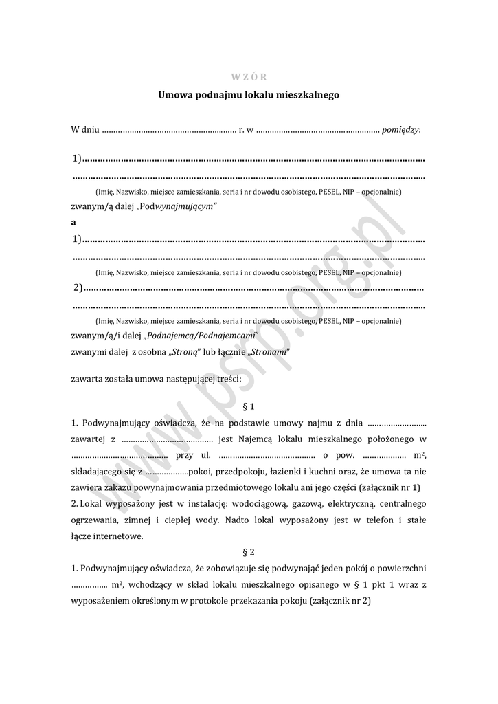 WZÓR Umowa podnajmu lokalu mieszkalnego W dniu ……………………………………………..…… r. w ……………………………………………… pomiędzy: 1)……………………………………………………………………………………………………………………. ……………………………………………………………………………………………………………………….. (Imię, Nazwisko, miejsce zamieszkania, seria i nr dowodu osobistego, PESEL, NIP – opcjonalnie) zwanym/ą dalej „Podwynajmującym” a 1)……………………………………………………………………………………………………………………. ……………………………………………………………………………………………………………………….. (Imię, Nazwisko, miejsce zamieszkania, seria i nr dowodu osobistego, PESEL, NIP – opcjonalnie) 2)…………………………………………………………………………………………………………………… ……………………………………………………………………………………………………………………….. (Imię, Nazwisko, miejsce zamieszkania, seria i nr dowodu osobistego, PESEL, NIP – opcjonalnie) zwanym/ą/i dalej „Podnajemcą/Podnajemcami” zwanymi dalej z osobna „Stroną” lub łącznie „Stronami” zawarta została umowa następującej treści: §1 1. Podwynajmujący oświadcza, że na podstawie umowy najmu z dnia …………………….. zawartej z …………………………………. jest Najemcą lokalu mieszkalnego położonego w …………………………………… przy ul. …………………………………… o pow. ………………. m2, składającego się z ……………….pokoi, przedpokoju, łazienki i kuchni oraz, że umowa ta nie zawiera zakazu powynajmowania przedmiotowego lokalu ani jego części (załącznik nr 1) 2. Lokal wyposażony jest w instalację: wodociągową, gazową, elektryczną, centralnego ogrzewania, zimnej i ciepłej wody. Nadto lokal wyposażony jest w telefon i stałe łącze internetowe. §2 1. Podwynajmujący oświadcza, że zobowiązuje się podwynająć jeden pokój o powierzchni ……………. m2, wchodzący w skład lokalu mieszkalnego opisanego w § 1 pkt 1 wraz z wyposażeniem określonym w protokole przekazania pokoju (załącznik nr 2) 2. Podwynajmujący zobowiązuje się zapewnić Podnajemcy możliwość korzystania z pozostałych części lokalu mieszkalnego tj. przedpokój, łazienka z WC, kuchnia. §3 Podnajemca oświadcza, że będzie wykorzystywał podnajęty pokój na własne cele mieszkaniowe. §4 1. Podnajemca zobowiązuje się do zapłaty Podwynajmującemu czynszu w wysokości ………………….. (słownie: …………………….…) zł miesięcznie. (opcjonalnie)2. Na okres wakacyjny tj. miesiące lipiec – wrzesień, w sytuacji nie korzystania z przedmiotu najmu, Najemca zobowiązuje się do zapłaty obniżonego czynszu stanowiącego ½ kwoty określonej w § poprzedzającym. 3. Czynsz będzie płatny z góry w terminie do ………………………….. każdego miesiąca. §5 Ponajemca poza zapłatą czynszu określonego w §4 pkt 1 umowy, zobowiązuje się dokonywać w …………… (np. w 1/2 )wszelkich opłat wynikających z eksploatacji mieszkania tj. opłat za wodę, gaz, c.o. i energię elektryczną. (należy uzgodnić czy np. woda bądź c.o. nie wchodzi w skład czynszu) Albo W czynszu o którym mowa w §4 pkt zawarte są wszystkie opłaty eksploatacyjne, w szczególności opłaty tj. za wodę, gaz, c.o. i energię elektryczną, Internet (należy uzgodnić, które opłaty wchodzą w skład czynszu §6 1. Jeżeli w czasie trwania umowy nastąpi, z przyczyn niezależnych od Podwynajmującego istotna zmiana stawek, opłat lub zmian okoliczności mających wpływ na wysokość czynszu, Podwynajmujący zawiadomi Podnajemcę o okolicznościach uzasadniających zmianę wysokości stawki czynszu i stawek opłat dodatkowych. 2. Podwynajmujący zawiadomi Podnajemcę o okolicznościach o których mowa w pkt. 1, a Podnajemca po wyrażeniu zgody, w terminie 7 dni od daty zawiadomienia, zobowiązuje się płacić czynsz i opłaty dodatkowe od następnego miesiąca rozliczeniowego w zmienionej wysokości. 3. W przypadku niewyrażenia zgody o której mowa w pkt. 2, Podwynajmujący ma prawo wypowiedzieć umowę z zachowanie 2 miesięcznego terminu wypowiedzenia. §7 Podnajemca nie może bez zgody Podwynajmującego dokonywać zmian w podnajętym pokoju. §8 Umowa zostaje zawarta na czas nieoznaczony, nie dłużej niż do chwili rozwiązania umowy o której mowa w §1 pkt 1. ewentualnie Umowa zostaje zawarta na czas od ……………… do …………… . §9 Wydanie lokalu Najemcy nastąpi w dniu ………………………. §10 W kwestii wypowiedzenia niniejszej umowy zastosowanie mają przepisy ustawy z dnia 23 kwietnia 1964 r. Kodeks cywilny (Dz.U. 1964 nr 16 poz. 93) oraz ustawy z 21 czerwca 2001 r. o ochronie praw lokatorów, mieszkaniowym zasobie gminy i o zmianie Kodeksu cywilnego (Dz.U. 2001 nr 71 poz. 733). § 11 Po ustaniu stosunku najmu Podnajemca zobowiązany jest zwrócić lokal Podwynajmującemu w stanie niepogorszonym. § 12 Dla zabezpieczenia roszczeń Podwynajmującego z tytułu czynszu najmu oraz z tytułu naprawienia ewentualnych szkód – Podnajemca wpłaca kaucję w wysokości ……………….. (słownie: …………………………..…..……) zł, co Podwynajmujący, w niniejszej umowie, potwierdza. § 13 W sprawach nieuregulowanych umową zastosowanie mają przepisy ustawy z dnia 23 kwietnia 1964 r. Kodeks cywilny (Dz.U. 1964 nr 16 poz. 93) oraz ustawy z 21 czerwca 2001 r. o ochronie praw lokatorów, mieszkaniowym zasobie gminy i o zmianie Kodeksu cywilnego (Dz.U. 2001 nr 71 poz. 733). § 14 Wszelkie zmiany niniejszej umowy wymagają maga fo