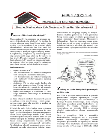 Gazetka Studenckiego Koła Naukowego Menedżer Nieruchomości PCZ Program „Mieszkanie dla młodych” Na początku 2014 r. rozpoczął się program rządowy „Mieszkanie dla młodych”. Na dopłatę do wkładu własnego może liczyć każda osoba, która spełnia kryterium wiekowe i nie posiadała nigdy nieruchomości. Mieszkanie lub dom musi być w cenie mieszczącej się w określonym limicie, co okazuje się w praktyce najpoważniejszą barierą. Kredytobiorcy, którym uda się znaleźć odpowiednią nieruchomość mogą udać się do banków po taki kredyt. Dopłata w ramach programu „Mieszkanie dla młodych” umożliwia otrzymanie kredytu osobom, które bez tego zostałyby odrzucone przez bank, z uwagi na brak środków własnych. samodzielnie nie otrzymają dopłaty do kredytu. Pomoc z budżetu państwa ma w tym przypadku formę zwrotu części wydatków poniesionych na zakup materiałów budowlanych. Ministerstwo Infrastruktury i Rozwoju bierze pod uwagę nowelizację ustawy tak by został rozwiązany problem z dopłatami do tych mieszkań, dla których ceny nie są ustalone z góry przez spółdzielnie mieszkaniowe. Źródło: http://euro.bankier.pl, http://wiosennyprzedswit.pl/programmdm/program-mdm/ Iwona Kościańska Dofinansowanie: dopłata do max 50 m2, 10% dofinansowania do wkładu własnego dla osób samotnych i małżeństw bez dzieci, 15% dofinansowania do wkładu własnego dla osób i małżeństw wychowujących co najmniej jedno dziecko, dodatkowe 5% na spłatę części kredytu dla tych osób, którym w ciągu 5 lat od dnia zakupu nieruchomości, urodzi się lub zostanie przysposobione trzecie lub kolejne dziecko, dopłata naliczana jest w odniesieniu do średniego wskaźnika określonego dla konkretnej lokalizacji. Za brak własnych środków finansowych ponosi się jednak pewne konsekwencje - marże proponowane przez banki dla kredytów z dopłatą są wyższe niż standardowe. Z kolei dla osób, które budują dom systemem gospodarczym w projekcie „Mieszkanie dla młodych”, przewidziano pomoc innego typu - poprzez zwrot części zapłaconego podatku VAT. Zwrot wydatków poniesionych na budowę domu nie jest niestety dostępny dla każdego, gdyż ustawa regulująca zasady przyznawania wsparcia określa szczegółowo grono potencjalnych adresatów. W odróżnieniu od osób kupujących gotowe nieruchomości na rynku pierwotnym, budujący domy Zmiany na rynku kredytów hipotecznych od 2014 roku Rok 2014 to początek ważnych zmian w systemie przyznawania kredytów hipotecznych. Zaczęły obowiązywać zalecenia tzw. Rekomendacji S Komisji Nadzoru Finansowego, które dotyczą obowiązku posiadania przez kredytobiorcę co najmniej 5% wkładu własnego. Zmiany wprowadzone od początku 2014 r. dotyczą również maksymalnego okresu przyznawania kredytów. Wraz z początkiem 2014 r. wszystkich kredytobiorców starających się o przyznanie kredytu hipotecznego obowiązuje zasada związana z posiadaniem co najmniej 5% wkładu własnego. Przez trzy kolejne lata udział ten będzie rosnąć co roku o 5%, z czego w 2017 roku wkład 1 własny będzie musiał wynosić 20% ceny nieruchomości. Wymóg ten wskazuje, że instytucje finansowe skłaniają się preferowania klientów rzetelnych i odpowiedzialnych, którzy posiadają kontrolę nad swoimi finansami i zmniejszają prawdopodobieństwo wpadnięcia w kłopoty finansowe związane z niemożliwością spłaty kredytu w przyszłości. Zmiany dotyczą również długości okresu kredytowania i tu od początku 2014 r. zaczął skracać się maksymalny okres kredytowania. Do końca 2013 r. wynosił on w ekstremalnych przypadkach nawet 50 lat, a obecnie nie może przekroczyć 35 lat określa. Bieżący 2014 rok przyniósł także dobre informacje dla kredytobiorców, gdyż korzystniejsze stały się zasady wyliczania zdolności kredytowej. Oznacza to wydłużenie z 25 do 30 lat okresu przeliczania zdolności do spłaty kredytu o określonej wysokości. Dzięki tej zmianie klient może otrzymać środki o wartości wyższej niż dotychczas o około 10%. Co więcej, zniesiono odgórne ograniczenia odnoszące się do faktu, iż rata kredytowa nie może przekraczać 50% osiąganych dochodów. Obecnie każdy bank będzie wprowadzać własne regulacje. Można przypuszczać, że wysokość tego wskaźnika będzie się zmieniać na korzyść klientów. Paulina Prysak Ubezpieczenie nieruchomości Polacy rzadko korzystają z możliwości ubezpieczenia własnego majątku. A zatem czy warto się ubezpieczyć i od czego zależy wysokość składki na ubezpieczenie nieruchomości? Koszt ubezpieczenia nieruchomości zależy od wielu czynników m.in. od zakresu polisy oraz wysokości sumy ubezpieczenia. Na wysokości składki ubezpieczeniowej mają wpływ różnego rodzaju zniżki i zwyżki. Głównym czynnikiem stanowiącym o wysokości stawki jest wartość nieruchomości. Ubezpieczając się od ryzyka kradzieży warto określić sumę nie tyle całego dobytku, ale wartość ruchomości, które w pierwszej kolejności mogą paść łupem złodziei np. sprzęt AGD-RTV, biżuteria itp. Zniżki otrzymuje się za posiadanie zabezpieczeń takich jak: system alarmowy, zamki, drzwi z atestami/antywłamaniowe, nadzorowanie nieruchomości przez agencję ochrony. Ulgę uzyskamy też wtedy, gdy wykupuje się większą ilość ubezpieczeń np. AutoCasco, mieszkania i zdrowotne. Jeśli składkę ubezpieczeniową zapłaci się jednorazowo, a nie w kilku okresowych ratach to będzie on mniejsza. Im wyższa suma ubezpieczenia, tym większa cena polisy. Jeśli dotąd miejsca nie miała żadna szkoda i ubezpieczamy się już któryś raz z kolei to można zapłacić mniej za polisę nieruchomości. Istotną rolę odgrywa również czas trwania ubezpieczenia. Jeśli w domu lub mieszkaniu prowadzona jest działalność gospodarcza albo wynajmuje się własną nieruchomość, to trzeba się liczyć ze zwyżkami w składce ubezpieczeniowej. Takie wzrosty sk