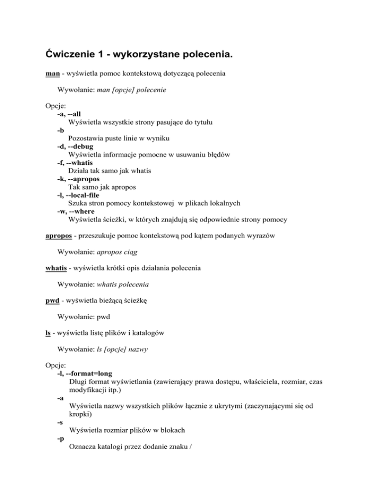 Ćwiczenie 1 - wykorzystane polecenia.