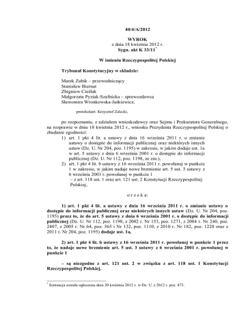 40/4/A/2012 WYROK z dnia 18 kwietnia 2012 r. Sygn. akt K 33/11 * W imieniu Rzeczypospolitej Polskiej Trybunał Konstytucyjny w składzie: Marek Zubik – przewodniczący Stanisław Biernat Zbigniew Cieślak Małgorzata Pyziak-Szafnicka – sprawozdawca Sławomira Wronkowska-Jaśkiewicz, protokolant: Krzysztof Zalecki, po rozpoznaniu, z udziałem wnioskodawcy oraz Sejmu i Prokuratora Generalnego, na rozprawie w dniu 18 kwietnia 2012 r., wniosku Prezydenta Rzeczypospolitej Polskiej o zbadanie zgodności: 1) art. 1 pkt 4 lit. a ustawy z dnia 16 września 2011 r. o zmianie ustawy o dostępie do informacji publicznej oraz niektórych innych ustaw (Dz. U. Nr 204, poz. 1195) w zakresie, w jakim dodaje ust. 1a w art. 5 ustawy z dnia 6 września 2001 r. o dostępie do informacji publicznej (Dz. U. Nr 112, poz. 1198, ze zm.), 2) art. 1 pkt 4 lit. b ustawy z 16 września 2011 r. powołanej w punkcie 1 w zakresie, w jakim nadaje nowe brzmienie art. 5 ust. 3 ustawy z 6 września 2001 r. powołanej w punkcie 1 – z art. 118 ust. 1 oraz art. 121 ust. 2 Konstytucji Rzeczypospolitej Polskiej, o r z e k a: 1) art. 1 pkt 4 lit. a ustawy z dnia 16 września 2011 r. o zmianie ustawy o dostępie do informacji publicznej oraz niektórych innych ustaw (Dz. U. Nr 204, poz. 1195) przez to, że do art. 5 ustawy z dnia 6 września 2001 r. o dostępie do informacji publicznej (Dz. U. Nr 112, poz. 1198, z 2002 r. Nr 153, poz. 1271, z 2004 r. Nr 240, poz. 2407, z 2005 r. Nr 64, poz. 565 i Nr 132, poz. 1110, z 2010 r. Nr 182, poz. 1228 oraz z 2011 r. Nr 204, poz. 1195) dodaje ust. 1a, 2) art. 1 pkt 4 lit. b ustawy z 16 września 2011 r. powołanej w punkcie 1 przez to, że nadaje nowe brzmienie art. 5 ust. 3 ustawy z 6 września 2001 r. powołanej w punkcie 1 – są niezgodne z art. 121 ust. 2 w związku z art. 118 ust. 1 Konstytucji Rzeczypospolitej Polskiej. * Sentencja została ogłoszona dnia 30 kwietnia 2012 r. w Dz. U. z 2012 r. poz. 473. 2 UZASADNIENIE I 1. Pismem z 29 września 2011 r. Prezydent Rzeczypospolitej Polskiej (dalej: Prezydent, wnioskodawca) wystąpił do Trybunału Konstytucyjnego z wnioskiem o zbadanie zgodności: 1) art. 1 pkt 4 lit. a ustawy z dnia 16 września 2011 r. o zmianie ustawy o dostępie do informacji publicznej oraz niektórych innych ustaw (Dz. U. Nr 204, poz. 1195; dalej: ustawa zmieniająca) w zakresie, w jakim dodaje ust. 1a do art. 5 zmienianej ustawy z dnia 6 września 2001 r. o dostępie do informacji publicznej (Dz. U. Nr 112, poz. 1198, ze zm.; dalej: ustawa informacyjna) oraz 2) art. 1 pkt 4 lit. b ustawy zmieniającej w zakresie, w jakim nadaje nowe brzmienie art. 5 ust. 3 ustawy informacyjnej – z art. 118 ust. 1 oraz art. 121 ust. 2 Konstytucji. W uzasadnieniu wniosku Prezydent podniósł, że projekt ustawy zmieniającej został skierowany do Sejmu w trybie pilnym, w celu wypełnienia zobowiązań traktatowych Rzeczypospolitej (implementacji dyrektywy 2003/98/WE Parlamentu Europejskiego i Rady z dnia 17 listopada 2003 r. w sprawie ponownego wykorzystywania informacji sektora publicznego, Dz. Urz. UE L 345 z 31.12.2003, s. 90; dalej: dyrektywa), których uchybienie stało się przyczyną wszczęcia przeciwko Polsce postępowania przed Trybunałem Sprawiedliwości Wspólnot Europejskich (C-362/10). Prezydent przedstawił skrótowo najważniejsze postanowienia ustawy zmieniającej, odpowiadające celowi zainicjowanej przez Radę Ministrów nowelizacji, a następnie przypomniał przebieg procesu legislacyjnego. Zwrócił uwagę, że w trakcie prac prowadzonych w Sejmie zrezygnowano z ustanowienia odrębnej kategorii ograniczenia dostępu do informacji publicznej, jaką wprowadzał zawarty w projekcie rządowym przepis art. 1 pkt 6. Zgodnie z tym przepisem do ustawy informacyjnej dodawano art. 5a, przewidujący, że prawo do informacji podlega ograniczeniu – w odniesieniu do wymienionych w nim dokumentów oraz przez pewien ustalony czas – ze względu na ochronę porządku, bezpieczeństwa publicznego oraz ważnego interesu gospodarczego państwa. Przepis ten został zakwestionowany w opinii sporządzonej dla Biura Analiz Sejmowych na etapie rozpatrywania projektu w Sejmie, podczas pierwszego czytania. W efekcie sprawozdanie podkomisji rozpatrującej projekt (druk sejmowy nr 4434, VI kadencja) pominęło już regulację proponowaną w art. 1 pkt 6 pierwotnego projektu. Ostatecznie uchwalona przez Sejm 31 sierpnia 2011 r. ustawa zmieniająca ustawę informacyjną nie zawierała więc regulacji dotyczącej ograniczenia dostępu do informacji publicznej. Uchwałą z 14 września 2011 r. Senat wprowadził do ustawy poprawkę, która zmierzała do przywrócenia istoty regulacji zawartej w przepisie art. 5a rządowego projektu ustawy zmieniającej. Prezydent zwrócił uwagę, że w toku obrad nad poprawkami senackimi Biuro Legislacyjne Sejmu wskazało wątpliwości konstytucyjne dotyczące zakresu tej poprawki a sejmowa Komisja Administracji i Spraw Wewnętrznych rekomendowała Sejmowi jej odrzucenie. Sejm, na posiedzeniu 16 września 2011 r., przyjął jednak ustawę wraz z poprawką. Wnioskodawca wyraził przekonanie, że intencją projektodawców poprawki była ochrona ważnego interesu gospodarczego państwa, a więc wartości konstytucyjnej. W konsekwencji, nie zakwestionował treści dodanych przepisów, lecz sposób ich wprowadzenia. Przywołując stanowisko doktryny i orzecznictwo Trybunału Konstytucyjnego, Prezydent stwierdził, że tworzenie prawa jest aktywnością organów państwa, która wkracza w sferę wolności i praw człowieka. Z tego względu niezbędne jest, by aktywność ta następowała w ramach proceduralnych określonych w Konstytucji. Z jej art. 118 ust. 1 i art. 121 ust. 2 wynika, że poprawki senackie muszą być dokonywane w taki 3 sposób, by nie dochodziło do zatarcia odrębności między nimi a inicjatywą ustawodawczą. Prezydent podkreślił, że przedmiot prac senackich jest wyznaczony wyłącznie ustawą uchwaloną przez Sejm. Senat wnos