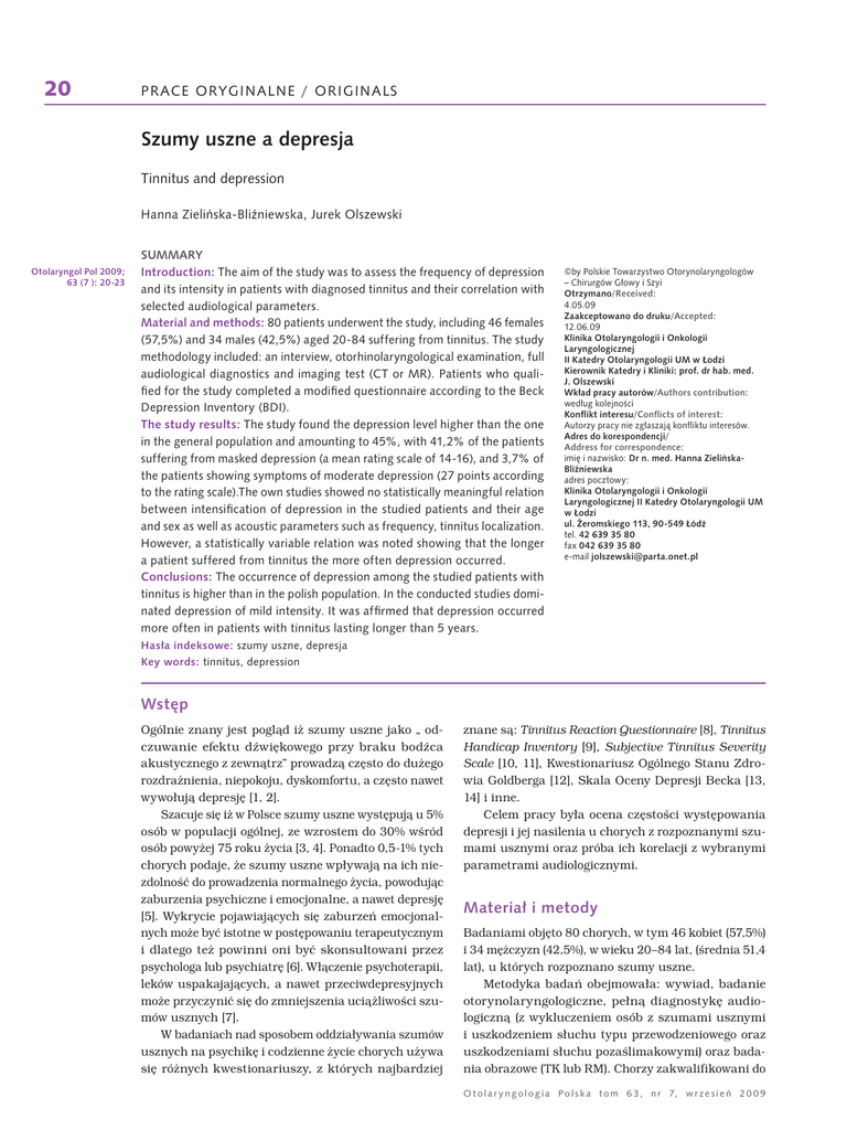 20 PRACE ORYGINALNE / ORIGINALS Szumy uszne a depresja Tinnitus and depression Hanna Zielińska-Bliźniewska, Jurek Olszewski Otolaryngol Pol 2009; 63 (7 ): 20-23 SUMMARY Introduction: The aim of the study was to assess the frequency of depression and its intensity in patients with diagnosed tinnitus and their correlation with selected audiological parameters. Material and methods: 80 patients underwent the study, including 46 females (57,5%) and 34 males (42,5%) aged 20-84 suffering from tinnitus. The study methodology included: an interview, otorhinolaryngological examination, full audiological diagnostics and imaging test (CT or MR). Patients who qualified for the study completed a modified questionnaire according to the Beck Depression Inventory (BDI). The study results: The study found the depression level higher than the one in the general population and amounting to 45%, with 41,2% of the patients suffering from masked depression (a mean rating scale of 14-16), and 3,7% of the patients showing symptoms of moderate depression (27 points according to the rating scale).The own studies showed no statistically meaningful relation between intensification of depression in the studied patients and their age and sex as well as acoustic parameters such as frequency, tinnitus localization. However, a statistically variable relation was noted showing that the longer a patient suffered from tinnitus the more often depression occurred. Conclusions: The occurrence of depression among the studied patients with tinnitus is higher than in the polish population. In the conducted studies dominated depression of mild intensity. It was affirmed that depression occurred more often in patients with tinnitus lasting longer than 5 years. ©by Polskie Towarzystwo Otorynolaryngologów – Chirurgów Głowy i Szyi Otrzymano/Received: 4.05.09 Zaakceptowano do druku/Accepted: 12.06.09 Klinika Otolaryngologii i Onkologii Laryngologicznej II Katedry Otolaryngologii UM w Łodzi Kierownik Katedry i Kliniki: prof. dr hab. med. J. Olszewski Wkład pracy autorów/Authors contribution: według kolejności Konflikt interesu/Conflicts of interest: Autorzy pracy nie zgłaszają konfliktu interesów. Adres do korespondencji/ Address for correspondence: imię i nazwisko: Dr n. med. Hanna ZielińskaBliźniewska adres pocztowy: Klinika Otolaryngologii i Onkologii Laryngologicznej II Katedry Otolaryngologii UM w Łodzi ul. Żeromskiego 113, 90-549 Łódź tel. 42 639 35 80 fax 042 639 35 80 e-mail [email protected] Hasła indeksowe: szumy uszne, depresja Key words: tinnitus, depression Wstęp Ogólnie znany jest pogląd iż szumy uszne jako „ odczuwanie efektu dźwiękowego przy braku bodźca akustycznego z zewnątrz” prowadzą często do dużego rozdrażnienia, niepokoju, dyskomfortu, a często nawet wywołują depresję [1, 2]. Szacuje się iż w Polsce szumy uszne występują u 5% osób w populacji ogólnej, ze wzrostem do 30% wśród osób powyżej 75 roku życia [3, 4]. Ponadto 0,5-1% tych chorych podaje, że szumy uszne wpływają na ich niezdolność do prowadzenia normalnego życia, powodując zaburzenia psychiczne i emocjonalne, a nawet depresję [5]. Wykrycie pojawiających się zaburzeń emocjonalnych może być istotne w postępowaniu terapeutycznym i dlatego też powinni oni być skonsultowani przez psychologa lub psychiatrę [6]. Włączenie psychoterapii, leków uspakajających, a nawet przeciwdepresyjnych może przyczynić się do zmniejszenia uciążliwości szumów usznych [7]. W badaniach nad sposobem oddziaływania szumów usznych na psychikę i codzienne życie chorych używa się różnych kwestionariuszy, z których najbardziej znane są: Tinnitus Reaction Questionnaire [8], Tinnitus Handicap Inventory [9], Subjective Tinnitus Severity Scale [10, 11], Kwestionariusz Ogólnego Stanu Zdrowia Goldberga [12], Skala Oceny Depresji Becka [13, 14] i inne. Celem pracy była ocena częstości występowania depresji i jej nasilenia u chorych z rozpoznanymi szumami usznymi oraz próba ich korelacji z wybranymi parametrami audiologicznymi. Materiał i metody Badaniami objęto 80 chorych, w tym 46 kobiet (57,5%) i 34 mężczyzn (42,5%), w wieku 20–84 lat, (średnia 51,4 lat), u których rozpoznano szumy uszne. Metodyka badań obejmowała: wywiad, badanie otorynolaryngologiczne, pełną diagnostykę audiologiczną (z wykluczeniem osób z szumami usznymi i uszkodzeniem słuchu typu przewodzeniowego oraz uszkodzeniami słuchu pozaślimakowymi) oraz badania obrazowe (TK lub RM). Chorzy zakwalifikowani do O t o l a r y n g o l o g i a P o l s k a t o m 6 3 , n r 7, w r z e s i e ń 2 0 0 9 PRACE ORYGINALNE / ORIGINALS badań wypełniali zmodyfikowaną ankietę skali depresji Becka, która po raz pierwszy została opublikowana w 1961 roku i składa się z 21 punktów, ocenianych, wg intensywności objawów (od 0 do 3). Z każdego punktu badany powinien wybrać jedną odpowiedź, która jego zdaniem, w najlepszy sposób opisuje jego stan we wskazanym okresie. Poza 21 pytaniami w ankiecie uwzględniono również inne informacje dotyczące: wieku chorych, płci, dotychczasowego leczenia i lokalizacji szumów oraz ich natężenia i częstotliwości. Ocena wyników punktacji skali depresji Becka [13] przedstawia się następująco: 0–9 punktów – brak depresji, 10–18 punktów – depresja łagodna, 19–29 punktów – depresja umiarkowana, 30–63 punktów – depresja ciężka. W badaniu przyjęto następujacy zakres częstotliwości szumów usznych: niskoczęstotliwościowe 125–500 Hz, średnioczęstotliwościowe powyżej 500–1000 Hz oraz wysokoczęstotliwościowe 4000–8000 Hz. Analizę statystyczną wyników badań przeprowadzono w oparciu o następujące testy istotności: ShapiroWilka, Levene’a, jednoczynnikowej wariancji (ANOVA) bez powtórzeń, niezależności Chi2 i Fishera. Wyniki badań 35 30 30 25 20 22 15 16 12 10 5 0 jednostronne mężczyźni obustronne kobiety Ryc. 1. Występowanie szumów jed