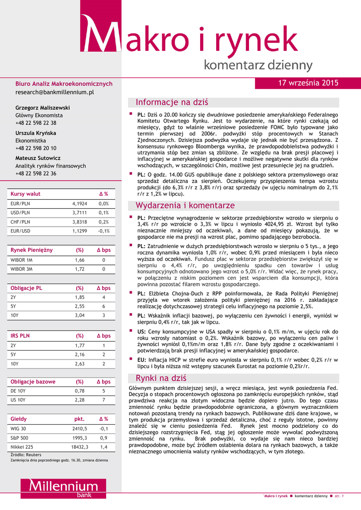17 września 2015 Biuro Analiz Makroekonomicznych [email protected] Informacje na dziś Grzegorz Maliszewski Główny Ekonomista +48 22 598 22 38 PL: Dziś o 20.00 kończy się dwudniowe posiedzenie amerykańskiego Federalnego Komitetu Otwartego Rynku. Jest to wydarzenie, na które rynki czekają od miesięcy, gdyż to właśnie wrześniowe posiedzenie FOMC było typowane jako termin pierwszej od 2006r. podwyżki stóp procentowych w Stanach Zjednoczonych. Dzisiejsza podwyżka wydaje się jednak nie być przesądzona. Z konsensusu rynkowego Bloomberga wynika, że prawdopodobieństwa podwyżki i utrzymania stóp bez zmian są zbliżone. Ze względu na brak presji płacowej i inflacyjnej w amerykańskiej gospodarce i możliwe negatywne skutki dla rynków wschodzących, w szczególności Chin, możliwe jest przesunięcie jej na grudzień. PL: O godz. 14.00 GUS opublikuje dane z polskiego sektora przemysłowego oraz sprzedaż detaliczna za sierpień. Oczekujemy przyspieszenia tempa wzrostu produkcji (do 6,3% r/r z 3,8% r/r) oraz sprzedaży (w ujęciu nominalnym do 2,1% r/r z 1,2% w lipcu). Urszula Kryńska Ekonomistka +48 22 598 20 10 Mateusz Sutowicz Analityk rynków finansowych +48 22 598 22 36 Kursy walut Δ% EUR/PLN 4,1924 0,0% USD/PLN 3,7111 0,1% CHF/PLN 3,8318 0,2% EUR/USD 1,1299 -0,1% Rynek Pieniężny (%) Δ bps WIBOR 1M 1,66 0 WIBOR 3M 1,72 0 Obligacje PL (%) Δ bps 2Y 1,85 4 5Y 2,55 6 10Y 3,04 3 IRS PLN (%) Δ bps 2Y 1,77 1 5Y 2,16 2 10Y 2,63 2 Obligacje bazowe (%) Δ bps DE 10Y 0,78 5 US 10Y 2,28 7 Giełdy pkt. Δ% WIG 30 2410,5 -0,1 S&P 500 1995,3 0,9 Nikkei 225 18432,3 1,4 Źródło: Reuters Wydarzenia i komentarze PL: Przeciętne wynagrodzenie w sektorze przedsiębiorstw wzrosło w sierpniu o 3,4% r/r po wzroście o 3,3% w lipcu i wyniosło 4024,95 zł. Wzrost był tylko nieznacznie mniejszy od oczekiwań, a dane od miesięcy pokazują, że w gospodarce nie ma presji na wzrost płac, pomimo spadającego bezrobocia. PL: Zatrudnienie w dużych przedsiębiorstwach wzrosło w sierpniu o 5 tys., a jego roczna dynamika wyniosła 1,0% r/r, wobec 0,9% przed miesiącem i była nieco wyższa od oczekiwań. Fundusz płac w sektorze przedsiębiorstw zwiększył się w sierpniu o 4,4% r/r, po uwzględnieniu spadku cen towarów i usług konsumpcyjnych odnotowano jego wzrost o 5,0% r/r. Widać więc, że rynek pracy, w połączeniu z niskim poziomem cen jest wsparciem dla konsumpcji, która powinna pozostać filarem wzrostu gospodarczego. PL: Elżbieta Chojna-Duch z RPP poinformowała, że Rada Polityki Pieniężnej przyjęła we wtorek założenia polityki pieniężnej na 2016 r. zakładające realizację dotychczasowej strategii celu inflacyjnego na poziomie 2,5%. PL: Wskaźnik inflacji bazowej, po wyłączeniu cen żywności i energii, wyniósł w sierpniu 0,4% r/r, tak jak w lipcu. US: Ceny konsumpcyjne w USA spadły w sierpniu o 0,1% m/m, w ujęciu rok do roku wzrosły natomiast o 0,2%. Wskaźnik bazowy, po wyłączeniu cen paliw i żywności wyniósł 0,1%m/m oraz 1,8% r/r. Dane były zgodne z oczekiwaniami i potwierdzają brak presji inflacyjnej w amerykańskiej gospodarce. EU: Inflacja HICP w strefie euro wyniosła w sierpniu 0,1% r/r wobec 0,2% r/r w lipcu i była niższa niż wstępny szacunek Eurostat na poziomie 0,2%r/r. Rynki na dziś Głównym punktem dzisiejszej sesji, a wręcz miesiąca, jest wynik posiedzenia Fed. Decyzja o stopach procentowych ogłoszona po zamknięciu europejskich rynków, stąd prawdziwa reakcja na złotym widoczna będzie dopiero jutro. Do tego czasu zmienność rynku będzie prawdopodobnie ograniczona, a głównym wyznacznikiem notowań pozostaną trendy na rynkach bazowych. Publikowane dziś dane krajowe, w tym produkcja przemysłowa i sprzedaż detaliczna, choć z reguły istotne, powinny znaleźć się w cieniu posiedzenia Fed. Rynek jest mocno podzielony co do dzisiejszego rozstrzygnięcia Fed, stąg jej ogłoszenie może wywołać podwyższoną zmienność na rynku. Brak podwyżki, co wydaje się nam nieco bardziej prawdopodobne, może być źródłem osłabienia dolara na rynkach bazowych, a także nieznacznego umocnienia waluty rynków wschodzących, w tym złotego. Zamknięcia dnia poprzedniego godz. 16.30, zmiana dzienna `Makro i rynek komentarz dzienny str. 1 Rynek krajowy Kursy walutowe EUR/PLN i EUR/USD 4,30 1,18 4,25 1,16 4,20 1,14 1,12 4,15 1,10 4,10 1,08 4,05 1,06 EURPLN EURUSD /prawa skala/ Środowa sesja wpisywała się w obraz wyczekiwania na dzisiejszą decyzję Fed. W ciągu dnia złoty stracił nieznacznie na wartości, choć przy niskiej płynności. Kurs EUR/PLN poruszał się w przedziale 4,1880-4,2025. Względem euro złoty ponownie notowany jest powyżej 4,20 co pokazuje brak trwałych impulsów do umocnienia polskiej waluty. Wciąż głównym wyznacznikiem nastrojów na krajowym rynku finansowym pozostają trendy na rynkach bazowych wyznaczane przez oczekiwanie na dzisiejszą decyzję Fed. Krajowe dane o wynagrodzeniach i zatrudnieniu nie miały wpływu na notowania. Za trendami na rynkach bazowych podążały też notowania polskich obligacji, które straciły nieznacznie na wartości, w ślad za zwyżkami dochodowości na bazowych rynkach długu. Straciły papiery wzdłuż całej krzywej, a wzrost rentowności mieścił się w przedziale 3-6 bps, przy czym najwięcej wzrosła rentowność 5-latek. Źródło: Reuters Rynki zagraniczne Rynek eurodolara pozostaje w atmosferze wyczekiwania na głoszenie decyzji Fed. Wczorajsza sesja przy nieco podwyższonej zmienności, nie przyniosła istotnej zmiany kursu EUR/USD, który na wczorajszym zamknięciu był notowany na poziomie 1,1280, tj. w okolicach zamknięcia ze środy. Płynność rynku pozostaje relatywnie niska, ponieważ niepewność co do wyniku posiedzenia Fed powstrzymuje inwestorów przed podejmowaniem decyzji inwestycyjnych. Na bazowych rynkach długu wzrosły rentowności papierów skarbowych. W ciągu dnia rentowność amerykańskiej 10-latki wzrosła o 7 bps, natomia