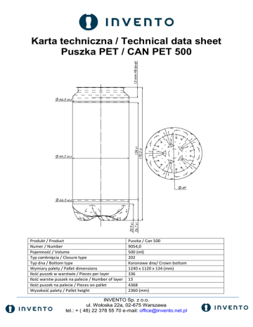 Karta techniczna / Technical data sheet Puszka PET / CAN PET 500 Produkt / Product Numer / Number Pojemność / Volume Typ zamknięcia / Closure type Typ dna / Bottom type Wymiary palety / Pallet dimensions Ilość puszek w warstwie / Pieces per layer Ilość warstw puszek na palecie / Number of layer Ilość puszek na palecie / Pieces on pallet Wysokość palety / Pallet height Puszka / Can 500 9054,0 500 (ml) 202 Koronowe dno/ Crown bottom 1240 x 1120 x 134 (mm) 336 13 4368 2360 (mm) INVENTO Sp. z o.o. ul. Wołoska 22a, 02-675 Warszawa tel.: + ( 48) 22 378 55 70 e-mail: [email protected]