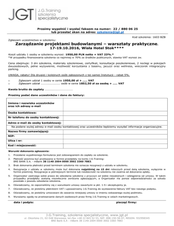 Prosimy wypełnić i wysłać faksem na numer: 22 / 880 06 25 lub przesłać skan na adres: [email protected] Kod szkolenia: 1603 BZB Zgłaszam uczestnictwo w szkoleniu: Zarządzanie projektami budowlanymi – warsztaty praktyczne. 17-19.10.2016, Wisła Hotel Stok**** Koszt udziału 1 osoby w szkoleniu wynosi: 1950,00 PLN netto + VAT 23%.* *W przypadku finansowania szkolenia co najmniej w 70% ze środków publicznych, stawka VAT wynosi zw. Cena obejmuje: 3 dni szkolenia, materiały szkoleniowe, certyfikat, konsultacje poszkoleniowe, 2 noclegi w pokojach dwuosobowych, pełne wyżywienie, możliwość korzystania z basenu, jacuzzi oraz wellness, wieczorek integracyjny parking. UWAGA, rabaty! Dla drugiej i kolejnych osób zgłoszonych z tej samej Instytucji - rabat 5%. □ □ Zgłaszam udział 1 osoby w cenie 1950,00 zł + ….. VAT Zgłaszam udział ……………………… osób w cenie 1852,50 zł za osobę + ….. VAT Kwota brutto do zapłaty ………………………………… Prosimy podać dane uczestników i dane do faktury: Imiona i nazwiska uczestników oraz ich adresy e-mail Osoba kontaktowa: Nr telefonu do osoby kontaktowej: Adres e-mail do osoby kontaktowej: Na podane wyżej adresy e-mail osoby kontaktowej oraz uczestników będziemy wysyłać informacje organizacyjne. Nazwa firmy zamawiającej: NIP: Ulica i nr: Kod i miejscowość: Warunki dokonania zgłoszenia: 1. Przesłanie wypełnionego formularza jest zobowiązaniem do zapłaty za szkolenie. 3. Brak dokonania płatności przed terminem szkolenia nie oznacza rezygnacji z udziału w szkoleniu. 2. 4. 5. 6. 7. 8. 9. Płatność powinna być przekazana w formie przedpłaty na konto J.G.Training: BRE BANK S.A. - mBank 38 1140 2004 0000 3002 3360 7883. Rezygnacja z udziału w szkoleniu może być dokonana najpóźniej na 15 dni roboczych przed datą szkolenia, wyłącznie w formie pisemnej. Rezygnacja w późniejszym terminie lub nieobecność na szkoleniu nie zwalnia od dokonania opłaty. Organizator zastrzega sobie prawo do odwołania szkolenia z przyczyn od siebie niezależnych i odstąpienia od umowy. W takim przypadku przedpłaty zostaną niezwłocznie zwrócone zgłaszającym, a Organizator nie ponosi odpowiedzialności za szkody powstałe z powodu odwołania szkolenia. Oświadczamy, że zapoznaliśmy się z warunkami umowy zawartymi w pkt. 1-5 i akceptujemy je. Oświadczamy, że jesteśmy płatnikiem VAT i upoważniamy J.G.Training do wystawienia faktury VAT bez naszego podpisu. Oświadczamy, że jesteśmy umocowani do zawarcia niniejszej umowy w imieniu wskazanego wyżej podmiotu. Wyrażamy zgodę na przetwarzanie danych osobowych przez firmę J.G.Training w celach marketingowych. data i podpis: pieczęć firmy: J.G.Training, szkolenia specjalistyczne, www.jgt.pl ul. Olesińska 21, 02-548 Warszawa, tel./fax +48 22 845 52 53, NIP: 898-150-56-07, REGON: 932958345 BRE Bank S.A - mBank 38 1140 2004 0000 3002 3360 7883