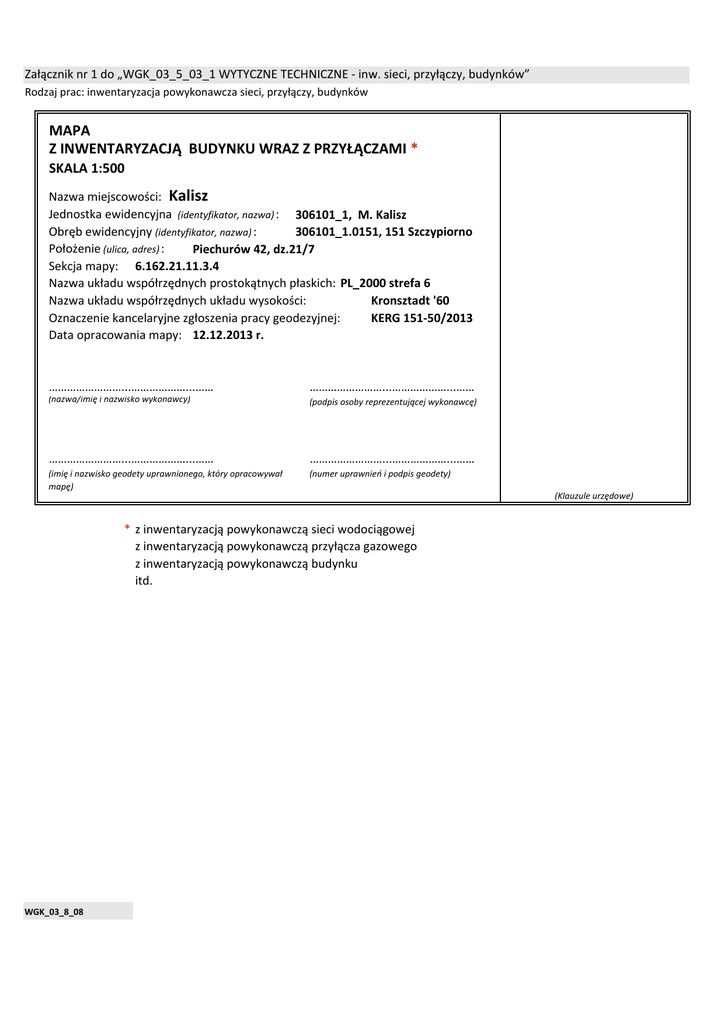 Załącznik nr 1 do „WGK_03_5_03_1 WYTYCZNE TECHNICZNE - inw. sieci, przyłączy, budynków” Rodzaj prac: inwentaryzacja powykonawcza sieci, przyłączy, budynków MAPA Z INWENTARYZACJĄ BUDYNKU WRAZ Z PRZYŁĄCZAMI * SKALA 1:500 Nazwa miejscowości: Kalisz Jednostka ewidencyjna (identyfikator, nazwa) : 306101_1, M. Kalisz Obręb ewidencyjny (identyfikator, nazwa) : 306101_1.0151, 151 Szczypiorno Położenie (ulica, adres) : Piechurów 42, dz.21/7 Sekcja mapy: 6.162.21.11.3.4 Nazwa układu współrzędnych prostokątnych płaskich: PL_2000 strefa 6 Nazwa układu współrzędnych układu wysokości: Kronsztadt '60 Oznaczenie kancelaryjne zgłoszenia pracy geodezyjnej: KERG 151-50/2013 Data opracowania mapy: 12.12.2013 r. ……………………...………………...…… ……………………...………………...…… (nazwa/imię i nazwisko wykonawcy) (podpis osoby reprezentującej wykonawcę) ……………………...………………...…… ……………………...………………...…… (imię i nazwisko geodety uprawnionego, który opracowywał mapę) (numer uprawnień i podpis geodety) (Klauzule urzędowe) * z inwentaryzacją powykonawczą sieci wodociągowej z inwentaryzacją powykonawczą przyłącza gazowego z inwentaryzacją powykonawczą budynku itd. WGK_03_8_08