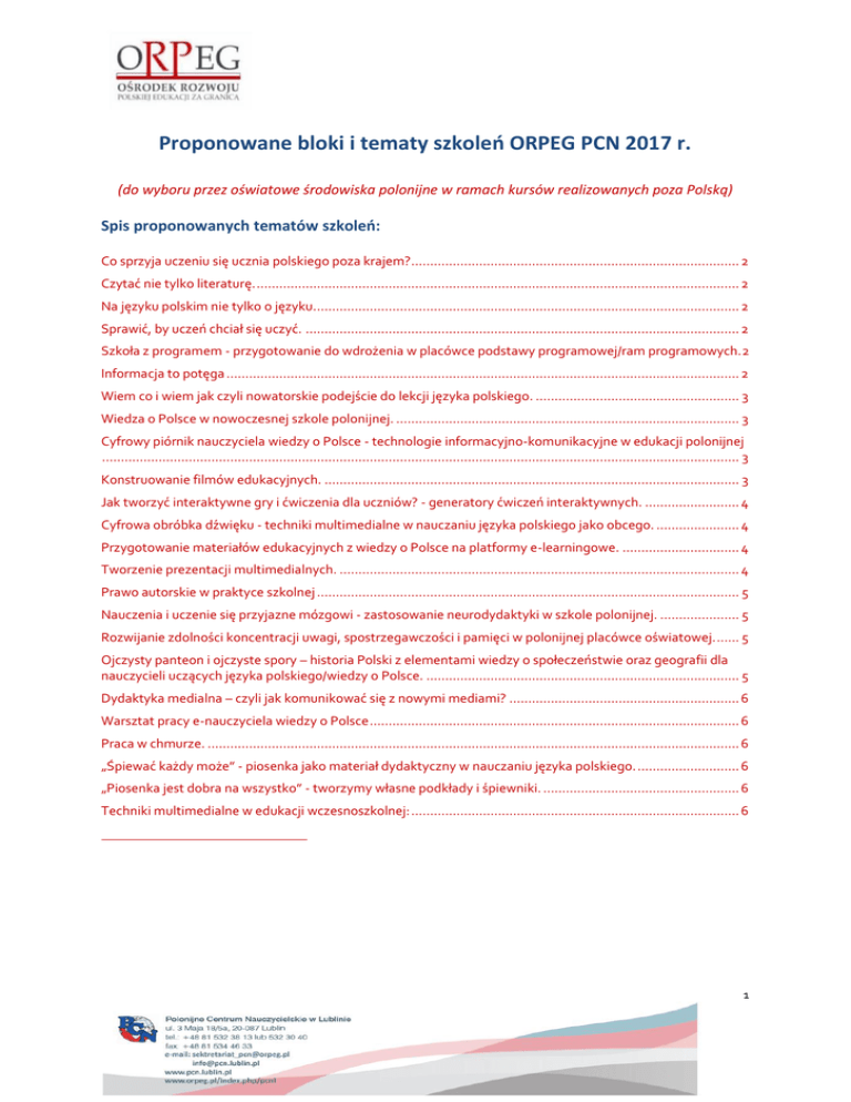 Proponowane bloki i tematy szkoleń ORPEG PCN 2017 r. (do wyboru przez oświatowe środowiska polonijne w ramach kursów realizowanych poza Polską) Spis proponowanych tematów szkoleń: Co sprzyja uczeniu się ucznia polskiego poza krajem?....................................................................................... 2 Czytać nie tylko literaturę. ................................................................................................................................ 2 Na języku polskim nie tylko o języku................................................................................................................. 2 Sprawić, by uczeń chciał się uczyć. ................................................................................................................... 2 Szkoła z programem - przygotowanie do wdrożenia w placówce podstawy programowej/ram programowych.2 Informacja to potęga ........................................................................................................................................ 2 Wiem co i wiem jak czyli nowatorskie podejście do lekcji języka polskiego. ...................................................... 3 Wiedza o Polsce w nowoczesnej szkole polonijnej. ........................................................................................... 3 Cyfrowy piórnik nauczyciela wiedzy o Polsce - technologie informacyjno-komunikacyjne w edukacji polonijnej ......................................................................................................................................................................... 3 Konstruowanie filmów edukacyjnych. .............................................................................................................. 3 Jak tworzyć interaktywne gry i ćwiczenia dla uczniów? - generatory ćwiczeń interaktywnych. ......................... 4 Cyfrowa obróbka dźwięku - techniki multimedialne w nauczaniu języka polskiego jako obcego. ...................... 4 Przygotowanie materiałów edukacyjnych z wiedzy o Polsce na platformy e-learningowe. ............................... 4 Tworzenie prezentacji multimedialnych. .......................................................................................................... 4 Prawo autorskie w praktyce szkolnej ................................................................................................................ 5 Nauczenia i uczenie się przyjazne mózgowi - zastosowanie neurodydaktyki w szkole polonijnej. ..................... 5 Rozwijanie zdolności koncentracji uwagi, spostrzegawczości i pamięci w polonijnej placówce oświatowej. ...... 5 Ojczysty panteon i ojczyste spory – historia Polski z elementami wiedzy o społeczeństwie oraz geografii dla nauczycieli uczących języka polskiego/wiedzy o Polsce. ................................................................................... 5 Dydaktyka medialna – czyli jak komunikować się z nowymi mediami? ............................................................. 6 Warsztat pracy e-nauczyciela wiedzy o Polsce .................................................................................................. 6 Praca w chmurze. ............................................................................................................................................. 6 „Śpiewać każdy może” - piosenka jako materiał dydaktyczny w nauczaniu języka polskiego. ........................... 6 „Piosenka jest dobra na wszystko” - tworzymy własne podkłady i śpiewniki. .................................................... 6 Techniki multimedialne w edukacji wczesnoszkolnej: ....................................................................................... 6 1 Co sprzyja uczeniu się ucznia polskiego poza krajem? - Rozwijanie sprawności językowych ucznia z wykorzystaniem tekstu literackiego. - Rozwijanie sprawności językowych ucznia z wykorzystaniem technik plastycznych. - Pomoce dydaktyczne wspierające doskonalenie sprawności językowych ucznia. - Projekt edukacyjny jako metoda wspierania rozwoju sprawności językowych ucznia. - Co czytać z dziećmi i dzieciom? - propozycje lektur dla dzieci w młodszych wieku szkolnym. - Jak doskonalić sprawności językowe ucznia poprzez teksty użytkowe? Czytać nie tylko literaturę. - Jak doskonalić sprawności językowe ucznia poprzez tekst literacki? - Jak motywować ucznia do mówienia poprzez czytanie obrazu? - Jak dobrać technikę pracy z uczniem adekwatną do specyfiki tekstu? - Jak doskonalić sprawności językowe ucznia poprzez teksty użytkowe. Na języku polskim nie tylko o języku. - Jak wprowadzać elementy historii i geografii Polski na lekcjach języka polskiego? - Jak wprowadzać i doskonalić pisane formy wypowiedzi? Sprawić, by uczeń chciał się uczyć. - Jak pracować w grupie uczniów o zróżnicowanym poziomie językowym? - Jak doskonalić sprawności językowe ucznia poprzez piosenkę i zabawy muzyczno-ruchowe? - Jak motywować ucznia do mówienia wykorzystując różnorodne techniki dyskusji? Szkoła z programem - przygotowanie do wdrożenia w placówce podstawy programowej/ram programowych. - Opracowanie programu nauczania w oparciu o podstawę programową/ramy programowe. - Podręczniki i pomoce dydaktyczne w nauczaniu języka polskiego dzieci w młodszym starszym wieku szkolnym. - Wiem co i wiem jak czyli nowatorskie podejście do lekcji języka polskiego. - Moi sojusznicy w uczeniu języka polskiego - jak ich znaleźć i nawiązać współpracę? - Jak konstruować zadania doskonalące sprawności językowe ucznia? Informacja to potęga - Metody efektywnego wyszukiwania informacji w sieci globalnej. - Przeszukiwanie internetu - metody, narzędzia, strategie. - Zasady pobierania zasobów multimedialnych z sieci. - Przetwarzanie materiałów pobranych z sieci. - Publikacja materiałów edukacyjnych w sieci. 2 Wiem co i wiem jak czyli nowatorskie podejście do lekcj