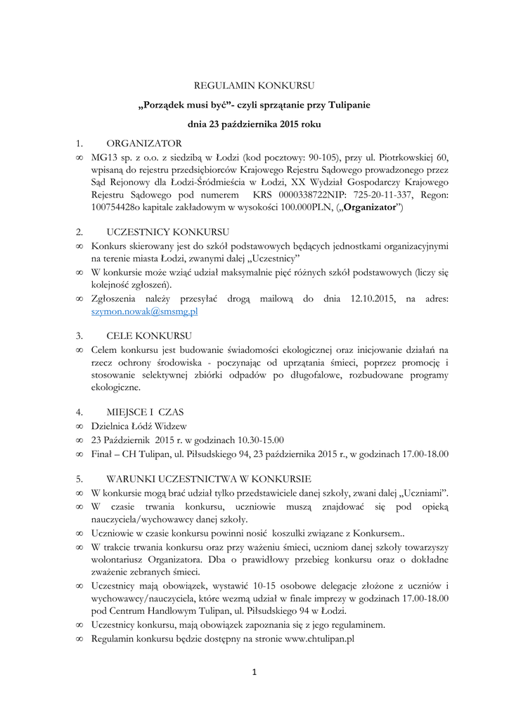 REGULAMIN KONKURSU „Porządek musi być”- czyli sprzątanie przy Tulipanie dnia 23 października 2015 roku 1. ORGANIZATOR • MG13 sp. z o.o. z siedzibą w Łodzi (kod pocztowy: 90-105), przy ul. Piotrkowskiej 60, wpisaną do rejestru przedsiębiorców Krajowego Rejestru Sądowego prowadzonego przez Sąd Rejonowy dla Łodzi-Śródmieścia w Łodzi, XX Wydział Gospodarczy Krajowego Rejestru Sądowego pod numerem KRS 0000338722NIP: 725-20-11-337, Regon: 100754428o kapitale zakładowym w wysokości 100.000PLN, („Organizator”) 2. UCZESTNICY KONKURSU • Konkurs skierowany jest do szkół podstawowych będących jednostkami organizacyjnymi na terenie miasta Łodzi, zwanymi dalej „Uczestnicy” • W konkursie może wziąć udział maksymalnie pięć różnych szkół podstawowych (liczy się kolejność zgłoszeń). • Zgłoszenia należy przesyłać drogą mailową do dnia 12.10.2015, na adres: [email protected] 3. CELE KONKURSU • Celem konkursu jest budowanie świadomości ekologicznej oraz inicjowanie działań na rzecz ochrony środowiska - poczynając od uprzątania śmieci, poprzez promocję i stosowanie selektywnej zbiórki odpadów po długofalowe, rozbudowane programy ekologiczne. 4. MIEJSCE I CZAS • Dzielnica Łódź Widzew • 23 Październik 2015 r. w godzinach 10.30-15.00 • Finał – CH Tulipan, ul. Piłsudskiego 94, 23 października 2015 r., w godzinach 17.00-18.00 5. WARUNKI UCZESTNICTWA W KONKURSIE • W konkursie mogą brać udział tylko przedstawiciele danej szkoły, zwani dalej „Uczniami”. • W czasie trwania konkursu, uczniowie muszą znajdować się pod opieką nauczyciela/wychowawcy danej szkoły. • Uczniowie w czasie konkursu powinni nosić koszulki związane z Konkursem.. • W trakcie trwania konkursu oraz przy ważeniu śmieci, uczniom danej szkoły towarzyszy wolontariusz Organizatora. Dba o prawidłowy przebieg konkursu oraz o dokładne zważenie zebranych śmieci. • Uczestnicy mają obowiązek, wystawić 10-15 osobowe delegacje złożone z uczniów i wychowawcy/nauczyciela, które wezmą udział w finale imprezy w godzinach 17.00-18.00 pod Centrum Handlowym Tulipan, ul. Piłsudskiego 94 w Łodzi. • Uczestnicy konkursu, mają obowiązek zapoznania się z jego regulaminem. • Regulamin konkursu będzie dostępny na stronie www.chtulipan.pl 1 • • • Regulamin musi być podpisany i podstemplowany przez dyrektora danej szkoły oraz odesłany jako skan wraz ze zgłoszeniem uczestnika. Zbieranie śmieci: - zbiórka śmieci odbywa się tylko w dniu konkursu ( 23 października 2015) w wyznaczonych godzinach (10.30-13.30), - w dniu konkursu, śmieciami nazywamy wszystkie przedmioty, które swobodnie mieszczą się do worka konkursowego (puszki, butelki, papiery i inne), - zabrania się wcześniejszego przynoszenia śmieci i gromadzenia ich w szkole, a następnie wrzucania ich do worków konkursowych, - zabrania się wyciągania śmieci ze śmietników publicznych w celu zwiększenia ilości zebranych śmieci w czasie konkursu, - zabrania się zbierania śmieci wielkogabarytowych (kuchenek, lodówek, dużego złomu itd. Nieprzestrzeganie przez uczestników WARUNKÓW UCZESTNICTWA W KONKURSIE, równa się z wykluczeniem z konkursu 6. SCENARIUSZ KONKURSU • Czwartek 22 października 2015 r.: - dostarczenie do szkół: koszulek, worków na śmieci, rękawic ochronnych • Piątek 23 października 2015 r.: - 10.00- Organizator przybywa do szkoły, kieruje się do sekretariatu z prośbą o pokierowanie do wyznaczonego miejsca na poczęstunek - 10.30- Organizator wyjaśnia cel akcji. Ponadto pokazuje dwa rodzaje worków i tłumaczy jakie śmieci wrzucamy do jakiego worka. Organizator rozdaje rękawiczki i koszulki. - 11.00- wyjście w teren PIERWSZEJ GRUPY/klasy i sprzątanie dzielnicy - 12.00- powrót do szkoły, przerwa na poczęstunek. Dziękujemy pierwszej grupie za udział w konkursie. - 12.00- przygotowanie drugiej grupy do wyjścia - 12.30- wyjście w teren DRUGIEJ GRUPY/klasy i sprzątanie dzielnicy - 13.30- powrót do szkoły, poczęstunek - 14.00-15.00- oficjalne ważenie śmieci. Ważenie śmieci odbywa się przy przedstawicielu danej szkoły oraz organizatora - 17.00-18.00- finał konkursu na parkingu Centrum Handlowego Tulipan w Łodzi. Uczestnicy biorący udział w konkursie, muszą wyznaczyć delegacje, złożone z 10-15 uczniów i opiekuna, jak również uczestniczyć w finale konkursu. W czasie finału zostaną wręczone nagrody. 7. PRZYZNAWANIE NAGRÓD • Pierwszą nagrodę otrzymuje Uczestnik konkursu, który wagowo zbierze najwięcej śmieci • Nagrodę pocieszenia otrzymują pozostali Uczestnicy, którzy brali udział w konkursie 8. • • • • • NAGRODY UFUNDOWANE PRZEZ ORGANIZATORA I miejsce- środki czystości o łącznej wartości 1 000 zł brutto, I miejsce- 300 cebulek tulipanów o wartości 300 zł brutto, I miejsce- Puchar Czystości, I miejsce- organizacja imprezy Karnawałowej dla uczniów, Miejsca pozostałe- Puchar Białej Rękawiczki, 2 • Miejsca pozostałe- nagrody pocieszenia (4 zestawy ogrodnicze) o łącznej wartości 400zł brutto. Nagrody, o których mowa w punkcie 8 (oprócz organizacji imprezy karnawałowej) zostaną wydane Uczestnikom zgodnie z protokołami przekazania nagród. 9. FINAŁ/WRĘCZENIE NAGRÓD • Do finału zapraszamy delegacje Uczestników konkursu, złożone z 10-15 uczniów i opiekuna • Na tydzień przed finałem w centralnej części CH Tulipan, umieszczamy Puchar Czystości z informacją o konkursie. • Finał odbędzie w Centrum Handlowym Tulipan. 3