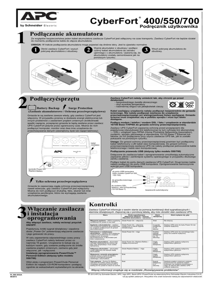 CyberFort Podręcznik 400/550/700 użytkownika 1 Podłączanie akumulatora Ze względów bezpieczeństwa jeden kabel akumulatora zasilacza CyberFort jest odłączony na czas transportu. Zasilacz CyberFort nie będzie działał do momentu podłączenia kabla do złącza akumulatora. UWAGA: W trakcie podłączania akumulatora mogą pojawiać się drobne iskry. Jest to zjawisko normalne. 1 2 2 Obróć zasilacz CyberFort i wysuń pokrywę akumulatora z obudowy. Wyjmij akumulator z obudowy i podłącz czarny kabel akumulatora do zacisku ujemnego (-) akumulatora. Upewnij się, że akumulatory zostały zamontowane jak na poniższym rysunku. Podłączyćsprzętu Battery Backup 3 Wsuń pokrywę akumulatora do obudowy. Zasilacz CyberFort należy umieścić tak, aby chronić go przed działaniem: - bezpośredniego światła słonecznego - zbyt wysokiej temperatury - nadmiernej wilgoci lub jakiejkolwiek cieczy. Surge Protection (Zasilanie akumulatorowe / Ochrona przeciwprzepięciowa) Gniazda te są zasilane zawsze wtedy, gdy zasilacz CyberFort jest włączony. W przypadku przerwy w dostawie energii elektrycznej lub innych problemów z zasilaniem prądem zmiennym (krótkotrwałe spadki napięcia, przepięcia) gniazda te będą zasilane przez zasilacz UPS CyberFort jedynie przez ograniczony czas. Można do nich podłączyć komputer, monitor oraz dwa inne urządzenia do przechowywania danych (zewnętrzny dysk lub napęd taśmowy). Kabel zasilający urządzenia należy podłączyć bezpośrednio do gniazda ściennego. Nie należy podłączać zasilacza do urządzenia przeciwprzepięciowego ani wielogniazdowej listwy zasilającej. Gniazdo ścienne musi znajdować się w pobliżu sprzętu i musi być łatwo dostępne. Podłącz modem / telefon / modem DSL / faks / urządzenie w standardzie 10/100 Base-T/HPNA do gniazda ochrony przeciwprzepięciowej. Zasilacz UPS CyberFort zapewnia ochronę przed przepięciami dla pojedynczej (dwużyłowej) linii telefonicznej (w tym cyfrowej linii abonenckiej — DSL), urządzeń typu HPNA (Home Phoneline Networking Association), modemu, sprzętu sieciowego w standardzie 10/100 Base-T Ethernet lub faksów, po ich podłączeniu przy użyciu zasilacza UPS tak, jak to zostało pokazane na poniższym rysunku. Uwaga: Do gniazd ochrony przeciwprzepięciowej powinien być podłączony kabel telefoniczny LUB kabel sieci komputerowej. Do gniazd ochrony przeciwprzepięciowej zasilacza UPS nie należy podłączać jednocześnie kabla telefonicznego i kabla sieci komputerowej. kabel zasilający Podłączanie przewodu USB (dotyczy tylko modelu 550/700) Dołączone do zasilacza kabel i oprogramowanie umożliwiają automatyczne zapisanie plików i zamknięcie systemu operacyjnego w przypadku dłuższego zaniku zasilania. Podłącz kabel do portu danych zasilacza UPS CyberFort. Drugi koniec kabla należy podłączyć do portu USB komputera. Oprogramowanie samoczynnie wykryje port USB komputera. kontrolki Power On/ Replace Battery bu365a do portu USB komputera (tylko modele CyberFort 550 i ES 700) do gniazdka ściennego (RJ45) Tylko ochrona przeciwprzepięciowa do modemu DSL, telefonu, sieci komputerowej (10/100 Base-T) Gniazda te zapewniają ciągłą ochronę przeciwprzepięciową nawet wówczas, gdy zasilacz CyberFort jest wyłączony. Można do nich podłączyć drukarkę, faks, skaner lub inne urządzenia peryferyjne, które nie wymagają zasilania akumulatorowego. 3 Włączanie zasilacza i instalacja oprogramowania Aby włączyć zasilacz, należy wcisnąć przycisk ON/OFF. Pojedynczy, krótki sygnał dźwiękowy i zapalona dioda „Power On” potwierdzają włączenie zasilacza i jego gotowość do pracy. W celu zapewnienia odpowiedniego czasu pracy zasilacz CyberFort należy ładować przez co najmniej 16 godzin. Urządzenie to ładuje się za każdym razem, gdy zostanie podłączone do źródła zasilania prądem zmiennym, zarówno gdy jest włączone, jak i wyłączone. Instalacja oprogramowania PowerChute™ Personal Edition (dotyczy tylko modelu 550/700) Włóż płytę z programem PowerChute Personal Edition do napędu CD-ROM komputera i postępuj zgodnie ze wskazówkami wyświetlanymi na ekranie. bu366a bezpiecznik automatyczny Kontrolki Zasilacz CyberFort informuje o swoim stanie za pomocą kombinacji diod sygnalizacyjnych i alarmów dźwiękowych. Zapoznaj się z poniższą tabelą, aby móc określić stan zasilacza UPS. Stanu Dioda sygnalizacyjna (Włączenie zasilania – zielona) (Wymiana akumulatora – czerwona) Alarm dźwiękowy Alarm wyłącza się, gdy: Włączenie zasilania – UPS is supplying conditioned AC power to the load. Dioda Power On – włączona Brak Nie dotyczy. Zasilanie z akumulatorów – zasilacz UPS dostarcza zasilanie akumulatorowe do urządzeń podłączonych do gniazd akumulatorowych. Dioda Power On – włączona (wyłączona w trakcie sygnału dźwiękowego) 4 sygnały dźwiękowe co 30 sekund Zasilacz UPS wróci do trybu Power On lub zostanie wyłączony. Ostrzeżenie o rozładowaniu akumulatora – zasilacz UPS dostarcza zasilanie akumulatorowe do urządzeń podłączonych do gniazd akumulatorowych, a akumulator jest bliski rozładowania. Dioda Power On – miga Szybkie sygnały dźwiękowe (co 1/2 sekundy) Zasilacz UPS wróci do normalnego trybu pracy lub zostanie wyłączony. Wymiana akumulatora – akumulator wymaga naładowania lub kończy się jego czas eksploatacji i musi zostać wymieniony. Diody Power On i Replace Battery – migają (na przemian) Ciągły sygnał dźwiękowy Zasilacz UPS zostanie wyłączony wyłącznikiem głównym. Odłączony akumulator – akumulator został odłączony lub wykryto wadę akumulatora. Dioda Replace Battery – miga Ciągły sygnał dźwiękowy Zasilacz UPS zostanie wyłączony wyłącznikiem głównym. Wyłączenie z powodu przeciążenia – podczas pracy w trybie On Battery wykryto przeciążenie gniazda zasilanego z akumulatora. Brak Ciągły sygnał dźwiękowy Zasilacz UPS zostanie wył