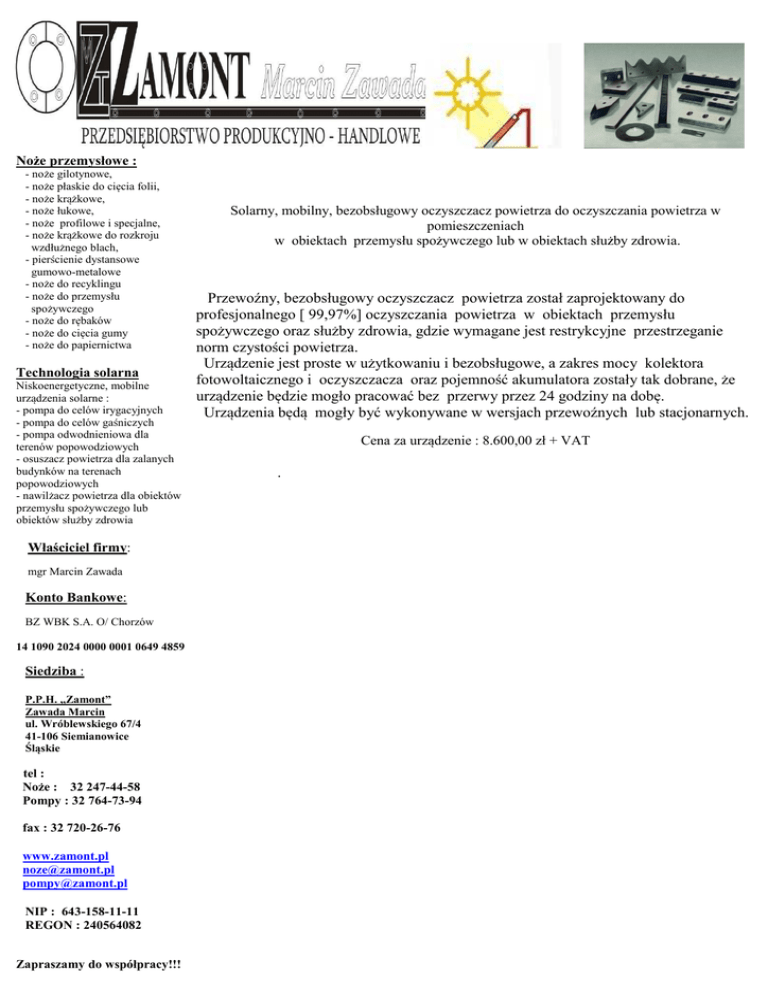 Noże przemysłowe : - noże gilotynowe, - noże płaskie do cięcia folii, - noże krążkowe, - noże łukowe, - noże profilowe i specjalne, - noże krążkowe do rozkroju wzdłużnego blach, - pierścienie dystansowe gumowo-metalowe - noże do recyklingu - noże do przemysłu spożywczego - noże do rębaków - noże do cięcia gumy - noże do papiernictwa Technologia solarna Niskoenergetyczne, mobilne urządzenia solarne : - pompa do celów irygacyjnych - pompa do celów gaśniczych - pompa odwodnieniowa dla terenów popowodziowych - osuszacz powietrza dla zalanych budynków na terenach popowodziowych - nawilżacz powietrza dla obiektów przemysłu spożywczego lub obiektów służby zdrowia Właściciel firmy: mgr Marcin Zawada Konto Bankowe: BZ WBK S.A. O/ Chorzów 14 1090 2024 0000 0001 0649 4859 Siedziba : P.P.H. „Zamont” Zawada Marcin ul. Wróblewskiego 67/4 41-106 Siemianowice Śląskie tel : Noże : 32 247-44-58 Pompy : 32 764-73-94 fax : 32 720-26-76 www.zamont.pl [email protected] [email protected] NIP : 643-158-11-11 REGON : 240564082 Zapraszamy do współpracy!!! Solarny, mobilny, bezobsługowy oczyszczacz powietrza do oczyszczania powietrza w pomieszczeniach w obiektach przemysłu spożywczego lub w obiektach służby zdrowia. Przewoźny, bezobsługowy oczyszczacz powietrza został zaprojektowany do profesjonalnego [ 99,97%] oczyszczania powietrza w obiektach przemysłu spożywczego oraz służby zdrowia, gdzie wymagane jest restrykcyjne przestrzeganie norm czystości powietrza. Urządzenie jest proste w użytkowaniu i bezobsługowe, a zakres mocy kolektora fotowoltaicznego i oczyszczacza oraz pojemność akumulatora zostały tak dobrane, że urządzenie będzie mogło pracować bez przerwy przez 24 godziny na dobę. Urządzenia będą mogły być wykonywane w wersjach przewoźnych lub stacjonarnych. Cena za urządzenie : 8.600,00 zł + VAT .