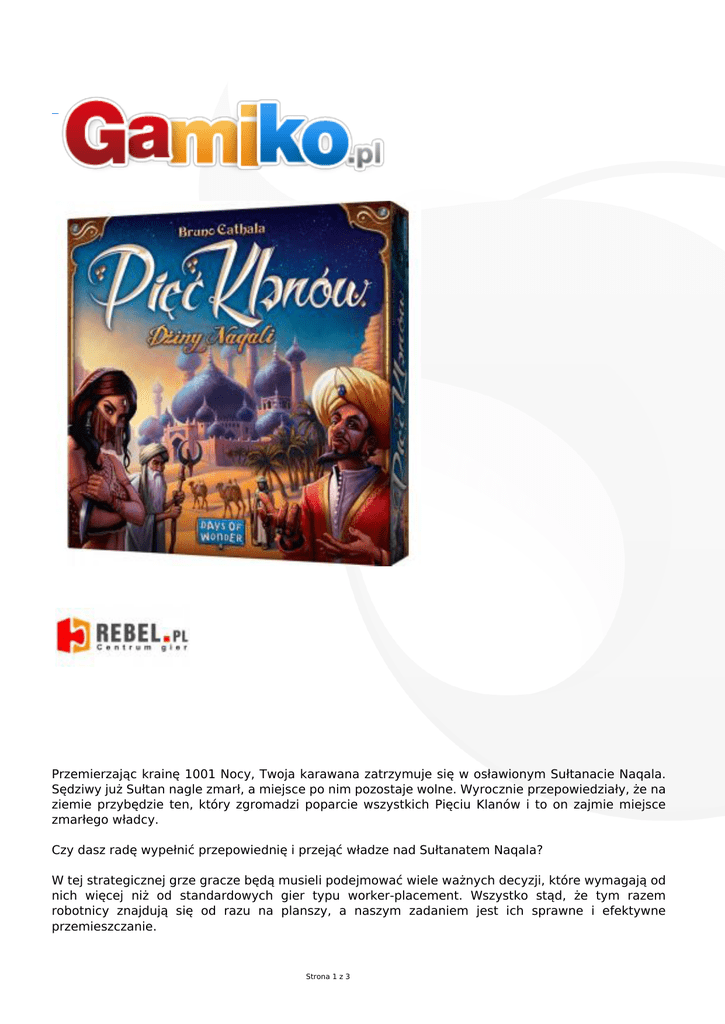 Przemierzając krainę 1001 Nocy, Twoja karawana zatrzymuje się w osławionym Sułtanacie Naqala. Sędziwy już Sułtan nagle zmarł, a miejsce po nim pozostaje wolne. Wyrocznie przepowiedziały, że na ziemie przybędzie ten, który zgromadzi poparcie wszystkich Pięciu Klanów i to on zajmie miejsce zmarłego władcy. Czy dasz radę wypełnić przepowiednię i przejąć władze nad Sułtanatem Naqala? W tej strategicznej grze gracze będą musieli podejmować wiele ważnych decyzji, które wymagają od nich więcej niż od standardowych gier typu worker-placement. Wszystko stąd, że tym razem robotnicy znajdują się od razu na planszy, a naszym zadaniem jest ich sprawne i efektywne przemieszczanie. Strona 1 z 3 Oazy, wioski, targowiska i wiele różnorodnych miejsc tylko czeka, aż przybędą do nich nowi pracownicy - członkowie plemion. A to jak, kiedy i gdzie ich przeniesiesz wpływa bezpośrednio na to, czy wygrasz, czy raczej poniesiesz klęskę. Wezyrowie - zbierając ich przed sobą otrzymasz dodatkowe punkty na koniec gry, Starszyzna - również zapewniają punkty, ale pozwalają także przywoływać do pomocy potężnych Dżinów, Kupcy - wracają z powrotem do woreczka zapewniając karty zasobów, Budowniczowie - wracają z powrotem do woreczka zapewniając monety, Zabójcy - wracają z powrotem do woreczka zabijając pionki na planszy lub zgromadzone przez innych graczy. Planując zwycięską strategię nie możesz zapominać o potężnych magicznych istotach - Dżinach. Jeżeli Ty ich nie wykorzystasz, to przeciwnicy z pewnością użyją ich potężnych mocy i doprowadzą do Twojej zguby. Zawsze miej ich na oku, jeżeli rzeczywiście liczysz na przejęcie Sułtanatu. Pięć Klanów to gra z bardzo wysoką jakością komponentów, jasną i przejrzystą instrukcją i mechaniką, która oferuje wiele dróg prowadzącch do zwycięstwa. Przemieszczanie pionków nie tylko wpływa na to, czy Ty otrzymasz punkty, ale także zmienia ustawienie planszy dla przeciwników. Często trzeba zastanowić się nad tym, czy warto zrobić coś dla siebie, czy tym razem zrobić coś przeciwko innym. Pięć Klanów to arcyciekawa gra, którą zaprojektował Bruno Cathala, mający na swoim koncie wiele fantastycznych tytułów - Cyklady, Shadows over Camelot, Mr. Jacka, Małego Księcia i Abyss. Wiek 13 + Liczba graczy 2-4 Czas gry ok. 40 - 80 minut Instrukcja polska Strona 2 z 3 Wydanie polskie Producent REBEL.pl Projektant Bruno Cathala Strona 3 z 3