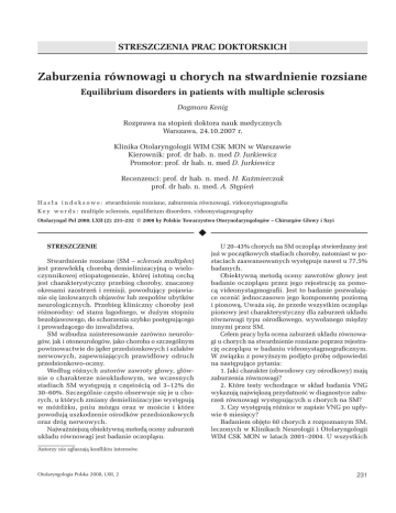 Zaburzenia równowagi u chorych na stwardnienie rozsiane STRESZCZENIA PRAC DOKTORSKICH Zaburzenia równowagi u chorych na stwardnienie rozsiane Equilibrium disorders in patients with multiple sclerosis Dagmara Kenig Rozprawa na stopień doktora nauk medycznych Warszawa, 24.10.2007 r. Klinika Otolaryngologii WIM CSK MON w Warszawie Kierownik: prof. dr hab. n. med D. Jurkiewicz Promotor: prof. dr hab. n. med D. Jurkiewicz Recenzenci: prof. dr hab. n. med. H. Kaźmierczak prof. dr hab. n. med. A. Stępień H a s ł a i n d e k s o w e : stwardnienie rozsiane, zaburzenia równowagi, videonystagmografia K e y w o r d s : multiple sclerosis, equilibrium disorders, videonystagmography Otolaryngol Pol 2008; LXII (2): 231–232 © 2008 by Polskie Towarzystwo Otorynolaryngologów – Chirurgów Głowy i Szyi STRESZCZENIE Stwardnienie rozsiane (SM – sclerosis multiplex) jest przewlekłą chorobą demielinizacyjną o wieloczynnikowej etiopatogenezie, której istotną cechą jest charakterystyczny przebieg choroby, znaczony okresami zaostrzeń i remisji, powodujący pojawianie się izolowanych objawów lub zespołów ubytków neurologicznych. Przebieg kliniczny choroby jest różnorodny: od stanu łagodnego, w dużym stopniu bezobjawowego, do schorzenia szybko postępującego i prowadzącego do inwalidztwa. SM wzbudza zainteresowanie zarówno neurologów, jak i otoneurologów, jako choroba o szczególnym powinowactwie do jąder przedsionkowych i szlaków nerwowych, zapewniających prawidłowy odruch przedsionkowo-oczny. Według różnych autorów zawroty głowy, głównie o charakterze nieukładowym, we wczesnych stadiach SM występują z częstością od 3–12% do 30–60%. Szczególnie często obserwuje się je u chorych, u których zmiany demielinizacyjne występują w móżdżku, pniu mózgu oraz w moście i które powodują uszkodzenie ośrodków przedsionkowych oraz dróg nerwowych. Najważniejszą obiektywną metodą oceny zaburzeń układu równowagi jest badanie oczopląsu. U 20–43% chorych na SM oczopląs stwierdzany jest już w początkowych stadiach choroby, natomiast w postaciach zaawansowanych występuje nawet u 77,5% badanych. Obiektywną metodą oceny zawrotów głowy jest badanie oczopląsu przez jego rejestrację za pomocą videonystagmografii. Jest to badanie pozwalające ocenić jednoczasowo jego komponentę poziomą i pionową. Uważa się, że przede wszystkim oczopląs pionowy jest charakterystyczny dla zaburzeń układu równowagi typu ośrodkowego, wywołanego między innymi przez SM. Celem pracy była ocena zaburzeń układu równowagi u chorych na stwardnienie rozsiane poprzez rejestrację oczopląsu w badaniu videonystagmograficznym. W związku z powyższym podjęto próbę odpowiedzi na następujące pytania: 1. Jaki charakter (obwodowy czy ośrodkowy) mają zaburzenia równowagi? 2. Które testy wchodzące w skład badania VNG wykazują największą przydatność w diagnostyce zaburzeń równowagi występujących u chorych na SM? 3. Czy występują różnice w zapisie VNG po upływie 6 miesięcy? Badaniem objęto 60 chorych z rozpoznanym SM, leczonych w Klinikach Neurologii i Otolaryngologii WIM CSK MON w latach 2001–2004. U wszystkich Autorzy nie zgłaszają konfliktu interesów. Otolaryngologia Polska 2008, LXII, 2 231 D. Kenig chorych rozpoznano wcześniej SM na podstawie zmodyfikowanych kryteriów McDonalda. Diagnostyka neurologiczna obejmowała: badanie kliniczne, MRI mózgu, wzrokowe potencjały wywołane oraz podwyższony wskaźnik immunoglobulin w płynie mózgowo-rdzeniowym. Byli to chorzy z postacią rzutowo-remitującą SM, w różnym stadium rozwoju. Czas trwania choroby wynosił od 6 miesięcy do 15 lat (średni czas trwania choroby 4,31 lat). W badanej grupie było: 42 kobiety i 18 mężczyzn, w wieku od 18 do 61 lat (średnia wieku 38,63 lat). Wszyscy chorzy twierdzili, że mają zawroty głowy i zaburzenia równowagi w wywiadzie, jednak znajdowali się w okresie remisji w dniu badania. Każdy chory był informowany o konieczności odstawienia leków, wpływających na układ nerwowy, co najmniej na 48 godzin przed wykonaniem badania VNG. Grupa kontrolna składała się z 20 zdrowych osób: 14 kobiet i 6 mężczyzn, w wieku od 18 do 58 lat (średnia wieku 37,65 lat), z ujemnym wywiadem w odniesieniu do przewlekłych procesów zapalnych uszu, chorób narządu przedsionkowego, epizodów zaburzeń równowagi, urazów głowy, schorzeń neurologicznych, okulistycznych oraz chorób metabolicznych. U wszystkich osób wykonano następujące badania podmiotowe i przedmiotowe: 1. Wywiad z uwzględnieniem zaburzeń równowagi i przebytych chorób uszu. 2. Badanie laryngologiczne – ze szczególnym uwzględnieniem otoskopii. 3. Badanie okulistyczne. 4. Badanie neurologiczne. 5. Audiometria progowa tonalna. 6. Badanie wideonystagmograficzne (VNG). Badania słuchu i VNG były wykonane dwukrotnie w odstępie 6 miesięcy w Pracowni AudiologicznoLabiryntologicznej Kliniki Otolaryngologicznej WIM CSK MON w Warszawie. Na podstawie wyników badania VNG u 20 otoneurologicznie zdrowych osób, wykonanych podczas kalibracji i standaryzacji aparatu, ustalono normy biologiczne dla poszczególnych testów wchodzących w jego skład i porównano je z normami podanymi przez producenta aparatury. Zmiany w zapisie VNG stwierdzano na podstawie porównania z wynikami badań osób z grupy kontrolnej. Na podstawie ankiety i wywiadu dolegliwości pod postacią upośledzenia słuchu zgłaszało 16 (26,7%) 232 chorych. U wszystkich chorych na SM badanie wydolności narządu słuchu przy użyciu audiometrii progowej tonalnej wykazało średnie wartości normatywne dla wieku dla przewodnictwa powietrznego i kostnego. Wszyscy chorzy zgłaszali, że mają zawroty głowy i zaburzenia równowagi w wywiadzie. W badaniu VNG potwierdzono to u 59 (98,3%) chorych. Na zawroty głowy o charakterze wirowym (układowe) skarżyło się 16 (26,6%) chorych, z towarzyszącymi objawami wegetatywnymi (nudn