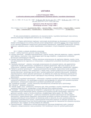 USTAWA z dnia 9 listopada 1995 r. o ochronie zdrowia przed następstwami używania tytoniu i wyrobów tytoniowych (Dz. U. z 1996 r. Nr 10, poz. 55, z 1997 r. Nr 88, poz. 554 i Nr 121, poz. 770, z 1999 r. Nr 96, poz. 1107, z 2003 r. Nr 229, poz. 2274 oraz z 2010 r. Nr 81, poz. 529) ogłoszono dnia 30 stycznia 1996 r. obowiązuje od dnia 1 maja 1996 r. Daty wejścia w życie zmian: 22 października 1997 r., 1 stycznia 1998 r., 1 stycznia 2000 r., 3 stycznia 2000 r., 4 grudnia 2000 r., 1 stycznia 2001 r., 4 grudnia 2001 r., 15 stycznia 2004 r., 15 listopada 2010 r., 15 maja 2012 r. W celu przeciwdziałania uzależnieniu od używania tytoniu i wyrobów tytoniowych oraz ochrony zdrowia przed jego następstwami stanowi się, co następuje: Art. 1. Organy administracji rządowej i samorządu terytorialnego są obowiązane do podejmowania działań zmierzających do ochrony zdrowia przed następstwami używania tytoniu oraz mogą wspierać w tym zakresie działalność medycznych samorządów zawodowych, organizacji społecznych, fundacji, instytucji i zakładów pracy, a także współdziałać z kościołami i innymi związkami wyznaniowymi. Art. 2. Użyte w ustawie określenia oznaczają: 1) "tytoń" - rośliny tytoniowe uprawne rodzaju Nicotiana, 2) "wyroby tytoniowe" - wszelkie wyprodukowane z tytoniu wyroby, takie jak papierosy, cygara, cygaretki, tytoń fajkowy, machorka i inne, zawierające tytoń lub jego składniki, z wyłączeniem produktów leczniczych zawierających nikotynę, 3) "wyroby tytoniowe bezdymne" - wyroby tytoniowe przeznaczone do wąchania (tabaka), ssania, żucia lub wprowadzania do organizmu w innej postaci, z wyłączeniem produktów leczniczych zawierających nikotynę, 4) "rekwizyty tytoniowe" - artykuły i przyrządy przeznaczone do używania tytoniu, jak papierośnice, cygarniczki, bibułki papierosowe, urządzenia do zwijania papierosów, fajki oraz przybory do ich czyszczenia i nabijania, popielniczki, obcinacze do cygar itp. (z wyłączeniem zapalniczek i zapałek), 5) "reklama wyrobów tytoniowych" - rozpowszechnianie komunikatów, wizerunków marek wyrobów tytoniowych lub symboli z nimi związanych, a także nazw i symboli graficznych firm produkujących wyroby tytoniowe, nieróżniące się od nazw i symboli graficznych wyrobów tytoniowych, służących popularyzowaniu marek wyborów tytoniowych; za reklamę nie uważa się informacji używanych do celów handlowych pomiędzy firmami zajmującymi się produkcją, dystrybucją i handlem wyrobami tytoniowymi, 6) "informacja o wyrobach tytoniowych" - informacja o markach wyrobów tytoniowych oraz o zawartości substancji szkodliwych, nie zawierająca przekazu zachęcającego do zakupu lub używania wyrobów tytoniowych, umieszczona wyłącznie w punktach sprzedaży tych wyrobów, 6a) "substancje smoliste" - surowy, bezwodny beznikotynowy kondensat dymu tytoniowego, 6b) "nikotyna" - alkaloidy nikotynowe, 6c) "tlenek węgla" (CO) - bezbarwny, bezwonny gaz, który powstaje w wyniku niepełnego spalania substancji organicznych, występujący w fazie gazowej dymu papierosowego, 6d) "dodatek" - wszelkie substancje lub składniki z wyłączeniem liści tytoniu lub innych naturalnych lub nieprzetworzonych elementów tytoniu używane przy produkcji wyrobu tytoniowego i obecne w gotowym wyrobie, nawet w formie zmienionej, uwzględniając także papier, filtr, farby i kleje, 7) "promocja wyrobów tytoniowych" - publiczne rozdawanie wyrobów tytoniowych lub rekwizytów tytoniowych, organizowanie degustacji, premiowanej sprzedaży wyrobów tytoniowych, oferowanie wyrobów tytoniowych konsumentom po obniżonej cenie w stosunku do ceny wydrukowanej na opakowaniu jednostkowym wyrobu, organizowanie konkursów opartych na zakupie wyrobów lub rekwizytów tytoniowych oraz inne formy publicznego zachęcania do nabywania lub używania wyrobów tytoniowych, bez względu na formę dotarcia do adresata, 8) "sponsorowanie" - wspieranie w formie finansowej lub rzeczowej działalności osób i instytucji, związane z eksponowaniem nazw produktów i firm handlowych oraz ich symboli graficznych, 9) "palarnia" - wyodrębnione konstrukcyjnie od innych pomieszczeń i ciągów komunikacyjnych pomieszczenie, odpowiednio oznaczone, służące wyłącznie do palenia wyrobów tytoniowych zaopatrzone w wywiewną wentylację mechaniczną lub system filtracyjny w taki sposób, aby dym tytoniowy nie przenikał do innych pomieszczeń. Art. 3. Ochrona zdrowia przed następstwami używania tytoniu realizowana jest przez kształtowanie polityki zdrowotnej, ekonomicznej i społecznej, do której należy: 1) ochrona prawa niepalących do życia w środowisku wolnym od dymu tytoniowego, 2) promocja zdrowia przez propagowanie stylu życia wolnego od nałogu papierosów i używania wyrobów tytoniowych, 2a) działalność wychowawcza i informacyjna, 3) tworzenie warunków ekonomicznych i prawnych zachęcających do ograniczenia używania tytoniu, 4) informowanie o szkodliwości palenia tytoniu i zawartości substancji szkodliwych na opakowaniach wyrobów tytoniowych i informacjach o wyrobach tytoniowych, 5) obniżanie norm dopuszczalnych zawartości substancji szkodliwych w wyrobach tytoniowych, 6) leczenie i rehabilitacja osób uzależnionych od tytoniu. Art. 4. 1. Rada Ministrów ustala program określający politykę zdrowotną, społeczną i ekonomiczną, zmierzający do zmniejszenia używania wyrobów tytoniowych. 2. Rada Ministrów składa coroczne sprawozdanie Sejmowi z realizacji tego programu w terminie do 30 kwietnia. 3. Program, o którym mowa w ust. 1, jest finansowany z budżetu państwa w wysokości 0,5% wartości podatku akcyzowego od wyrobów tytoniowych. Art. 5. 1. Zabrania się palenia wyrobów tytoniowych, z zastrzeżeniem art. 5a: 1) na terenie zakładów opieki zdrowotnej i w pomieszczeniach innych obiektów, w których są udzielane świadczenia zdrowotne, 2) na terenie jednostek organizacyjnych systemu oświaty, o których mowa w przep