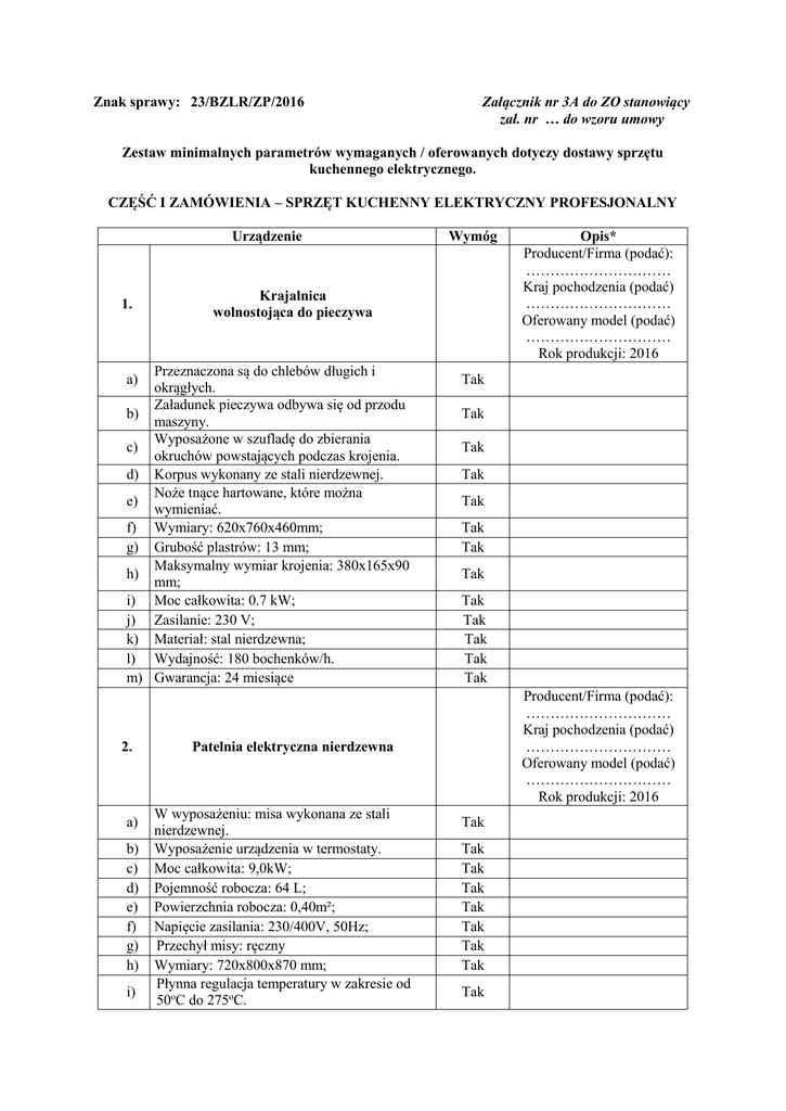 Znak sprawy: 23/BZLR/ZP/2016 Załącznik nr 3A do ZO stanowiący zał. nr … do wzoru umowy Zestaw minimalnych parametrów wymaganych / oferowanych dotyczy dostawy sprzętu kuchennego elektrycznego. CZĘŚĆ I ZAMÓWIENIA – SPRZĘT KUCHENNY ELEKTRYCZNY PROFESJONALNY Urządzenie 1. Krajalnica wolnostojąca do pieczywa Przeznaczona są do chlebów długich i okrągłych. Załadunek pieczywa odbywa się od przodu b) maszyny. Wyposażone w szufladę do zbierania c) okruchów powstających podczas krojenia. d) Korpus wykonany ze stali nierdzewnej. Noże tnące hartowane, które można e) wymieniać. f) Wymiary: 620x760x460mm; g) Grubość plastrów: 13 mm; Maksymalny wymiar krojenia: 380x165x90 h) mm; i) Moc całkowita: 0.7 kW; j) Zasilanie: 230 V; k) Materiał: stal nierdzewna; l) Wydajność: 180 bochenków/h. m) Gwarancja: 24 miesiące a) 2. a) b) c) d) e) f) g) h) i) Wymóg Tak Tak Tak Tak Tak Tak Tak Tak Tak Tak Tak Tak Tak Producent/Firma (podać): ………………………… Kraj pochodzenia (podać) ………………………… Oferowany model (podać) ………………………… Rok produkcji: 2016 Patelnia elektryczna nierdzewna W wyposażeniu: misa wykonana ze stali nierdzewnej. Wyposażenie urządzenia w termostaty. Moc całkowita: 9,0kW; Pojemność robocza: 64 L; Powierzchnia robocza: 0,40m²; Napięcie zasilania: 230/400V, 50Hz; Przechył misy: ręczny Wymiary: 720x800x870 mm; Płynna regulacja temperatury w zakresie od 50oC do 275oC. Opis* Producent/Firma (podać): ………………………… Kraj pochodzenia (podać) ………………………… Oferowany model (podać) ………………………… Rok produkcji: 2016 Tak Tak Tak Tak Tak Tak Tak Tak Tak 3. a) b) c) d) e) f) g) h) i) j) k) l) 4. a) b) c) d) e) f) g) h) i) 5. Producent/Firma (podać): ………………………… Kraj pochodzenia (podać) ………………………… Oferowany model (podać) ………………………… Rok produkcji: 2016 Szatkownica warzyw Szatkownica służy do rozdrabniania warzyw na plastry frytki, wiórki i miazgę. Napędzana trójfazowym silnikiem elektrycznym. Tarcze tnące wykonane z nierdzewnej stali. Czujnik bezpieczeństwa napełniania puszki szatkowanymi elementami warzyw, który wyłącza maszynę, a ponowne uruchomienie może nastąpić dopiero po ponownym zamontowaniu pustego kosza. Sześć tarcz tnących na różne rodzaje: noże na plastry, noże do frytek, noże do wiórków, do miazgi i słupków oraz zestaw do cięcia kostki. Silnik:400/230V; Wymiary: 720x430x1150mm; Klasa bezpieczeństwa: IP33; Obroty tarcz tnących: 300obr./minut; Wydajność150-350kg/h; Moc:750W; Ciężar: do 52kg. Tak Tak Tak Tak Tak Tak Tak Tak Tak Tak Tak Tak Producent/Firma (podać): ………………………… Kraj pochodzenia (podać) ………………………… Oferowany model (podać) ………………………… Rok produkcji: 2016 Kuchnia gazowa 5 palnikowa z piecem konwekcyjnym Wymiary:900x600x850/900mm Materiał: stal nierdzewna Moc palników:3x3kW+1x1,8kW+1x3,5kW (palnik WOK) Piecyk konwekcyjny GN 1/1 o mocy:2,4kW 2 wentylatory Termostat: do 275 stopni ºC Funkcja grillowania Emaliowane wnętrze pieca i wewnętrzna część drzwi Zasilanie:230V Taboret gazowy podwójny Tak Tak Tak Tak Tak Tak Tak Tak Tak Producent/Firma (podać): ………………………… Kraj pochodzenia (podać) ………………………… Oferowany model (podać) ………………………… Rok produkcji: 2016 a) b) c) d) e) f) g) h) i) 6. a) b) c) d) e) f) g) h) i) j) k) l) ł) 7. a) b) c) d) e) f) g) h) Wykonany ze stali nierdzewnej. Przystosowany do dużych obciążeń - garnków 100-litrowych. Dwukoronowe palniki. Zabezpieczenie przeciw wpływowe. Pilotowy płomień palnika. Redukcja mocy palników do 1/3 (płomień oszczędnościowy). Wymiary (dł; szer; wys): 115x61x38 cm Moc: 2x9 kW Rodzaj zasilania: gaz ziemny Tak Tak Tak Tak Tak Tak Tak Tak Tak Producent/Firma (podać): ………………………… Kraj pochodzenia (podać) ………………………… Oferowany model (podać) ………………………… Rok produkcji: 2016 Maszynka do mielenia mięsa Podstawa wykonana z anodowanego aluminium i stali nierdzewnej. Zdejmowana głowica, ślimak i taca wykonane ze stali nierdzewnej. Rewers w celu łatwiejszego odkręcania sitka. Zabezpieczenie przeciw przeciążeniowe. Praca ciągła do 8 godzin. Sitka: 5 i 8 mm Zdejmowana głowica ułatwiająca czyszczenie Antypoślizgowe nóżki Średnica sitka 68 mm Wysokość: 550 mm Głębokość: 499 mm Szerokość: 270 mm Napięcie: 230 V Moc elektryczna: 0.8 kW Wydajność na godzinę: 160 kg/h Tak Tak Tak Tak Tak Tak Tak Tak Tak Tak Tak Tak Tak Producent/Firma (podać): ………………………… Kraj pochodzenia (podać) ………………………… Oferowany model (podać) ………………………… Rok produkcji: 2016 Wilk – maszynka do mięsa Wykonany ze stali nierdzewnej. Obudowa wykonana ze stali nierdzewnej. Wyposażona w: 2 sitka (6 i 8 mm) oraz popychacz. Wymiary: 41,5x23x41,5cm Wydajność: do 120kg/godz. Średnica sitka: 70mm Średnica otworu wsadowego: 50mm Prędkość obrotowa: 190obr./min Tak Tak Tak Tak Tak Tak Tak Tak i) j) k) 8. a) b) c) d) e) f) g) h) i) j) 9. a) b) c) d) e) f) g) h) Moc: 750W Zasilanie: 230V Waga: do 27 kg Producent/Firma (podać): ………………………… Kraj pochodzenia (podać) ………………………… Oferowany model (podać) ………………………… Rok produkcji: 2016 Obieraczka do ziemniaków i jarzyn Pojemność 15 kg przeznaczona do obierania i płukania ziemniaków oraz innych warzyw korzeniowych tj. marchew, buraki itp. Czas obierania: 1,5-3 min. Separator obierzyn wykonany ze stali nierdzewnej służący do wychwytywania obierzyn, zanieczyszczeń oraz piany powstałej w procesie obierania. Wymiary: 53x52x87,5 cm Wykonanie: stal nierdzewna; Pojemność: 15 kg; Wydajność: 480÷900 kg/godz.; Moc: 750 W; Zasilanie: 230/400 V; Waga: do 67 kg. Tak Tak