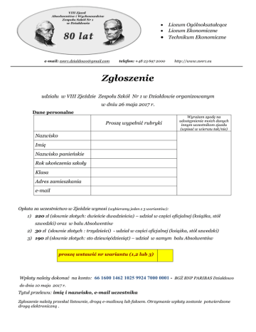 Liceum Ogólnokształcące Liceum Ekonomiczne Technikum Ekonomiczne e-mail: [email protected] telefon: +48 23 697 2000 http://www.zsnr1.eu Zgłoszenie udziału w VIII Zjeździe Zespołu Szkół Nr 1 w Działdowie organizowanym w dniu 26 maja 2017 r. Dane personalne Proszę wypełnić rubryki Wyrażam zgodę na udostępnienie moich danych innym uczestnikom zjazdu (wpisać w wierszu tak/nie) Nazwisko Imię Nazwisko panieńskie Rok ukończenia szkoły Klasa Adres zamieszkania e-mail Opłata za uczestnictwo w Zjeździe wynosi (wybieramy jeden z 3 wariantów): 1) 220 zł (słownie złotych: dwieście dwadzieścia) – udział w części oficjalnej (książka, stół szwedzki) oraz w balu Absolwentów 2) 30 zł (słownie złotych : trzydzieści) - udział w części oficjalnej (książka, stół szwedzki) 3) 190 zł (słownie złotych: sto dziewięćdziesiąt) – udział w samym balu Absolwentów proszę wstawić nr wariantu (1,2 lub 3) Wpłaty należy dokonać na konto: 66 1600 1462 1025 9924 7000 0001 - BGŻ BNP PARIBAS Działdowo do dnia 10 maja 2017 r. Tytuł przelewu: imię i nazwisko, e-mail uczestnika Zgłoszenie należy przesłać listownie, drogą e-mailową lub faksem. Otrzymanie wpłaty zostanie potwierdzone drogą elektroniczną .