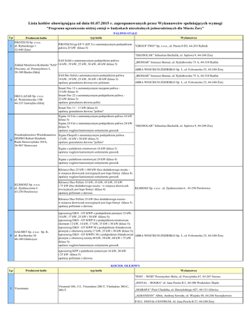 Lista kotłów obowiązująca od dnia 01.07.2015 r. zaproponowanych przez Wykonawców spełniających wymogi "Programu ograniczenia niskiej emisji w budynkach mieszkalnych jednorodzinnych dla Miasta śory” PALIWO STAŁE Lp Producent kotła PROTECH Sp. z o.o. 1 ul. Rybarskiego 1 32-640 Zator typ kotła Wykonawca PROTECH typ EP V (EP 5) z automatycznym podajnikiem paliwa 25 kW (klasa 5) "GROUP TWO" Sp. z o.o., ul. Ptasia 8/D3, 44-203 Rybnik “EKOSOLAR” Sebastian Buchalik, ul. Sądowa 9, 44-240 śory SAS Solid z automatycznym podajnikiem paliwa Zakład Metalowo-Kotlarski "SAS" 14 kW, 19 kW, 25 kW, 36 kW, 48 kW (klasa 5) 2 Owczary, ul. Przemysłowa 3, 28-100 Busko-Zdrój SAS Bio Solid z automatycznym podajnikiem paliwa 14 kW, 19 kW, 25 kW, 36 kW i 48 kW (klasa 5) opalany granulatem drewna tzw peletami HKS LAZAR Sp. z o.o. 3 ul. Wodzisławska 15B 44-335 Jastrzębie-Zdrój „IROMAR” Ireneusz Bernaś, ul. Rydułtowska 75 A, 44-310 Radlin ABRA WOJCIECH ZDZIEBŁO Sp. J., ul. Folwarecka 23, 44-240 śory „IROMAR” Ireneusz Bernaś, ul. Rydułtowska 75 A, 44-310 Radlin ABRA WOJCIECH ZDZIEBŁO Sp. J., ul. Folwarecka 23, 44-240 śory Smart Fire 15 z automatycznym zasypem paliwa 15 kW (klasa 5) Smart Fire 22 z automatycznym podajnikiem paliwa 22 kW (klasa 5) opalane granulatem drewna pellet Smart Fire 11 - 11 kW (klasa 4) opalany granulatem drewna "pellets" Sigma 16 Uni z automatycznym podajnikiem paliwa 16 kW (klasa 5) Sigma 24 Uni z automatycznym podajnikiem paliwa 24 kW “EKOSOLAR” Sebastian Buchalik, ul. Sądowa 9, 44-240 śory (klasa 5) opalane węglem kamiennym sortymentu groszek Przedsiębiorstwo WielobranŜowe Sigma Ekopell z automatycznym podajnikiem paliwa DEFRO Robert Dziubeła 12 kW, 16 kW i 20 kW (klasa 5) 4 Ruda Strawczyńska 103A, opalane granulatem drewna "pellets" 26-067 Strawczyn Sigma z palnikiem retortowym 16 kW (klasa 5) opalany węglem kamiennym sortymentu groszek Sigma z palnikiem retortowym 24 kW (klasa 4) opalany węglem kamiennym sortymentu groszek Klimosz Duo 25 kW i 100 kW (bez dodatkowego rusztu w miejscu drzwiczek rewizyjnych jest logo firmy) (klasa 4) opalany węglem kamiennym sortymentu groszek KLIMOSZ Sp. z o.o. 5 ul. Zjednoczenia 6 43-250 Pawłowice Klimosz Duo Pellets 15 kW, 35 kW, 45 kW, 55 kW i 75 kW (bez dodatkowego rusztu - w miejscu drzwiczek rewizyjnych jest logo firmy) (klasa 4) opalany pelletami z drewna KLIMOSZ Sp. z o.o. ul. Zjednoczenia 6, 43-250 Pawłowice Klimosz Duo Pellets 25 kW (bez dodatkowego rusztu w miejscu drzwiczek rewizyjnych jest logo firmy) (klasa 5) opalany pelletami z drewna GALMET Sp. z o.o. Sp. K. 6 ul. Raciborska 36 48-100 Głubczyce typoszereg EKO - GT KWP z podajnikiem prostym 12 kW, 14 kW, 17 kW, 25 kW i 30 kW (klasa 5); typoszereg EKO - GT KWP S z podajnikiem retortowym skośnym 12 kW, 14 kW, 17 kW, 25 kW i 30 kW (klasa 5); typoszereg EKO - GT KWP M z podajnikiem ślimakowym prostym z obrotową retortą 17 kW, 25 kW i 30 kW (klasa 5); typoszereg EKO - GT KWPU M z podajnikiem ślimakowym ABRA WOJCIECH ZDZIEBŁO Sp. J., ul. Folwarecka 23, 44-240 śory prostym z obrotową retortą 40 kW, 50 kW, 60 kW i 75 kW (klasa 5); opalane węglem kamiennym sortymentu groszek typoszereg KPP z palnikiem rynnowym 16 kW, 20 kW i 25 kW (klasa 5) opalany pelletami z drewna KOCIOŁ OLEJOWY Lp Producent kotła typ kotła Wykonawca "INST – WOD" Przemysław Biela, ul. Pszczyńska 67, 43-267 Suszec „INSTAL – ROGRA” ul. Jana Pawła II 2, 44-300 Wodzisław Śląski 1 Viessmann Vitorond 100, 111, Vitorodens 200-T, Vitoladens 300-C, 300-T „MABAPA” Piotr Chudoba, ul. Daszyńskiego 427, 44-151 Gliwice „ALBANDAN” Albin, Andrzej Szweda, ul. Wiejska 50, 44-246 Szczejkowice P.H.U. INSTAL-CENTRUM, Al. Jana Pawła II 27, 44-240 śory PALIWO GAZOWE Lp Producent kotła 1 ACV typ kotła Wykonawca Kompakt Solo, Kombi Kompakt PUCHAŁKA PHU Stanisław Puchałka, ul. Platynowa 4, 43-200 Pszczyna "GROUP TWO" Sp. z o.o., ul. Ptasia 8/D3, 44-203 Rybnik "PRO TECH" Andrzej Szostek, ul. Rodzinna 6, 44-240 śory Compact Plus, KZT Plus, KST Plus, KT Plus, Maximus „COMPLEX” Łukasz Chodzidło, ul. Murarska 29, 44-240 śory RK/RT Plus, Maximus RSK/RTS Plus, Maximus RZT/RZK „ALBANDAN” Albin, Andrzej Szweda, ul. Wiejska 50, 44-246 Szczejkowice Plus „Instalacje (...) CO.” Wojciech Staniocha , os. Powstańców Śl. 2F/9, śory KLIMOSZ Sp. z o.o. , ul. Zjednoczenia 6, 43-250 Pawłowice Conica Green INSTALREM Jacek Warzecha, ul. Makowa 3/1, 41-809 Zabrze 15 S e.s.i. Turbo, 25 S e.s.i. Turbo, 25 e.s.i. Turbo "GROUP TWO" Sp. z o.o., ul. Ptasia 8/D3, 44-203 Rybnik Junkers Cerapur Acu 2 Attack 3 Beretta 4 Bosh Junkers Cerapur Smart KW INSTAL Artur Konsek, ul. Ligonia 1, 44-266 Świerklany 5 Brotje Heizung WGB 6 Buderus Logamax GB 022, GB 112W, GB 152, GB 152T „INMAKOR” Andrzej Kania, ul. W. Witosa 4, 40-832 Katowice PUCHAŁKA PHU Stanisław Puchałka, ul. Platynowa 4, 43-200 Pszczyna 7 Coopra P15B, P33B, P15C, P33C, P40C, P80C, P33K KLIMOSZ Sp. z o.o. , ul. Zjednoczenia 6, 43-250 Pawłowice „ART – INSTAL” M. Stryjniak, A. Wowra, ul. Rybnicka 244 A, 44-240 śory "GROUP TWO" Sp. z o.o., ul. Ptasia 8/D3, 44-203 Rybnik 8 De Dietrich MCR 24/39, INNOVENS MCA 15/35 „COMPLEX” Łukasz Chodzidło, ul. Murarska 29, 44-240 śory „Instalacje (...) CO.” Wojciech Staniocha , os. Powstańców Śl. 2F/9, śory Victrix kW, Victrix kW X, Zeus Victrix 20/27, Hercules Condensing 20/27/27 ABT, Zeus Victrix 20/27 9 Immergas Isofast Condens F 24/30E, 24/35; Isotwin Condens F 24/30 E, F 30/35 E; Thema Codens F25, F AS 18-30; 10 Saunier Duval „ALBANDAN” Albin, Andrzej Szweda, ul. Wiejska 50, 44-246 Szczejkowice "PRO TECH" Andrzej Szostek, ul. Rodzinna 6, 44-240 śory „CON-TACT” Dariusz Szelka, ul. Wodna 12, 44-240 śory "PRO TECH" Andrzej Szostek, ul. Rodzinna 6, 44-240 śory „ART – INSTAL” M. Stryjniak, A. Wowra, ul. Rybnicka 244 A, 44-240 śory "GROUP TWO" Sp. z o.o., ul. Ptasia 8/D3, 44-203 Rybnik "GROUP TWO" Sp. z o.o., ul. Ptasia 8/D3, 44-203 Ryb