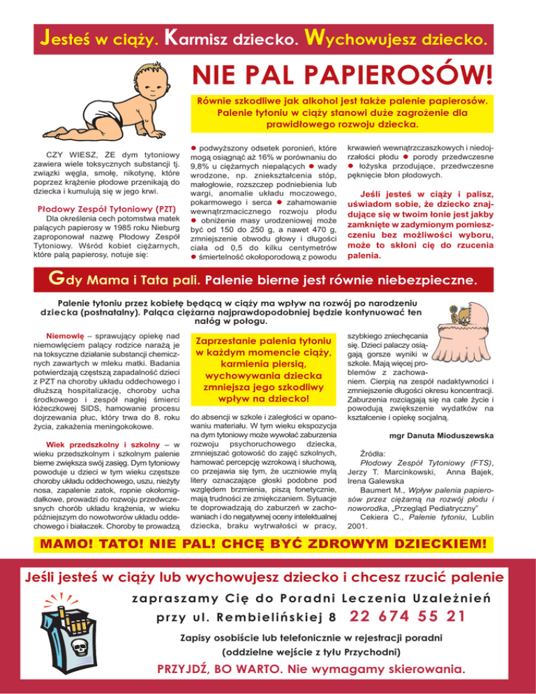 Jesteś w ciąży. Karmisz dziecko. Wychowujesz dziecko. NIE PAL PAPIEROSÓW! Równie szkodliwe jak alkohol jest także palenie papierosów. Palenie tytoniu w ciąży stanowi duże zagrożenie dla prawidłowego rozwoju dziecka. CZY WIESZ, ŻE dym tytoniowy zawiera wiele toksycznych substancji tj. związki węgla, smołę, nikotynę, które poprzez krążenie płodowe przenikają do dziecka i kumulują się w jego krwi. Płodowy Zespół Tytoniowy (PZT) Dla określenia cech potomstwa matek palących papierosy w 1985 roku Nieburg zaproponował nazwę Płodowy Zespół Tytoniowy. Wśród kobiet ciężarnych, które palą papierosy, notuje się: podwyższony odsetek poronień, które mogą osiągnąć aż 16% w porównaniu do 9,8% u ciężarnych niepalących wady wrodzone, np. zniekształcenia stóp, małogłowie, rozszczep podniebienia lub wargi, anomalie układu moczowego, pokarmowego i serca zahamowanie wewnątrzmacicznego rozwoju płodu obniżenie masy urodzeniowej może być od 150 do 250 g, a nawet 470 g, zmniejszenie obwodu głowy i długości ciała od 0,5 do kilku centymetrów śmiertelność okołoporodową z powodu krwawień wewnątrzczaszkowych i niedojrzałości płodu porody przedwczesne łożyska przodujące, przedwczesne pęknięcie błon płodowych. Jeśli jesteś w ciąży i palisz, uświadom sobie, że dziecko znajdujące się w twoim łonie jest jakby zamknięte w zadymionym pomieszczeniu bez możliwości wyboru, może to skłoni cię do rzucenia palenia. Gdy Mama i Tata pali. Palenie bierne jest równie niebezpieczne. Palenie tytoniu przez kobietę będącą w ciąży ma wpływ na rozwój po narodzeniu dziecka (postnatalny). Paląca ciężarna najprawdopodobniej będzie kontynuować ten nałóg w połogu. Niemowlę – sprawujący opiekę nad niemowlęciem palący rodzice narażą je na toksyczne działanie substancji chemicznych zawartych w mleku matki. Badania potwierdzają częstszą zapadalność dzieci z PZT na choroby układu oddechowego i dłuższą hospitalizację, choroby ucha środkowego i zespół nagłej śmierci łóżeczkowej SIDS, hamowanie procesu dojrzewania płuc, który trwa do 8. roku życia, zakażenia meningokokowe. Wiek przedszkolny i szkolny – w wieku przedszkolnym i szkolnym palenie bierne zwiększa swój zasięg. Dym tytoniowy powoduje u dzieci w tym wieku częstsze choroby układu oddechowego, uszu, nieżyty nosa, zapalenie zatok, ropnie okołomigdałkowe, prowadzi do rozwoju przedwczesnych chorób układu krążenia, w wieku późniejszym do nowotworów układu oddechowego i białaczek. Choroby te prowadzą Zaprzestanie palenia tytoniu w każdym momencie ciąży, karmienia piersią, wychowywania dziecka zmniejsza jego szkodliwy wpływ na dziecko! do absencji w szkole i zaległości w opanowaniu materiału. W tym wieku ekspozycja na dym tytoniowy może wywołać zaburzenia rozwoju psychoruchowego dziecka, zmniejszać gotowość do zajęć szkolnych, hamować percepcję wzrokową i słuchową, co przejawia się tym, że uczniowie mylą litery oznaczające głoski podobne pod względem brzmienia, piszą fonetycznie, mają trudności ze zmiękczaniem. Sytuacje te doprowadzają do zaburzeń w zachowaniach i do negatywnej oceny intelektualnej dziecka, braku wytrwałości w pracy, szybkiego zniechęcania się. Dzieci palaczy osiągają gorsze wyniki w szkole. Mają więcej problemów z zachowaniem. Cierpią na zespół nadaktywności i zmniejszenie długości okresu koncentracji. Zaburzenia rozciągają się na całe życie i powodują zwiększenie wydatków na kształcenie i opiekę socjalną. mgr Danuta Mioduszewska Źródła: Płodowy Zespół Tytoniowy (FTS), Jerzy T. Marcinkowski, Anna Bajek, Irena Galewska Baumert M., Wpływ palenia papierosów przez ciężarną na rozwój płodu i noworodka, „Przegląd Pediatryczny” Cekiera C., Palenie tytoniu, Lublin 2001. MAMO! TATO! NIE PAL! CHCĘ BYĆ ZDROWYM DZIECKIEM! Jeśli jesteś w ciąży lub wychowujesz dziecko i chcesz rzucić palenie zapraszamy Cię do Poradni Leczenia Uzależnień przy ul. Rembielińskiej 8 22 674 55 21 Zapisy osobiście lub telefonicznie w rejestracji poradni (oddzielne wejście z tyłu Przychodni) PRZYJDŹ, BO WARTO. Nie wymagamy skierowania.