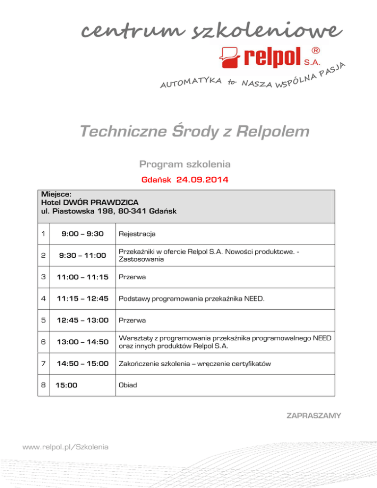 centrum szkoleniowe AUT O M LN ATYKA to NASZA WSPÓ A S PA JA Techniczne Środy z Relpolem Program szkolenia Gdańsk 24.09.2014 Miejsce: Hotel DWÓR PRAWDZICA ul. Piastowska 198, 80-341 Gdańsk 1 9:00 – 9:30 2 9:30 – 11:00 3 11:00 – 11:15 Przerwa 4 11:15 – 12:45 Podstawy programowania przekaźnika NEED. 5 12:45 – 13:00 Przerwa 6 13:00 – 14:50 Warsztaty z programowania przekaźnika programowalnego NEED oraz innych produktów Relpol S.A. 7 14:50 – 15:00 Zakończenie szkolenia – wręczenie certyfikatów 8 15:00 Obiad Rejestracja Przekaźniki w ofercie Relpol S.A. Nowości produktowe. Zastosowania ZAPRASZAMY www.relpol.pl/Szkolenia