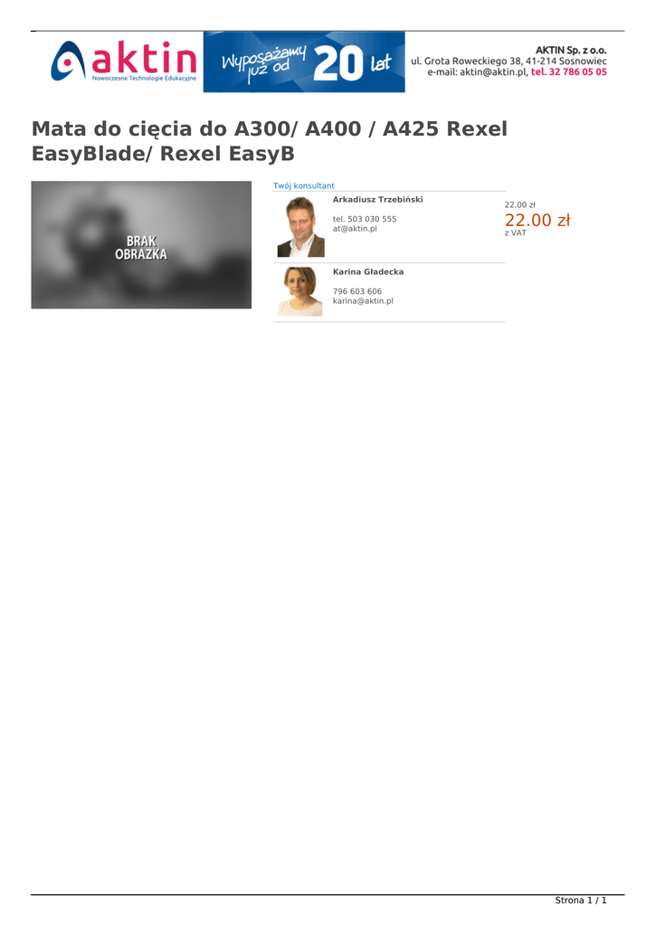 Mata do cięcia do A300/ A400 / A425 Rexel EasyBlade/ Rexel EasyB Twój konsultant Arkadiusz Trzebiński tel. 503 030 555 [email protected] NOWOŚĆ W OFERCIE 22.00 zł 22.00 zł z VAT Karina Gładecka 796 603 606 [email protected] Strona 1 / 1 Powered by TCPDF (www.tcpdf.org)