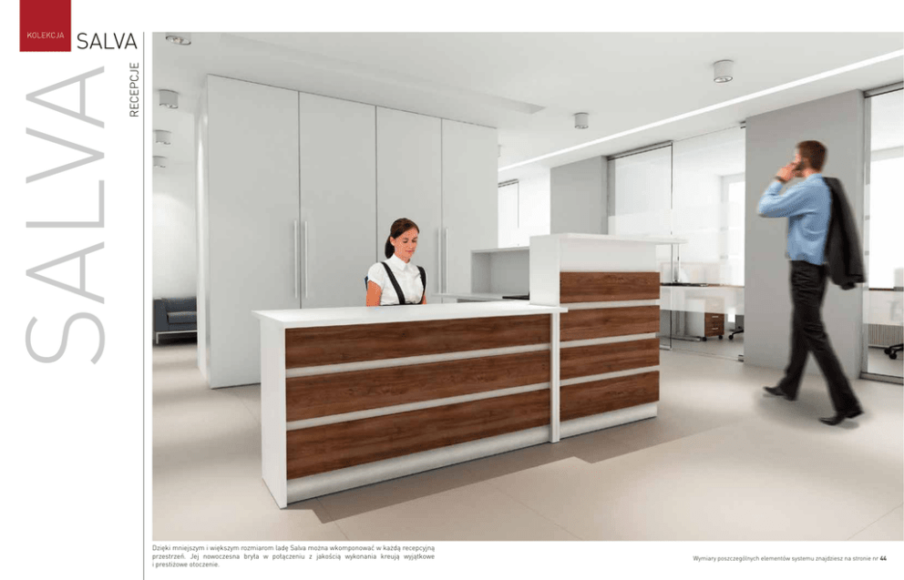 RECEPCJE SALVA SALVA KOLEKCJA Dzięki mniejszym i większym rozmiarom ladę Salva można wkomponować w każdą recepcyjną przestrzeń. Jej nowoczesna bryła w połączeniu z jakością wykonania kreują wyjątkowe i prestiżowe otoczenie. Wymiary poszczególnych elementów systemu znajdziesz na stronie nr 44 KOLEKCJA SALVA RECEPCJE Od wewnątrz lada Salva jest białym wnętrzem przystosowanym do specyfiki pracy recepcjonistki. Na zewnątrz jej estetykę budują dwubarwne pasy w układzie poziomym. 1. Elementem wzbogacającym ladę jest nakładka. 2. Wśród różnych brył lady Salva znajduje się również moduł narożny. Wymiary poszczególnych elementów systemu znajdziesz na stronie nr 44 KOLEKCJA SALVA SZKLANE BLATY LADY RECEPCYJNE Front i korpus w dekorze z płyty laminowanej jednobarwnej lub drewnopodobnej Szklany blat SV 100 80 x 30 h Szklany blat SV 103 140 x 30 h Szklany blat SV 106 200 x 30 h Lada S 100 80 x 80 x 115 h Lada S 101 100 x 80 x 115 h Szklany blat SV 101 100 x 30 h Szklany blat SV 104 160 x 30 h Szklany blat SV 102 120 x 30 h Szklany blat SV 105 180 x 30 h Szklany blat SV 300 100 x 100 h Lada S 102 120 x 80 x 115 h Lada S 103 140 x 80 x 115 h Lada S 104 160 x 80 x 115 h Lada S 105 180 x 80 x 115 h Lada S 106 200 x 80 x 115 h Lada S 200 100 x 80 x 75 h Lada S 201 140 x 80 x 75 h Lada S 202 160 x 80 x 75 h Lada S 300 100 x 100 x 115 h Nakładka S 301 45 x 35 x 99 h Wymiary: szerokość x głębokość x wysokość (cm) Sizes: width x depth x height (cm) Obrys lady wyznacza miejsce pracy, w którym recepcjonistka może swobodnie przemieszczać się i obsługiwać klientów.