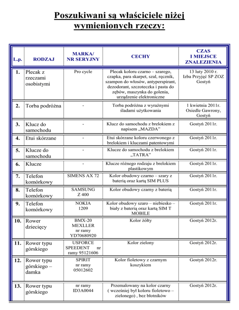 Poszukiwani są właściciele niżej wymienionych rzeczy: L.p. RODZAJ MARKA/ NR SERYJNY CECHY CZAS I MIEJSCE ZNALEZIENIA Pro cycle Plecak koloru czarno – szarego, czapka, para skarpet, szal, ręcznik, szampon do włosów, antyperspirant, dezodorant, szczoteczka i pasta do zębów, maszynka do golenia, urządzenie elektroniczne 13 luty 2010 r. Izba Przyjęć SP ZOZ Gostyń Torba podróżna - Torba podróżna z wyraźnymi śladami użytkowania 1 kwietnia 2011r. Osiedle Gawrony, Gostyń 3. Klucz do samochodu - Klucz do samochodu z brelokiem z napisem „MAZDA” Gostyń 2011r. 4. Etui skórzane - Etui skórzane koloru czerwonego z brelokiem i kluczami patentowymi Gostyń 2011r. 5. Klucze do samochodu - Klucze do samochodu z brelokiem „TATRA” Gostyń 2011r. 6. Klucze - Klucze różnego rodzaju z brelokiem plastikowym Gostyń 2011r. 7. Telefon komórkowy SIMENS AX 72 Kolor obudowy czarno – szary z baterią oraz kartą SIM PLUS Gostyń 2011r. 8. Telefon komórkowy SAMSUNG Z 400 Kolor obudowy czarny z baterią Gostyń 2011r. 9. Telefon komórkowy NOKIA 1209 Kolor obudowy szaro – niebiesko – biały z baterią oraz kartą SIM T MOBILE Gostyń 2011r. BMX-20 MEXLLER nr ramy YD70680920 Kolor żółty Gostyń 2012r. 11. Rower typu górskiego USFORCE SPEEDENT nr ramy 95121606 Kolor zielony Gostyń 2012r. 12. Rower typu górskiego – damka SPIRIT nr ramy 05012602 Kolor fioletowy z czarnym koszykiem Gostyń 2012r. 13. Rower typu górskiego nr ramy ID3A0044 Przemalowany na kolor czarny ( wcześniej był koloru fioletowo – zielonego) , bez błotników Gostyń 2012r. 1. Plecak z rzeczami osobistymi 2. 10. Rower dziecięcy 14. Rower typu górskiego SPEDER nr ramy 098003552 Kolor czarny Gostyń 2012r. 15. Rower typu damka TREND nr ramy BS9042143 Kolor srebrno - szary Gostyń 2012r. 16. Klucze - Klucze na skórzanym rzemyku z brelokiem - latarką Gostyń 2012r. 17. Hantel - Hantel z gryfem i zaciskiem koloru srebrnego i czterema krążkami o wadze 1 kg koloru czarnego Gostyń 2012r. 18. Przewód OMY (H03VV-F) 2x0,75 mm/2 Kolor biały, długość 51 metrów Gostyń 2012r. 19. Przewód UNITRONIC LIYCY 2X0,75 Długość 13 metrów Gostyń 2012r. 20. Przewód OLFEX CLASSIC 115 CV 2x0,75 Kolor szary, długość 16 metrów Gostyń 2012r. 21. Przewód ELPAR (H05VV-F) 4G 1,0 mm/2 Kolor biały, długość 7 metrów Gostyń 2012r. 22. Etui skórzane - Małe etui skórzane koloru brązowego 27 kwietnia 2013 r. Parking przy Kredyt Banku w Gostyniu 23. Smyczka - Smyczka koloru szarego z napisem „Międzynarodowe Targi Poznańskie” 27 kwietnia 2013 r. Parking przy Kredyt Banku w Gostyniu 24. Klucze - Klucze patentowe szt. 3 27 kwietnia 2013 r. 25. Brelok - Brelok metalowy oraz brelok plastikowy koloru zielonego z napisem „Dom” 27 kwietnia 2013 r. Parking przy Kredyt Banku w Gostyniu Uni -Baby Rama metalowa, kolor czarny, granatowe poszycie z jasnoniebieskimi elementami, Szkoła Podstawowa Nr 1 w Gostyniu 26. Wózek dziecięcy 18 maja 2013 r.