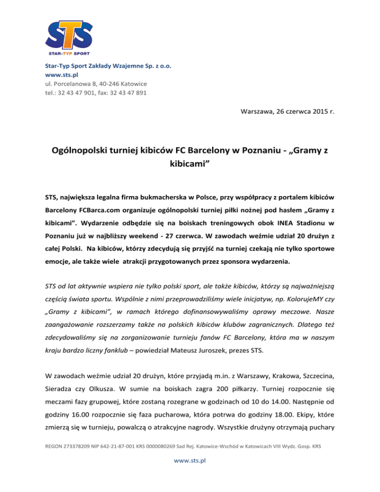 Star-Typ Sport Zakłady Wzajemne Sp. z o.o. www.sts.pl ul. Porcelanowa 8, 40-246 Katowice tel.: 32 43 47 901, fax: 32 43 47 891 Warszawa, 26 czerwca 2015 r. Ogólnopolski turniej kibiców FC Barcelony w Poznaniu - „Gramy z kibicami” STS, największa legalna firma bukmacherska w Polsce, przy współpracy z portalem kibiców Barcelony FCBarca.com organizuje ogólnopolski turniej piłki nożnej pod hasłem „Gramy z kibicami”. Wydarzenie odbędzie się na boiskach treningowych obok INEA Stadionu w Poznaniu już w najbliższy weekend - 27 czerwca. W zawodach weźmie udział 20 drużyn z całej Polski. Na kibiców, którzy zdecydują się przyjśd na turniej czekają nie tylko sportowe emocje, ale także wiele atrakcji przygotowanych przez sponsora wydarzenia. STS od lat aktywnie wspiera nie tylko polski sport, ale także kibiców, którzy są najważniejszą częścią świata sportu. Wspólnie z nimi przeprowadziliśmy wiele inicjatyw, np. KolorujeMY czy „Gramy z kibicami”, w ramach którego dofinansowywaliśmy oprawy meczowe. Nasze zaangażowanie rozszerzamy także na polskich kibiców klubów zagranicznych. Dlatego też zdecydowaliśmy się na zorganizowanie turnieju fanów FC Barcelony, która ma w naszym kraju bardzo liczny fanklub – powiedział Mateusz Juroszek, prezes STS. W zawodach weźmie udział 20 drużyn, które przyjadą m.in. z Warszawy, Krakowa, Szczecina, Sieradza czy Olkusza. W sumie na boiskach zagra 200 piłkarzy. Turniej rozpocznie się meczami fazy grupowej, które zostaną rozegrane w godzinach od 10 do 14.00. Następnie od godziny 16.00 rozpocznie się faza pucharowa, która potrwa do godziny 18.00. Ekipy, które zmierzą się w turnieju, powalczą o atrakcyjne nagrody. Wszystkie drużyny otrzymają puchary REGON 273378209 NIP 642-21-87-001 KRS 0000080269 Sad Rej. Katowice-Wschód w Katowicach VIII Wydz. Gosp. KRS www.sts.pl Star-Typ Sport Zakłady Wzajemne Sp. z o.o. www.sts.pl ul. Porcelanowa 8, 40-246 Katowice tel.: 32 43 47 901, fax: 32 43 47 891 i dyplomy, a trzy najlepsze zespoły zostaną nagrodzone biletami na mecze reprezentacji Polski, której STS jest oficjalnym partnerem. Najlepsze drużyny zdobędą również vouchery na zakup sprzętu sportowego, a wyróżniający się zawodnicy otrzymają piłki i koszulki z podpisami reprezentantów Polski w piłce nożnej. STS w dniu turnieju, zapewni wiele atrakcji dla kibiców, którzy przyjdą na boiska treningowe obok INEA Stadionu. Na terenie imprezy powstanie specjalna Strefa STS, w której na odwiedzających czekad będą liczne gry i zabawy. Miłośnicy sportu będą mogli sprawdzid swoje umiejętności piłkarskie - do ich dyspozycji zostanie oddana bramka celnościowa. W strefie STS można będzie także poczud dreszczyk emocji grając na konsoli lub w piłkarzyki. O odpowiednią oprawę muzyczną i prowadzenie imprezy zadba profesjonalny DJ. Strefa STS będzie czynna przez cały czas trwania turnieju. Udział we wszystkich atrakcjach jest bezpłatny. Więcej informacji: Paweł Rabantek Doradca zarządu ds. PR (+48) 603 870 044 [email protected] REGON 273378209 NIP 642-21-87-001 KRS 0000080269 Sad Rej. Katowice-Wschód w Katowicach VIII Wydz. Gosp. KRS www.sts.pl