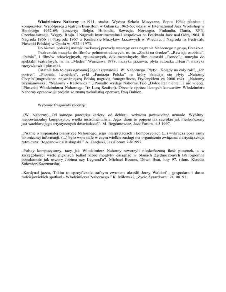 Włodzimierz Nahorny ur.1941, studia: Wyższa Szkoła Muzyczna, Sopot 1964; pianista i kompozytor. Współpraca z teatrem Bim-Bom w Gdańsku 1962-63; udział w International Jazz Workshop w Hamburgu 1962-69; koncerty: Belgia, Holandia, Szwecja, Norwegia, Finlandia, Dania, RFN, Czechosłowacja, Węgry, Rosja. I Nagroda instrumentalna i zespołowa na Festiwalu Jazz nad Odrą 1964, II Nagroda 1966 i I Nagroda 1967 w Konkursie Muzyków Jazzowych w Wiedniu, I Nagroda na Festiwalu Piosenki Polskiej w Opolu w 1972 i 1973. Do historii polskiej muzyki rockowej przeszły występy oraz nagrania Nahornego z grupą Breakout. Twórczość: muzyka do filmów pełnometrażowych, m. in. „Znaki na drodze”, „Rewizja osobista”, „Pełnia”, i filmów telewizyjnych, rysunkowych, dokumentalnych; film autorski „Rondo”,; muzyka do spektakli teatralnych, m. in. „Medea” Warszawa 1978; muzyka jazzowa, płyta autorska „Heart”; muzyka rozrywkowa i piosenki. Ostatnie lata to czas ogromnej jego aktywności W. Nahornego. Płyty: „Kolędy na cały rok”, „Ich portret”, „Piosenki lwowskie”, cykl „Fantazja Polska” na który składają się płyty „Nahorny Chopin”(nagrodzona najważniejszą Polską nagrodą fonograficzną Fryderykiem za 2000 rok) „Nahorny Szymanowski , “Nahorny - Karłowicz “ . Ponadto wydaje Nahorny Trio „Dolce Far niente... i nic więcej, “Piosenki Włodzimierza Nahornego “(z Lorą Szafran). Obecnie oprócz licznych koncertów Włodzimierz Nahorny opracowuje projekt ze znaną wokalistką operową Ewą Bubicz. Wybrane fragmenty recenzji: „(W. Nahorny)...Od samego początku kariery, od debiutu, wzbudza powszechne uznanie. Wybitny, niepowtarzalny kompozytor, wielki instrumentalista. Jego idiom to pojęcie tak szerokie jak nieskończony jest wachlarz jego artystycznych doświadczeń”. M. Bogdanowicz, Jazz Forum, 4-5 1997. „Pisanie o wspaniałej pianistyce Nahornego, jego interpretacjach i kompozycjach (...) wykracza poza ramy lakonicznej informacji. (...) było wspaniale w czym wielkie zasługi ma organicznie związana z artystą sekcja rytmiczna: Bogdanowicz/Biskupski.” A. Zarębski, JazzForum 7-8/1997. „Polscy kompozytorzy, tacy jak Włodzimierz Nahorny stworzyli nieskończoną ilość piosenek, a w szczególności wiele pięknych ballad które mogłyby osiągnąć w Stanach Zjednoczonych tak ogromną popularność jak utwory Jobima czy Legrand’a”. Michael Bourne, Down Beat, luty 97. (tłum. Klaudia Sołowicz-Kaczmarska) „Kardynał jazzu, Takim to specyficznie trafnym zwrotem określił Jerzy Waldorf - gospodarz i dusza radziejowickich spotkań - Włodzimierza Nahornego.” K. Milewski, „Źycie Żyrardowa” 21. 08. 97.