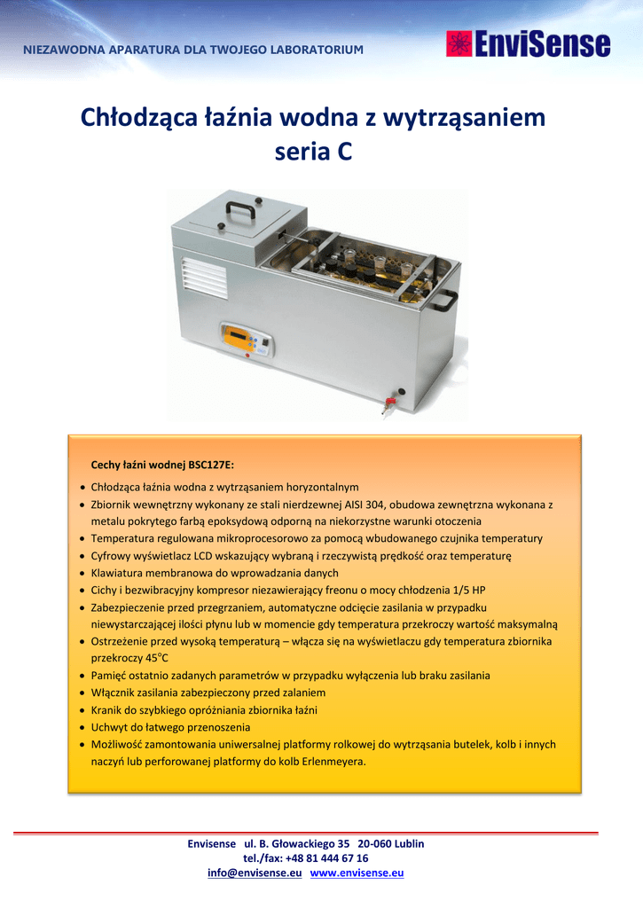 NIEZAWODNA APARATURA DLA TWOJEGO LABORATORIUM Chłodząca łaźnia wodna z wytrząsaniem seria C Cechy łaźni wodnej BSC127E: Chłodząca łaźnia wodna z wytrząsaniem horyzontalnym Zbiornik wewnętrzny wykonany ze stali nierdzewnej AISI 304, obudowa zewnętrzna wykonana z metalu pokrytego farbą epoksydową odporną na niekorzystne warunki otoczenia Temperatura regulowana mikroprocesorowo za pomocą wbudowanego czujnika temperatury Cyfrowy wyświetlacz LCD wskazujący wybraną i rzeczywistą prędkość oraz temperaturę Klawiatura membranowa do wprowadzania danych Cichy i bezwibracyjny kompresor niezawierający freonu o mocy chłodzenia 1/5 HP Zabezpieczenie przed przegrzaniem, automatyczne odcięcie zasilania w przypadku niewystarczającej ilości płynu lub w momencie gdy temperatura przekroczy wartość maksymalną Ostrzeżenie przed wysoką temperaturą – włącza się na wyświetlaczu gdy temperatura zbiornika przekroczy 45oC Pamięć ostatnio zadanych parametrów w przypadku wyłączenia lub braku zasilania Włącznik zasilania zabezpieczony przed zalaniem Kranik do szybkiego opróżniania zbiornika łaźni Uchwyt do łatwego przenoszenia Możliwość zamontowania uniwersalnej platformy rolkowej do wytrząsania butelek, kolb i innych naczyń lub perforowanej platformy do kolb Erlenmeyera. Envisense ul. B. Głowackiego 35 20-060 Lublin tel./fax: +48 81 444 67 16 [email protected] www.envisense.eu NIEZAWODNA APARATURA DLA TWOJEGO LABORATORIUM Specyfikacja techniczna Model Termostatowanie Pojemność maksymalna Moc grzania Moc chłodzenia Zakres temperatury Rozdzielczość temperatury Mieszanie Moc mieszania Rodzaj ruchu Amplituda Zakres prędkości obrotów Rozdzielczość prędkości Dane ogólne Materiał zbiornika Wymiary wewnętrzne Wymiary zewnętrzne Waga Klasa ochrony Akcesoria (dostępne opcjonalnie) BSC127E 27 L 1600 W 300 W 10 - 100oC 0.1oC 50 W horyzontalny 40 mm 10-100 rpm 5 rpm Stal nierdzewna AISI 304 35 x 26 x 17 cm 85 x 40 x 40 cm 30 kg IP52 - pokrywa ze stali nierdzewnej z uchwytem, - uniwersalna platforma rolkowa z 5 rolkami (montowana fabrycznie) - platforma perforowana do uchwytów na kolby Erlenmeyera, - uchwyty do kolb: 50 ml (max.30 szt.), 100 ml (max. 20 szt.), 250 ml (max.12 szt.), 500 ml (max. 9 szt.), 1000ml (max 6 szt.) - sprężyny mocujące (2 ) do kolb, naczyń itp. Akcesoria: Envisense ul. B. Głowackiego 35 20-060 Lublin tel./fax: +48 81 444 67 16 [email protected] www.envisense.eu