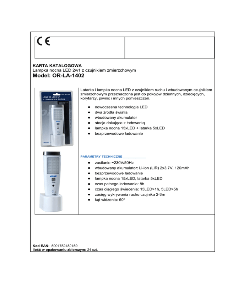 KARTA KATALOGOWA Lampka nocna LED 2w1 z czujnikiem zmierzchowym Model: OR-LA-1402 Latarka i lampka nocna LED z czujnikiem ruchu i wbudowanym czujnikiem zmierzchowym przeznaczona jest do pokojów dziennych, dziecięcych, korytarzy, piwnic i innych pomieszczeń. ● ● ● ● ● ● nowoczesna technologia LED dwa źródła światła wbudowany akumulator stacja dokująca z ładowarką lampka nocna 15xLED + latarka 5xLED bezprzewodowe ładowanie PARAMETRY TECHNICZNE _____________ ● ● ● ● ● ● ● ● zasilanie ~230V/50Hz wbudowany akumulator: Li-ion (LIR) 2x3,7V, 120mAh bezprzewodowe ładowanie lampka nocna 15xLED, latarka 5xLED czas pełnego ładowania: 8h czas ciągłego świecenia: 15LED>1h, 5LED>5h zasięg wykrywania ruchu czujnika 2-3m kąt widzenia: 600 Kod EAN: 5901752482159 ilość w opakowaniu zbiorczym: 24 szt.