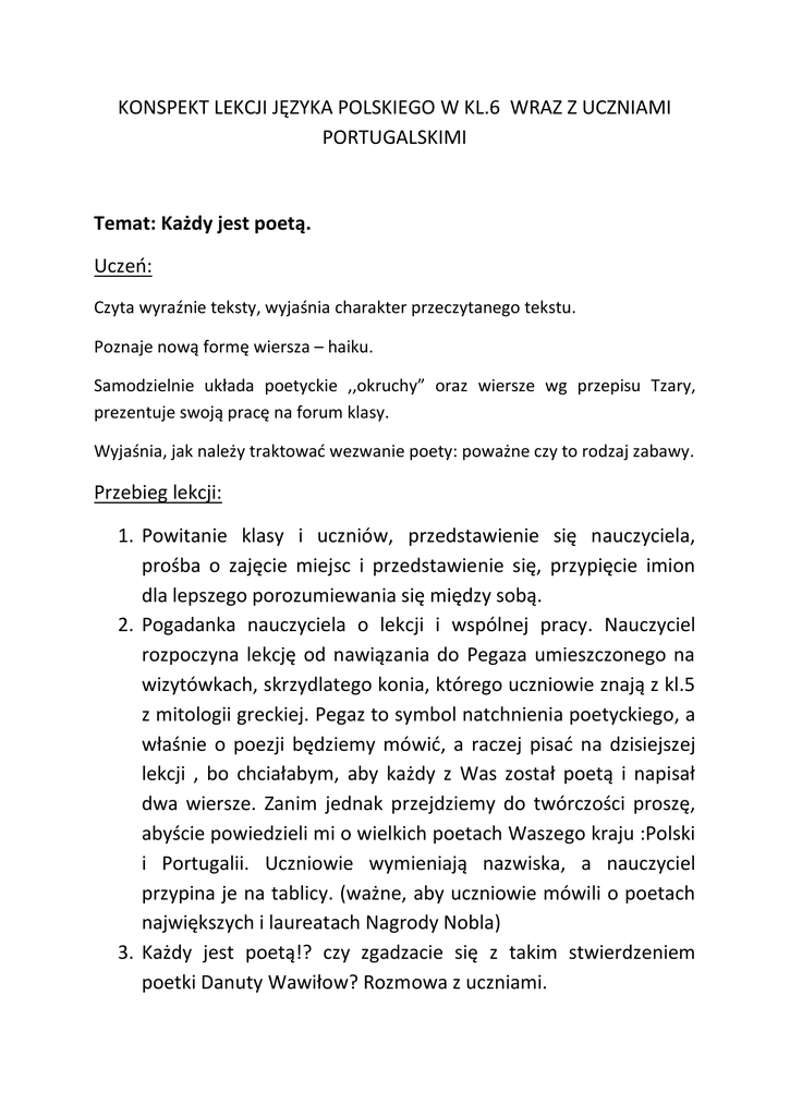 KONSPEKT LEKCJI JĘZYKA POLSKIEGO W KL.6 WRAZ Z UCZNIAMI PORTUGALSKIMI Temat: Każdy jest poetą. Uczeń: Czyta wyraźnie teksty, wyjaśnia charakter przeczytanego tekstu. Poznaje nową formę wiersza – haiku. Samodzielnie układa poetyckie ,,okruchy” oraz wiersze wg przepisu Tzary, prezentuje swoją pracę na forum klasy. Wyjaśnia, jak należy traktować wezwanie poety: poważne czy to rodzaj zabawy. Przebieg lekcji: 1. Powitanie klasy i uczniów, przedstawienie się nauczyciela, prośba o zajęcie miejsc i przedstawienie się, przypięcie imion dla lepszego porozumiewania się między sobą. 2. Pogadanka nauczyciela o lekcji i wspólnej pracy. Nauczyciel rozpoczyna lekcję od nawiązania do Pegaza umieszczonego na wizytówkach, skrzydlatego konia, którego uczniowie znają z kl.5 z mitologii greckiej. Pegaz to symbol natchnienia poetyckiego, a właśnie o poezji będziemy mówić, a raczej pisać na dzisiejszej lekcji , bo chciałabym, aby każdy z Was został poetą i napisał dwa wiersze. Zanim jednak przejdziemy do twórczości proszę, abyście powiedzieli mi o wielkich poetach Waszego kraju :Polski i Portugalii. Uczniowie wymieniają nazwiska, a nauczyciel przypina je na tablicy. (ważne, aby uczniowie mówili o poetach największych i laureatach Nagrody Nobla) 3. Każdy jest poetą!? czy zgadzacie się z takim stwierdzeniem poetki Danuty Wawiłow? Rozmowa z uczniami. 4. Wprowadzenie pojęcia haiku krótkiej bezrymowej formy wiersza japońskiego, pokazanie uczniom jak zapisuje się słowo haiku w języku japońskim, wyjaśnienie istoty haiku czyli 3-5 wersów ulotnych myśli zapisanych na karteczkach. 5. Rozdanie uczniom karteczek, aby na nich ułożyli własne haiku w swoim ojczystym języku, po 5 minutach uczniowie wszyscy odczytują swoje wiersze –,,okruchy” i przylepiają je do sztalugi. 6. Przeczytanie wiersza Tristana Tzary w języku polskim i angielskim. 7. Rozdanie uczniom gazet, nożyczek, z prośbą o ułożenie wiersza wg przepisu Tristana Tzary. 8. Po 15 minutach uczniowie prezentują swoje poetyckoplastyczne dzieła i przypinają do drugiej sztalugi. 9. Na zakończenie n-l prosi o wyrecytowanie dowolnych wierszy w języku gości i polskim. 10.Rozdanie uczniom krzyżówki jako zadania do domu i podziękowanie za wspólną pracę i zabawę. Materiały do lekcji FERNANDO PESSOA LUIS CAMOS ,,OS LUSIADAS” JOSE SARAMAGO-NAGRODA NOBLA Take a newspaper, Grab a scissors, Choose the article that will have length like the poem that you want to write Cut this article Carefully select the words Put them into a bag and gently shake Select a certain number of words Rewrite them carefully In the order in which the words had left the bag This poem will be your image Very original A beautiful sensitivity However- underrated