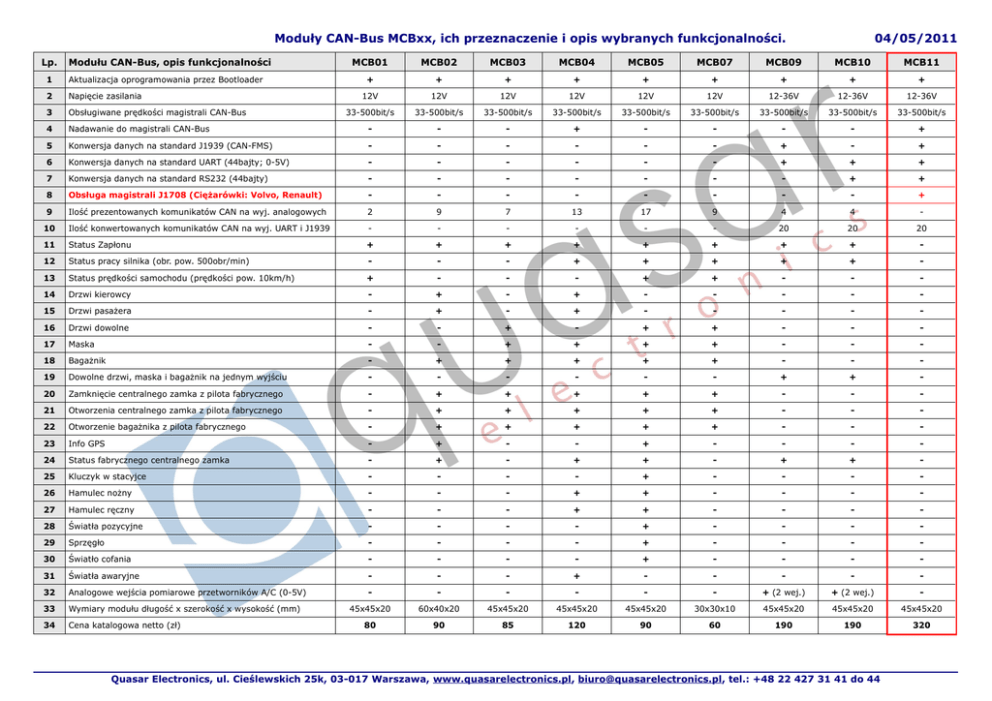 Moduły CAN-Bus MCBxx, ich przeznaczenie i opis wybranych funkcjonalności. Lp. Modułu CAN-Bus, opis funkcjonalności 1 Aktualizacja oprogramowania przez Bootloader 2 Napięcie zasilania 3 Obsługiwane prędkości magistrali CAN-Bus 4 5 04/05/2011 MCB01 MCB02 MCB03 MCB04 MCB05 MCB07 MCB09 MCB10 MCB11 + + + + + + + + + 12V 12V 12V 12V 12V 12V 12-36V 12-36V 12-36V 33-500bit/s 33-500bit/s 33-500bit/s 33-500bit/s 33-500bit/s 33-500bit/s 33-500bit/s 33-500bit/s 33-500bit/s Nadawanie do magistrali CAN-Bus - - - + - - - - + Konwersja danych na standard J1939 (CAN-FMS) - - - - - - + - + 6 Konwersja danych na standard UART (44bajty; 0-5V) - - - - - - + + + 7 Konwersja danych na standard RS232 (44bajty) - - - - - - - + + 8 Obsługa magistrali J1708 (Ciężarówki: Volvo, Renault) - - - - - - - - + 9 Ilość prezentowanych komunikatów CAN na wyj. analogowych 2 9 7 13 17 9 4 4 - 10 Ilość konwertowanych komunikatów CAN na wyj. UART i J1939 - - - - - - 20 20 20 11 Status Zapłonu + + + + + + + + - 12 Status pracy silnika (obr. pow. 500obr/min) - - - + + + + + - 13 Status prędkości samochodu (prędkości pow. 10km/h) + - - - + + - - - 14 Drzwi kierowcy - + - + - - - - - 15 Drzwi pasażera - + - + - - - - - 16 Drzwi dowolne - - + - + + - - - 17 Maska - - + + + + - - - 18 Bagażnik - + + + + + - - - 19 Dowolne drzwi, maska i bagażnik na jednym wyjściu - - - - - - + + - 20 Zamknięcie centralnego zamka z pilota fabrycznego - + + + + + - - - 21 Otworzenia centralnego zamka z pilota fabrycznego - + + + + + - - - 22 Otworzenie bagażnika z pilota fabrycznego - + + + + + - - - 23 Info GPS - + - - + - - - - 24 Status fabrycznego centralnego zamka - + - + + - + + - 25 Kluczyk w stacyjce - - - - + - - - - 26 Hamulec nożny - - - + + - - - - 27 Hamulec ręczny - - - + + - - - - 28 Światła pozycyjne - - - - + - - - - 29 Sprzęgło - - - - + - - - - 30 Światło cofania - - - - + - - - - 31 Światła awaryjne - - - + - - - - - 32 Analogowe wejścia pomiarowe przetworników A/C (0-5V) 33 Wymiary modułu długość x szerokość x wysokość (mm) 34 Cena katalogowa netto (zł) - - - - - - + (2 wej.) + (2 wej.) - 45x45x20 60x40x20 45x45x20 45x45x20 45x45x20 30x30x10 45x45x20 45x45x20 45x45x20 80 90 85 120 90 60 190 190 320 Quasar Electronics, ul. Cieślewskich 25k, 03-017 Warszawa, www.quasarelectronics.pl, [email protected], tel.: +48 22 427 31 41 do 44 Moduły CAN-Bus MCBxx, ich przeznaczenie i opis wybranych funkcjonalności. 04/05/2011 Lp. Typ modułu CAN-Bus 1 MCB01 Przeznaczenie jako moduł sterujący pracą czujników parkowania z przodu samochodu. Zastosowanie modułu sprawia, że zainstalowany nie oryginalny czujnik parkowania działa jak fabryczne. 2 MCB02 Przeznaczony do współpracy z alarmami nie współpracującymi z magistralą CAN-Bus. Systemy monitoringu GPS/GSM pojazdów. Zastosowanie modułu sprawia, że systemy analogowe mogą korzystać z informacji przesyłanych w magistrali CAN-Bus samochodu. 3 MCB03 Przeznaczony do współpracy z alarmami nie współpracującymi z magistralą CAN-Bus. Zastosowanie modułu sprawia, że systemy analogowe mogą korzystać z informacji przesyłanych w magistrali CAN-Bus samochodu. 4 MCB04 Przeznaczony do współpracy z alarmami typu „2-way” nie współpracującymi z magistralą CAN-Bus . Moduł ma możliwość sterowania poprzez wysyłanie komend do magistrali CAN-Bus samochodu: centralnym zamkiem, domykaniem szyb, światłami awaryjnymi (zależnie od marki i typu samochodu). Systemy monitoringu GPS/GSM pojazdów. Zastosowanie modułu sprawia, że systemy analogowe mogą korzystać z informacji przesyłanych w magistrali CAN-Bus samochodu. 5 MCB05 Przeznaczony do współpracy z alarmami nie współpracującymi z magistralą CAN-Bus. Systemy monitoringu GPS/GSM pojazdów. Systemy zdalnego uruchamiania silnika. Zastosowanie modułu sprawia, że systemy analogowe mogą korzystać z informacji przesyłanych w magistrali CAN-Bus samochodu. 6 MCB07 Miniaturowy moduł przeznaczony do wewnętrznej instalacji w urządzeniach (wymaga zainstalowania wewnętrznego konektora do wpięcia modułu) typu alarmami nie współpracującymi z magistralą CAN-Bus lub systemy monitoringu GPS/GSM pojazdów. Zastosowanie modułu sprawia, że systemy analogowe mogą korzystać z informacji przesyłanych w magistrali CAN-Bus samochodu. 7 MCB09 Moduł pełni funkcję multi translatora magistral CAN-Bus samochodów osobowych na standard J1939 (CAN-FMS) stosowany w samochodach ciężarowych. Aktualnie posiada możliwość współpracy z silnikami diesla firmy Cummins. Zastosowanie modułu sprawia, że dane telemetryczne (dystans, prędkość, obroty, poziom paliwa, itp) z samochodu osobowego mogą być odbierane przez systemy GPS/GSM wyposażone w wejście CAN-FMS (J1939) i przesyłane na serwer systemu analizy danych eksploatacyjnych. 8 MCB10 Moduł o funkcjonalności MCB09 ale dane wystawia na porcie szeregowym RS232. 9 MCB11 Moduł odbierający dane eksploatacyjne z magistrali J1708 (ciężarówki: Volvo i Renault) i J1939 (CAN-FMS) następnie odebrane dane konwertuje na standard J1939 (CAN-FMS) oraz na format danych RS232 i UART (44bajty; 0-5V). Moduł odbiera z magistrali J1708 3 parametry : Totalne zużycie paliwa, Poziom paliwa, Totalne motogodziny. Lp. Opis przeznaczenia i zastosowania Wybrane funkcjonalności modułu Opis szczegółowy funkcjonalności 1 Aktualizacja oprogramowania przez Bootloader Wszystkie produkty CAN-Bus posiadają możliwość współpracy z Bootloader'em. Za pośrednictwem bootloader'a można aktualizować oprogramowanie modułu. Nowe oprogramowanie zawiera dodane nowe samochody oraz usunięte ewentualne błędy w stosunku do poprzedniej wersji. 2 Obsługiwane prędkości magistrali CAN-Bus Moduły obsługują prędkości potocznie nazywane CAN low speed i CAN high speed 3 Nadawanie do magistrali CAN-Bus Wysyłanie komend CAN mających na celu wymuszenie aktywowanie wybranej funkcji samochodu. 4 Konwersja danych na standard J1939 (CAN-FMS) Standard