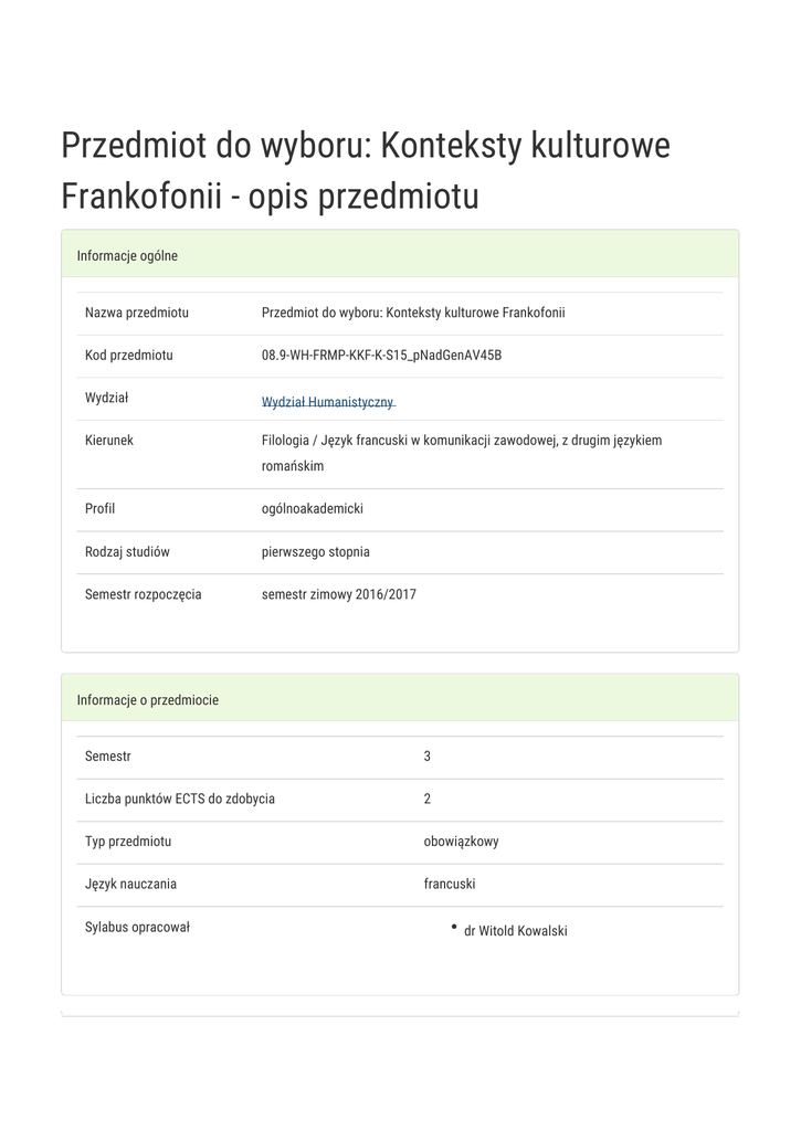 Przedmiot do wyboru: Konteksty kulturowe Frankofonii - opis przedmiotu Informacje ogólne Nazwa przedmiotu Przedmiot do wyboru: Konteksty kulturowe Frankofonii Kod przedmiotu 08.9-WH-FRMP-KKF-K-S15_pNadGenAV45B Wydział Wydział Humanistyczny Kierunek Filologia / Język francuski w komunikacji zawodowej, z drugim językiem romańskim Profil ogólnoakademicki Rodzaj studiów pierwszego stopnia Semestr rozpoczęcia semestr zimowy 2016/2017 Informacje o przedmiocie Semestr 3 Liczba punktów ECTS do zdobycia 2 Typ przedmiotu obowiązkowy Język nauczania francuski Sylabus opracował dr Witold Kowalski Formy zajęć Forma zajęć Konwersatorium Liczba godzin Liczba godzin Liczba godzin w Liczba godzin w Forma w semestrze w tygodniu semestrze tygodniu zaliczenia (stacjonarne) (stacjonarne) (niestacjonarne) (niestacjonarne) 30 2 - - Zaliczenie na ocenę Cel przedmiotu Wspomaganie rozwoju osobowego i wdrażanie do skutecznej komunikacji z przedstawicielami innych kultur. Rozwijanie kompetencji interkulturowej poprzez poznanie socjolingwistycznych reguł występujących w społeczeństwach francuskojęzycznych oraz kształtowanie umiejętności refleksji nad ich wartościami. Nabycie podstawowej wiedzy o dorobku kulturowym wybranych krajów frankofońskich. Wymagania wstępne Znajomość języka francuskiego co najmniej na poziomie A2. Zakres tematyczny Kultura krajów francuskojęzycznych: film, prasa, literatura ustna i pisana, polityka, sztuka, muzyka, malarstwo, filozofia, etc. Tematy z życia codziennego. Tematy popularnonaukowe. Kwestie społeczne i kulturowe, np. postkolonializm, kwestia migracji, konsekwencje Rewolucji Francuskiej, etc.. Związki między kulturą krajów francuskojęzycznych a kulturą polską. Metody kształcenia Wykład informacyjny i syntetyczny, praca z tekstem źródłowym, praca z tekstem literackim i popularnonaukowym, dyskusja, burza mózgów. Efekty kształcenia i metody weryfikacji osiągania efektów kształcenia Opis efektu Symbole efektów Metody Forma zajęć weryfikacji Posiada umiejętność tworzenia tekstów KN1_U09 praca pisemnych w języku polskim i francuskim na pisemna podstawie literatury przedmiotu. dyskusja Konwersatorium bieżąca kontrola Posiada umiejętność przygotowania KN1_U11 referat wystąpień ustnych na tematy życia dyskusja codziennego oraz kwestie poruszane bieżąca podczas zajęć w języku polskim i w języku kontrola Konwersatorium francuskim. Wykazuje się umiejętnościami badawczymi KN1_U02 dyskusja jak: formułowanie i analiza problemów, bieżąca dobór metod i opracowanie oraz prezentacja kontrola Konwersatorium rezultatów. Posiada umiejętność przygotowania KN1_U10 referat wyczerpujących wystąpień ustnych na temat dyskusja szeroko pojętej kultury frankofońskiej z bieżąca wykorzystaniem podstawowych informacji i kontrola Konwersatorium korzystając z literatury przedmiotu. Student ma usystematyzowaną wiedzę o KN1_W04 dyskusja strukturze języka francuskiego oraz bieżąca podstawowe wiadomości na temat jego kontrola historii. Konwersatorium Opis efektu Potrafi pozyskiwać informacje z różnych Symbole efektów Metodyweryfikacji KN1_U01 Forma zajęć dyskusja źródeł dotyczące kultury francuskojęzycznej, bieżąca analizować je, oceniać, selekcjonować i kontrola Konwersatorium wykorzystywać we właściwy sposób. Potrafi przeprowadzić analizę tekstu, czy KN1_U05 dyskusja innego dokumentu, uwzględniając przy tym bieżąca kontekst społeczny i historyczno-kulturowy. kontrola Ma umiejętność logicznej rzeczowej KN1_U07 Konwersatorium praca argumentacji, z uwzględnieniem różnych pisemna poglądów i punktów widzenia, a także dyskusja formułowania wniosków i samodzielnych bieżąca sądów w języku polskim i francuskim kontrola Konwersatorium dotyczących poruszanej tematyki. Warunki zaliczenia Student otrzymuje zaliczenie z oceną na podstawie prezentacji ustnej i pisemnej pracy zaliczeniowej. Brane pod uwagę jest również przygotowanie do zajęć i aktywny w nich udział oraz obecność na zajęciach. Obciążenie pracą Obciążenie pracą Studia Studia niestacjonarne stacjonarne (w godz.) (w godz.) Godziny kontaktowe (udział w zajęciach; konsultacjach; egzaminie, itp.) 35 - Samodzielna praca studenta (przygotowanie do: zajęć, kolokwium, 15 - Łącznie 50 - Punkty ECTS Studia Studia niestacjonarne egzaminu; studiowanie literatury przygotowanie: pracy pisemnej, projektu, prezentacji, raportu, wystąpienia; itp.) stacjonarne Zajęcia z udziałem nauczyciela akademickiego 1 - Zajęcia bez udziału nauczyciela akademickiego 1 - Łącznie 2 - Literatura podstawowa 1. J. Barrat, C. Moisei, Géopolitique de la Francophonie, La Documentation française, 2004. 2. Kowalski, Jacek, Dzieje kultury francuskiej, Wydawnictwo Naukowe PWN, Warszawa, 2005. 3. B. Lecharbonnier, D. Rincé, P. Brunel, Ch. Moati, Littérature XXe siècle. Textes et documents, Nathan, Paris, 2001. 4. Littératures francophones du monde arabe, Nathan, Paris,1994. 5. M. Tétu, La Francophonie, Hachette, Paris, 1988. Literatura uzupełniająca Dokumenty prasowe aktualizowane na bieżąco. Uwagi Zmodyfikowane przez dr Witold Kowalski (ostatnia modyfikacja: 24-08-2016 16:18)