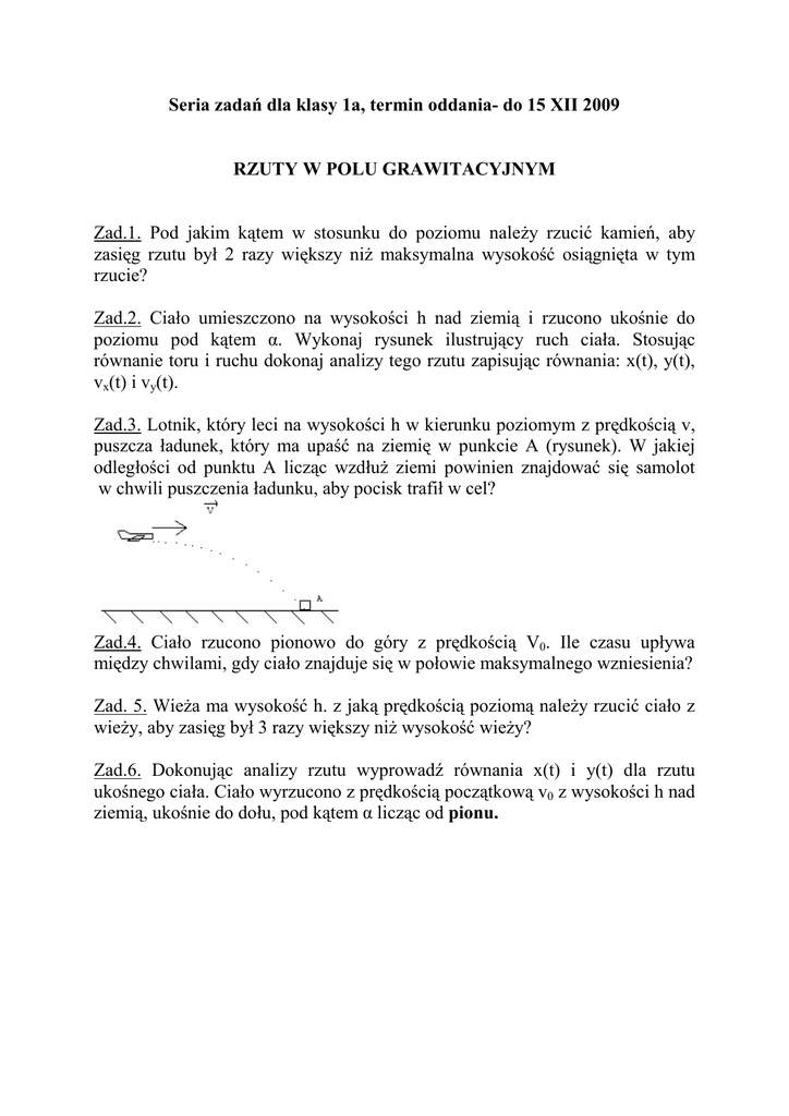 Seria zadań dla klasy 1a, termin oddania- do 15 XII 2009 RZUTY W POLU GRAWITACYJNYM Zad.1. Pod jakim kątem w stosunku do poziomu należy rzucić kamień, aby zasięg rzutu był 2 razy większy niż maksymalna wysokość osiągnięta w tym rzucie? Zad.2. Ciało umieszczono na wysokości h nad ziemią i rzucono ukośnie do poziomu pod kątem α. Wykonaj rysunek ilustrujący ruch ciała. Stosując równanie toru i ruchu dokonaj analizy tego rzutu zapisując równania: x(t), y(t), vx(t) i vy(t). Zad.3. Lotnik, który leci na wysokości h w kierunku poziomym z prędkością v, puszcza ładunek, który ma upaść na ziemię w punkcie A (rysunek). W jakiej odległości od punktu A licząc wzdłuż ziemi powinien znajdować się samolot w chwili puszczenia ładunku, aby pocisk trafił w cel? Zad.4. Ciało rzucono pionowo do góry z prędkością V0. Ile czasu upływa między chwilami, gdy ciało znajduje się w połowie maksymalnego wzniesienia? Zad. 5. Wieża ma wysokość h. z jaką prędkością poziomą należy rzucić ciało z wieży, aby zasięg był 3 razy większy niż wysokość wieży? Zad.6. Dokonując analizy rzutu wyprowadź równania x(t) i y(t) dla rzutu ukośnego ciała. Ciało wyrzucono z prędkością początkową v0 z wysokości h nad ziemią, ukośnie do dołu, pod kątem α licząc od pionu.