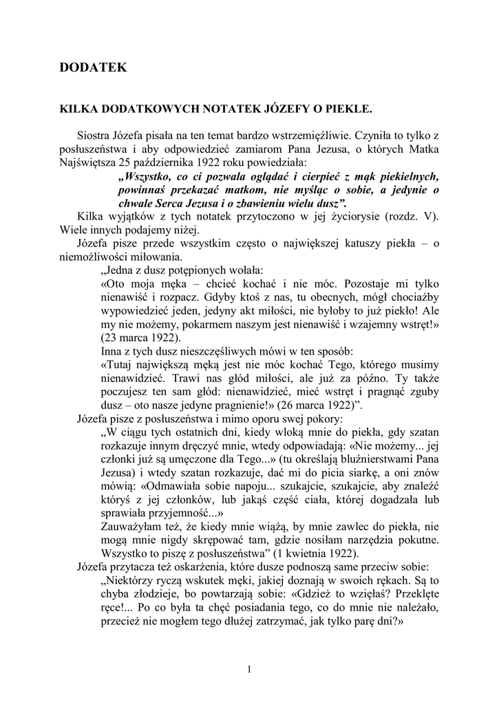 DODATEK KILKA DODATKOWYCH NOTATEK JÓZEFY O PIEKLE. Siostra Józefa pisała na ten temat bardzo wstrzemięźliwie. Czyniła to tylko z posłuszeństwa i aby odpowiedzieć zamiarom Pana Jezusa, o których Matka Najświętsza 25 października 1922 roku powiedziała: „Wszystko, co ci pozwala oglądać i cierpieć z mąk piekielnych, powinnaś przekazać matkom, nie myśląc o sobie, a jedynie o chwale Serca Jezusa i o zbawieniu wielu dusz”. Kilka wyjątków z tych notatek przytoczono w jej życiorysie (rozdz. V). Wiele innych podajemy niżej. Józefa pisze przede wszystkim często o największej katuszy piekła – o niemożliwości miłowania. „Jedna z dusz potępionych wołała: «Oto moja męka – chcieć kochać i nie móc. Pozostaje mi tylko nienawiść i rozpacz. Gdyby ktoś z nas, tu obecnych, mógł chociażby wypowiedzieć jeden, jedyny akt miłości, nie byłoby to już piekło! Ale my nie możemy, pokarmem naszym jest nienawiść i wzajemny wstręt!» (23 marca 1922). Inna z tych dusz nieszczęśliwych mówi w ten sposób: «Tutaj największą męką jest nie móc kochać Tego, którego musimy nienawidzieć. Trawi nas głód miłości, ale już za późno. Ty także poczujesz ten sam głód: nienawidzieć, mieć wstręt i pragnąć zguby dusz – oto nasze jedyne pragnienie!» (26 marca 1922)”. Józefa pisze z posłuszeństwa i mimo oporu swej pokory: „W ciągu tych ostatnich dni, kiedy wloką mnie do piekła, gdy szatan rozkazuje innym dręczyć mnie, wtedy odpowiadają: «Nie możemy... jej członki już są umęczone dla Tego...» (tu określają bluźnierstwami Pana Jezusa) i wtedy szatan rozkazuje, dać mi do picia siarkę, a oni znów mówią: «Odmawiała sobie napoju... szukajcie, szukajcie, aby znaleźć któryś z jej członków, lub jakąś część ciała, której dogadzała lub sprawiała przyjemność...» Zauważyłam też, że kiedy mnie wiążą, by mnie zawlec do piekła, nie mogą mnie nigdy skrępować tam, gdzie nosiłam narzędzia pokutne. Wszystko to piszę z posłuszeństwa” (1 kwietnia 1922). Józefa przytacza też oskarżenia, które dusze podnoszą same przeciw sobie: „Niektórzy ryczą wskutek męki, jakiej doznają w swoich rękach. Są to chyba złodzieje, bo powtarzają sobie: «Gdzież to wzięłaś? Przeklęte ręce!... Po co była ta chęć posiadania tego, co do mnie nie należało, przecież nie mogłem tego dłużej zatrzymać, jak tylko parę dni?» 1 Inni oskarżają swój język, swe oczy... każdy to, co było powodem do grzechu: «Drogo teraz płacisz, moje ciało, za te przyjemności, któreś sobie sprawiało... i samoś tego chciało!» (2 kwietnia 1922). Zdaje mi się, że dusze oskarżają się zwłaszcza z grzechów przeciw czystości, z kradzieży, z niesprawiedliwości w sprawach pieniężnych i że większość jest za to potępiona” (6 kwietnia 1922). Widziałam dużo dusz osób światowych, jak spadały w tę przepaść i nie sposób wyrazić, ani zrozumieć jak krzyczały i ryczały natychmiast przerażającym głosem: «Wieczne przekleństwo!... omyliłem się, zgubiłem się... jestem tu na zawsze... nie ma już ratunku... jesteś przeklęty!» I jedni oskarżali jakąś osobę, inni jakąś okoliczność, a wszyscy – okazję swego upadku (wrzesień 1922). Dzisiaj widziałam wielką ilość dusz spadających do piekła; myślę, że były to osoby światowe. Szatan wołał: «Teraz jest dla mnie stosowna chwila do działania. Znam najlepszy środek, aby pochwycić dusze! Trzeba obudzić w nich chęć użycia. Nie!... ja pierwsza... ja przede wszystkim! Zwłaszcza nie dopuścić do pokory, ale zachęcić do użycia. Oto, co zapewnia mi zwycięstwo i co je tu sprowadza w tak wielkiej ilości!» (4 października 1922). Słyszałam, jak szatan, któremu wymknęła się pewna dusza, musiał wyznać swą bezsilność: «Wstyd! Wstyd! Jak to, tyle dusz mi się wymyka? Były przecież moje! (i tu wyliczał ich grzechy). Pracuję bez wytchnienia, a jednak mi się wymykają. To dlatego, że ktoś za nie cierpi i wynagradza!» (15 stycznia 1923). Tej nocy nie byłam w piekle, ale przeniesiono mnie do jakiegoś miejsca, gdzie nie było żadnego światła, tylko w środku płonęło coś w rodzaju ogniska. Położono mnie i związano tak, że nie mogłam się ruszyć. Koło mnie znajdowało się siedmiu, czy ośmiu osobników, bez ubrania; ich czarne ciała oświetlał tylko odblask ognia. Wszyscy siedzieli i rozmawiali. Jeden mówił: «Trzeba wielkiej ostrożności, aby nie rozpoznali naszej ręki, bo wtedy łatwo się spostrzegą i poznają, że to my». Szatan odpowiedział: «Możecie wejść przez obojętność religijną; tak, myślę, że tych możecie – oczywiście maskując się, żeby się nie spostrzegli – uczynić obojętnymi na dobro i zło i tak powoli skłaniać ich wolę do złego. W innych wzbudzajcie ambicję, niech szukają jedynie własnego interesu, jedynie powiększenia majątku, nie oglądając się, czy to godziwe, czy nie. W tych znowu obudźcie zamiłowanie do przyjemności i zmysłowości. Niech występek ich zaślepi! (Tu użył wstrętnych słów.) Do tamtych wchodźcie przez serce; wiecie do czego skłaniają się serca... idźcie... idźcie śmiało... niech kochają! Niech się roznamiętniają! Tylko mi dobrze pracujcie, bez wytchnienia, bez litości, trzeba zgubić świat... i niech mi się tylko dusze te nie wymkną!» 2 A inni odpowiadali od czasu do czasu: «My twoi niewolnicy... będziemy pracowali bez wytchnienia. Tak, wielu walczy z nami, ale my będziemy pracowali dzień i noc bez przestanku. Uznajemy twoją potęgę». Itd. W ten sposób wszyscy sobie rozmawiali, a ten, który zdaje mi się był szatanem, wymawiał obrzydliwe słowa. Z oddali słyszałam jakby brzęk kielichów i szklanek, a on wołał: «Pozwólcie im się objadać!... potem już wszystko będzie łatwe... Niech ci, co tak lubią używać, skończą swoją ucztę. To brama, przez którą wejdziecie». Dod
