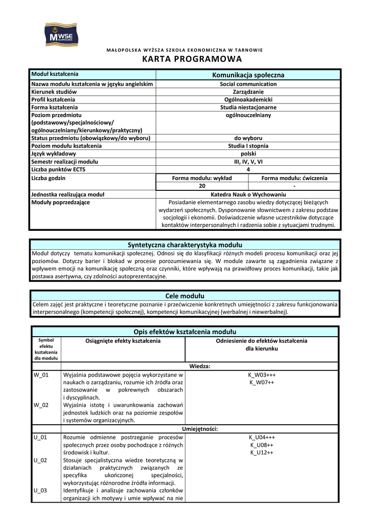 MAŁOP OLSKA WYŻSZ A SZ KOŁA E KONOMICZNA W TARN OW IE KARTA PROGRAMOWA Moduł kształcenia Komunikacja społeczna Nazwa modułu kształcenia w języku angielskim Kierunek studiów Profil kształcenia Forma kształcenia Poziom przedmiotu (podstawowy/specjalnościowy/ ogólnouczelniany/kierunkowy/praktyczny) Status przedmiotu (obowiązkowy/do wyboru) Poziom modułu kształcenia Język wykładowy Semestr realizacji modułu Liczba punktów ECTS Liczba godzin Jednostka realizująca moduł Moduły poprzedzające Social communication Zarządzanie Ogólnoakademicki Studia niestacjonarne ogólnouczelniany do wyboru Studia I stopnia polski III, IV, V, VI 4 Forma modułu: wykład Forma modułu: ćwiczenia 20 Katedra Nauk o Wychowaniu Posiadanie elementarnego zasobu wiedzy dotyczącej bieżących wydarzeń społecznych. Dysponowanie słownictwem z zakresu podstaw socjologii i ekonomii. Doświadczenie własne uczestników dotyczące kontaktów interpersonalnych i radzenia sobie z sytuacjami trudnymi. Syntetyczna charakterystyka modułu Moduł dotyczy tematu komunikacji społecznej. Odnosi się do klasyfikacji różnych modeli procesu komunikacji oraz jej poziomów. Dotyczy barier i blokad w procesie porozumiewania się. W module zawarte są zagadnienia związane z wpływem emocji na komunikację społeczną oraz czynniki, które wpływają na prawidłowy proces komunikacji, takie jak postawa asertywna, czy zdolności autoprezentacyjne. Cele modułu Celem zajęć jest praktyczne i teoretyczne poznanie i przećwiczenie konkretnych umiejętności z zakresu funkcjonowania interpersonalnego (kompetencji społecznej), kompetencji komunikacyjnej (werbalnej i niewerbalnej). Opis efektów kształcenia modułu Symbol efektu kształcenia dla modułu Osiągnięte efekty kształcenia Odniesienie do efektów kształcenia dla kierunku Wiedza: W_01 W_02 U_01 U_02 U_03 Wyjaśnia podstawowe pojęcia wykorzystane w naukach o zarządzaniu, rozumie ich źródła oraz zastosowanie w pokrewnych obszarach i dyscyplinach. Wyjaśnia istotę i uwarunkowania zachowań jednostek ludzkich oraz na poziomie zespołów i systemów organizacyjnych. Umiejętności: Rozumie odmienne postrzeganie procesów społecznych przez osoby pochodzące z różnych środowisk i kultur. Stosuje specjalistyczna wiedze teoretyczną w działaniach praktycznych związanych ze specyfika ukończonej specjalności, wykorzystując różnorodne źródła informacji. Identyfikuje i analizuje zachowania członków organizacji ich motywy i umie wpływać na nie K_W03+++ K_W07++ K_U04+++ K_U08++ K_U12++ w określonym zakresie. K_01 Kompetencje społeczne: Potrafi dokonać analizy własnych działań i wskazać ewentualne obszary wymagające modyfikacji w przyszłym działaniu. K_K01++ Treści kształcenia modułu Forma modułu: wykład Komunikowanie się: nawiązywanie relacji interpersonalnych, umiejętności pozyskiwania informacji. Czytelne, jasne nadawanie komunikatu, bariery komunikacyjne, zasady aktywnego słuchania, rola empatii w relacjach międzyludzkich, istota sygnałów niewerbalnych w komunikowaniu się. Komunikacja w grupie: budowanie relacji w zespole, nawiązywanie współpracy grupowej, przyjmowanie ról grupowych, ćwiczenie umiejętności komunikacyjnych w grupie. Doskonalenie umiejętności autoprezentacji w grupie, wpływ informacji zwrotnych na doskonalenie kompetencji komunikacyjnych. Wykorzystanie umiejętności komunikacyjnych w praktyce: nawiązywanie kontaktu z klientem, wykorzystanie kompetencji komunikacyjnych w pracy z uczniem, rozwijanie umiejętności pracy z grupą uczniów, podopiecznych, przećwiczenie umiejętności komunikacyjnych oraz poznanie swoich mocnych i słabych stron w tym zakresie Literatura podstawowa Literatura uzupełniająca Forma modułu: ćwiczenia 1. Aryle M., Psychologia stosunków międzyludzkich. Warszawa. 2000. 2. Sobczak-Matysiak J. Psychologia kontaktu z klientem. Poznań 1998. 3. Tease A. Mowa ciała. Kielce 2001 4. Nęcki Z. Komunikowanie interpersonalne. Wrocław. 1994 5. Nęcki Z. Komunikacja międzyludzka. 1996. Kraków.PSB 6. Pease A, Pease B. Mowa ciała. 2009. Poznań. REBIS 7. Leary M. Wywieranie wrażenia na innych.1999. Gdańsk. GWP 1. Aronson E., Wilson T., Akert R. Psychologia społeczna. Poznań, Zysk i S-ka. 1997 2. Marszał-Wiśniewska M., Klonowicz T., Fajkowska-Stanik M., Psychologia różnic indywidualnych. Wybrane zagadnienia. Gdańsk 2003 3. Sujak. E. A B C psychologii komunikacji. Karaków WAM 2000 4. Wojcieszke B. Procesy oceniania ludzi. Poznań 1991 5. F. Schultz von Hun. Sztuka rozmawiania. W porozumieniu z sobą i innymi komunikacja i kompetencje społeczne. 2006. Kraków. WAM Metody dydaktyczne Wykład, prezentacja multimedialna.