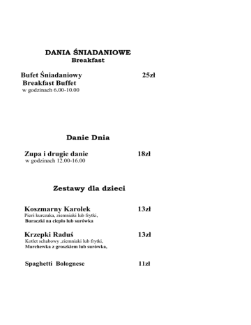 DANIA ŚNIADANIOWE Breakfast Bufet Śniadaniowy Breakfast Buffet 25zł w godzinach 6.00-10.00 Danie Dnia Zupa i drugie danie 18zł w godzinach 12.00-16.00 Zestawy dla dzieci Koszmarny Karolek 13zł Pierś kurczaka, ziemniaki lub frytki, Buraczki na ciepło lub surówka Krzepki Raduś 13zł Kotlet schabowy ,ziemniaki lub frytki, Marchewka z groszkiem lub surówka, Spaghetti Bolognese 11zł PRZEKĄSKI ZIMNE Cold Starters Śledż w oleju lub śmietanie 120g 12zł 150g 22zł 150g 200g 18zł 25zł Herring in oil or sour-cream Befsztyk tatarski z ogórkiem i cebulą Polish traditional starter ! Minced Sirloin with onion and sour cucumber Sałatka grecka Półmisek wędlin Przekąski gorące Hot Starters Strogonoff 300g 15zł 300g 11zł 150g 10zł 2szt 16zł 300g 15zł 300g 9zł 300g 10zł 300g 6zł Beefstrogonoff Fasolka po bretońsku Beans Breton Style Pieczarki smażone Champignons saute Barszcz czerwony z krokietami Beetroot soup with croquettes ZUPY Soups Flaki wołowe Beef tripes Żurek z kiełbasą lub jajkiem Rye flour soup with sausage or egg Kwaśnica Sour cabbage soup cooked on ribs Zupa dnia Soup of the day DANIA OBIADOWE Main Dishes Dania z wieprzowiny Pork dishes Kotlet firmowy”RELAKS” 100g 29zł (schab z żółtym serem, siekaną szynką i ziemniakami opiekanymi w majeranku) Pork staffed with cheese and ham with marjoram potatoes Kotlet schabowy z ziemniakami lub frytkami i surówką 100g 18zł 220g 32zł Pork chop with potatoes(chips) and salad Polędwiczki wieprzowe w sosie beszamelowym z kolorowym pieprzem, gotowanymi warzywami i ryżem Żeberko w sosie z ziem.i surówką 150g 25zł Ribs in sauce with potatoes and salad Szaszłyk z ryżem i surówką 150g 19zł 5szt 14zł 100g 17zł 7zł 200g 21zł Kebab with rice and salad Pierogi domowe z mięsem Home-made perogie with meat Spaghetti Bolognese Golonka z kością gotowana Bone-in pork chop Placek po węgiersku Hungarian style potato cake in pork sauce Polędwica wieprzowa z pieczarkami, ryżem i surówką 150g 19zł Pork tenderloin with mushroom sauce Server with rice and salad Golonka familijna na 2 osoby z dodatkami 80zł Family bone-in pork chop with salad and potatoes Dania z wołowiny Beef dishes Befsztyk wołowy z pieczarkami, cebulką, surówką i ziemniakami 150g 41zł Beef steak served with mushroom,onions,potatoes and salad Dania z cielęciny Veal dishes 1 Sznycel cielęcy z jajkiem z ziemniakami i surówką Roasted veal served with egg potatoes and salad 150g 35zł Dania z drobiu Poultry dishes Antrykot z kurczaka 100g 21zł z ziemniakami lub frytkami i surówką Breaded chicken breast served with potatoes or fries and salad D’volaille z ziemniakami i surówką 100g Kaczka pieczona z jabłkami, 200g 22zł 34zł ziemniakami pieczonymi i buraczkami Roasted duck stuffed with apples and served with roasted potatoes and beets Filet kurczaka z grilla 100g 24zł 100g 22zł z ziemniakami lub frytkami i surówką Grilled chicken breast with potatoes and salad Kurczak po cygańsku z ziemniakami pieczonymi i surówką Fried chicken thigh in sause with roast potatoes and salad Dania wegetariańskie Vegetarian dishes Pierogi ruskie 5szt 14zł Home-made perogie with cheese, potatoes and onion Pierogi z serem na słodko 5szt 14zł 5szt 14zł 5szt 14zł Home-made perogie with cheese Pierogi z kapustą i grzybami Home-made perogie with meat Pierogi ze szpinakiem, serem białym i czosnkiem Home-made perogie with spinach, cheese and garlic Makaron ze szpinakiem i czosnkiem 12zł Pasta with spinach and garlic Plaster selera z kaszą gryczaną i surówką 14zł Slice celery with buckwheat and salad POLECAMY pierogi własnej produkcji różnego rodzaju na wynos opakowanie 600g 9,50zł Dodatki Extras Frytki 100g 6zł 200g 5zł 150g 7zł 150g 5zł 150g 5zł 100g 5zł 100g 6zł 100g 6zł 100g 6zł 100g 6zł 100g 6zł French fries Ziemniaki Potatoes Ziemniaki zapiekane z majerankiem Potatoes baked with marjoram Ryż Rice Kasza gryczana Buckwheat porrige Bukiet surówek Typical polish salad Kapusta zasmażana Stewed cabbage Marchewka z groszkiem Carrots and peas Buraczki zasmażane Stewed beetroots Mizeria ze śmietaną Cucumber salad with cream Surówka z pomidora Tomato salad with onions Dania z ryb Fish dishes Mintaj smażony frytki, surówka 200g 29zł 200g 32zł 200g 29zł 200g 37zł 200g 32zł 200g 37zł 200g 32zł Fried Pollock served with fries and salad Pstrąg smażony frytki,surówka Fried Trout served with fries and salad Łosoś smażony frytki, surówka Fried Salmon served with fries nad slad Szczupak smażony frytki,surówka Fried Pike served with fries and salad Dorsz smażony frytki,surówka Fried Sole served with fries and salad Sandacz smażony frytki, surówka Fried Zander served with fries and salad Łosoś z grilla frytki, surówka Grilled Salmon served with fries and salad Łosoś gotowany na parze 200g 32zł podany w sosie cytrynowokoperkowym z ziemniakami i warzywami Steamed Salmon served with potatoes and salad Napoje Drinks Kawa espresso 6zł Coffee Kawa z ekspresu z mlekiem Kawa Cappucino Kawa Latte Kawa mrożona 9zł 9zł 12zł 15zł Iced coffee Herbata z cytryną 5zł Hot Tea 4zł Napoje but. 0,2l (cola, fanta, sprite) Bottled drinks 0.2l 6zł Napoje but.0.5l (cola, fanta, sprite) Bottled drinks 0.5l Napoje 1 l (cola, fanta, sprite) Bottled drinks 1l 10zł Woda mineralna 0.5l 4zł Mineral water 0.5l Soki owocowe 200ml 4zł Orange juice Soki owocowe 1 l 12zł Orange juice Desery Desserts Lody pucharek 100g 15zł 100g 10zł Ice cream Sałatka owocowa Fruit salad Ciasto dnia Cake of the day 6zł Piwo Beer Żywiec beczkowe Żywiec Masne Cieczyńskie beczkowe (lokalny browar cieszyński ) 0.5l 0.30l 0.5l 0.30l 7zł 5zł 7zł 5zł Wina Wines 100ml butelka 30zł Wino musujące Sparkling wine Wino wytrawne czerwone lub białe 12zł 55zł 12zł 55zł Dry red or white wine Wino półwytrawne czerwone lub białe Semi dry red or white wine Koniaki Winiaki Cognac,Brandy 50ml Metaxa *** Stock Napoleon 12zł 11zł 11zł 