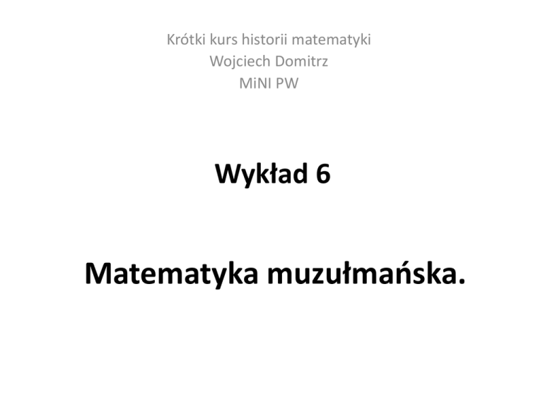 Krótki kurs historii matematyki Wojciech Domitrz MiNI PW Wykład 6 Matematyka muzułmańska. Mahomet (3.07.570-8.06.632) W. Domitrz Krótki kurs historii matematyki Islam W. Domitrz Krótki kurs historii matematyki Umar ibn al-Chattab, także Omar )( ) عمر بن الخطابok. 591-3.11.644) • Drugi kalif, drugi z czterech zwanych sprawiedliwymi • Jeden z twórców potęgi imperium arabskomuzułmańskiego • Nakazał zniszczyć zagarnięte w Iranie księgozbiory: Jeżeli księgi te zawierają prawdę, to my od Allaha mamy to, co jeszcze lepiej do niej prowadzi; jeżeli zawierają fałsz, to są niepotrzebne. W. Domitrz Krótki kurs historii matematyki Symetrie islamskie W. Domitrz Krótki kurs historii matematyki Dom Mądrości w Bagdadzie (بيت الحكمة, Bayt Ul-Hikma) • Założony przez kalifów z rodu Abbasydów Harun ar-Raszid (arab. )هارون الرشيد • Rozkwit Domu Madrości Al-Mamun (arab. )ابوجعفر عبدهللا المأمون W. Domitrz Krótki kurs historii matematyki Dom Mądrości w Bagdadzie (بيت الحكمة, Bayt Ul-Hikma) • Biblioteka Przetrwanie Elementów i Almagestu, dzieł hinduskich • Obserwatorium astronomiczne Wszystkie większe gwiazdy zmienne mają nazwy arabskie W. Domitrz Krótki kurs historii matematyki Najstarszy manustrypt naukowy z czasów Abbasydów lub manustrypt Baśni z tysiąca i jednej nocy Autor: Danieliness na wikipedia W. Domitrz Krótki kurs historii matematyki Baśnie z tysiąca i jednej nocy (IX-X w.) XIII w. W. Domitrz Krótki kurs historii matematyki Sułtan Szachrijar i Szeherezada W. Domitrz Krótki kurs historii matematyki Alibaba W. Domitrz Krótki kurs historii matematyki Abu Abdullah Muhammed ibn Musa al-Chwarizmi (()أبو عبد هللا محمد بن موسى الخوارزميok.780-ok.850) Pers z Domu Mądrości al-Chwarizmi pochodzi z Chorezmu Jeden z jego przydomków al-Mudżusi pochodzi z rodziny kapłanów Zoroastra - magów (po arabsku madżus) W. Domitrz Krótki kurs historii matematyki Al-Kitāb al-mukhtaṣar fī hīsāb al-ğabr wa’l-muqābala 'الكتاب المختصر في حساب الجبر والمقابلة W. Domitrz Krótki kurs historii matematyki Krótka księga o rachunku algebry i almukabały. W. Domitrz Krótki kurs historii matematyki al-ğabr i a’l-muqābala • • • • • x²+(10-x)²=58 2x²+100-20x=58 al-ğabr 2x²+100=58+20x al-ğabr (uzupełnienie) czyli w razie pojawienia się wyrazów o współczynnikach ujemnych dodawano wyrazy przeciwny do obu stron. • • • • 2x²+100=58+20x a’l-muqābala x²+21=10x a’lmuqābala (przeciwstawianie) czyli wyrazy podobne łączono w jeden i współczynnik przy x² sprowadzano do jedności. W. Domitrz Krótki kurs historii matematyki Rozwiązanie równania x²+ax=b x A A²=x²+B²+2Bx x²+2Bx=A²-B² a=2B, b=A²-B² B=a/2 A²=b+B²=b+a²/4 x=A-B B W. Domitrz Krótki kurs historii matematyki Dixit Algorizmi czyli Tako rzecze Al-chwarizmi lub Algoritmi de numero Indorum czyli Al-chwarizmi o rachunku Indyjskim tłumaczenie łacińskie Kitāb al-Jam wa-l-tafrīq bi-ḥisāb al-Hind W. Domitrz Krótki kurs historii matematyki Dixit Algorizmi • Kiedy zobaczyłem, że Hindusi zestawiali z dziewięciu liter każdą swą liczbę, dzięki położeniu jakie ustawili, zapragnąłem wyjawić, o ile to się spodoba Bogu, co otrzymuje się z tych liter, aby ułatwić to uczącemu się... • maleńkie kółko, podobne do o, aby po nim można było poznać, że rząd ... jest pusty. W. Domitrz Krótki kurs historii matematyki Ewolucja cyfr indyjsko-arabskich W. Domitrz Krótki kurs historii matematyki Al-Battani (łac. Albategnius, ar. أبو عبد هللا محمد بن جابر بن سنان الحراني الصابي البتاني) (855-923) Tablice kotangensów co jeden stopień, Wzory trygonometryczne: tg(x)=sin(x)/cos(x) cos(x)=sin(π/2-x) Rozwiązanie równania: sin(x)=a cos(x) W. Domitrz Krótki kurs historii matematyki Abu al-Wafa (940-998) • Tablice kotangensów co 15’, z wartościami do 8 cyfr po przecinku, wzór kosinusów dla geometrii sferycznej W. Domitrz Krótki kurs historii matematyki tłumaczenie łacińskie Al-Khwārizmī's Zīj al-Sindhind tablice trygonometryczne funkcji sinus i cosinus W. Domitrz Krótki kurs historii matematyki Omar Chajjam (31.05.1048-4.12.1131) • Po arabsku „fabrykant namiotów” • Równania trzeciego stopnia • Teoria równoległych • Poeta W. Domitrz Krótki kurs historii matematyki Omar Chajjam O dowodach zadań algebry (1074) Algebra to nauka o równaniach (algebraicznych). Badanie równań 3-go stopnia o dowolnych dodatnich współczynnikach. 14 klas kanonicznych równań. Dobieranie odpowiadających klasie par stożkowych i wyznaczanie możliwej liczby i granic pierwiastków. W. Domitrz Krótki kurs historii matematyki Omara Chajjama rozwiązanie równania 3 2 𝑥 + 𝑏𝑥 + 𝑐 = 𝑎𝑥 𝒃 𝒄 𝒃 𝒂 W. Domitrz Krótki kurs historii matematyki Omara Chajjama rozwiązanie równania 3 2 𝑥 + 𝑏𝑥 + 𝑐 = 𝑎𝑥 𝒃 𝒄 𝒃 𝒂 W. Domitrz Krótki kurs historii matematyki Omara Chajjama rozwiązanie równania 3 2 𝑥 + 𝑏𝑥 + 𝑐 = 𝑎𝑥 𝒅 𝒃 𝒄 𝒃 𝒂 W. Domitrz Krótki kurs historii matematyki Omara Chajjama rozwiązanie równania 3 2 𝑥 + 𝑏𝑥 + 𝑐 = 𝑎𝑥 𝒄𝒅 𝒅 𝒃 𝒃 𝒄 𝒃 𝒂 W. Domitrz Krótki kurs historii matematyki Omara Chajjama rozwiązanie równania 3 2 𝑥 + 𝑏𝑥 + 𝑐 = 𝑎𝑥 𝒄𝒅𝟐 𝒃 𝒚= 𝒄+ 𝒃 𝒙− 𝒃 𝒄𝒅 𝒅 𝒃 𝒃 𝒄 𝒃 𝒂 W. Domitrz Krótki kurs historii matematyki Omara Chajjama rozwiązanie równania 3 2 𝑥 + 𝑏𝑥 + 𝑐 = 𝑎𝑥 𝒙𝟏 𝒅 𝒄𝒅𝟐 𝒃 𝒚= 𝒄+ 𝒃 𝒙− 𝒃 𝒙𝟐 𝒃 𝒄 𝒃 𝒂 W. Domitrz Krótki kurs historii matematyki Omara Chajjama rozwiązanie równania 3 2 𝑥 + 𝑏𝑥 + 𝑐 = 𝑎𝑥 𝟐 𝒙𝟏 𝒅 𝒄𝒅 𝒃 𝒚= 𝒄+ 𝒃 𝒙− 𝒃 𝒙𝟐 𝒃 𝒄 𝒃