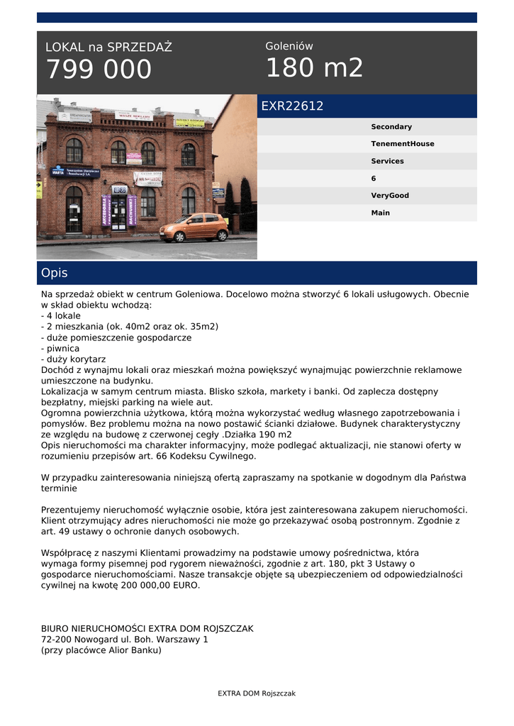 Goleniów LOKAL na SPRZEDAŻ 180 m2 799 000 EXR22612 Secondary TenementHouse Services 6 VeryGood Main Opis Na sprzedaż obiekt w centrum Goleniowa. Docelowo można stworzyć 6 lokali usługowych. Obecnie w skład obiektu wchodzą: - 4 lokale - 2 mieszkania (ok. 40m2 oraz ok. 35m2) - duże pomieszczenie gospodarcze - piwnica - duży korytarz Dochód z wynajmu lokali oraz mieszkań można powiększyć wynajmując powierzchnie reklamowe umieszczone na budynku. Lokalizacja w samym centrum miasta. Blisko szkoła, markety i banki. Od zaplecza dostępny bezpłatny, miejski parking na wiele aut. Ogromna powierzchnia użytkowa, którą można wykorzystać według własnego zapotrzebowania i pomysłów. Bez problemu można na nowo postawić ścianki działowe. Budynek charakterystyczny ze względu na budowę z czerwonej cegły .Działka 190 m2 Opis nieruchomości ma charakter informacyjny, może podlegać aktualizacji, nie stanowi oferty w rozumieniu przepisów art. 66 Kodeksu Cywilnego. W przypadku zainteresowania niniejszą ofertą zapraszamy na spotkanie w dogodnym dla Państwa terminie Prezentujemy nieruchomość wyłącznie osobie, która jest zainteresowana zakupem nieruchomości. Klient otrzymujący adres nieruchomości nie może go przekazywać osobą postronnym. Zgodnie z art. 49 ustawy o ochronie danych osobowych. Współpracę z naszymi Klientami prowadzimy na podstawie umowy pośrednictwa, która wymaga formy pisemnej pod rygorem nieważności, zgodnie z art. 180, pkt 3 Ustawy o gospodarce nieruchomościami. Nasze transakcje objęte są ubezpieczeniem od odpowiedzialności cywilnej na kwotę 200 000,00 EURO. BIURO NIERUCHOMOŚCI EXTRA DOM ROJSZCZAK 72-200 Nowogard ul. Boh. Warszawy 1 (przy placówce Alior Banku) EXTRA DOM Rojszczak www.extradom.net.pl tel./fax 91 392 22 33 Co robimy dla klienta zainteresowanego zakupem: * Sprawdzamy zdolność kredytową * Wyszukujemy odpowiednią nieruchomość, * Pomagamy w prowadzeniu negocjacji, * Pomagamy w uzyskaniu potrzebnych dokumentów * Pomagamy w uzyskaniu kredytu hipotecznego * Współpracujemy z kancelariami notarialnymi, geodetami Korzystając z naszych usług oszczędzasz swój czas, a także zyskujesz pewność, że Twoja transakcja zostanie przeprowadzona z należytą starannością, w sposób profesjonalny i co najważniejsze - BEZPIECZNY. Nr licencji pośredników: 21317, 21318 Marcin Rojszczak tel. 508 312 261 tel. (91) 392 22 33 email: [email protected] EXTRA DOM Rojszczak Powered by TCPDF (www.tcpdf.org)