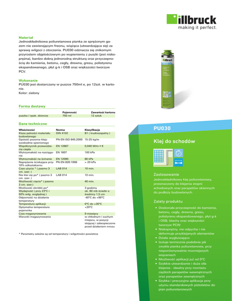 Materiał Jednoskładnikowa poliuretanowa pianka ze sprężonym gazem nie zawierającym freonu, wiążąca (utwardzająca się) za sprawą wilgoci z otoczenia. PU030 odznacza się znikomym przyrostem objętościowym po wypienieniu z puszki (jest niskoprężna), bardzo dobrą jednorodną strukturą oraz przyczepnością do kamienia, betonu, cegły, drewna, gresu, polistyrenu ekspandowanego, płyt g-k i OSB oraz większości tworzyw PCV. Wykonanie PU030 jest dostarczany w puszce 750ml e, po 12szt. w kartonie. Kolor: zielony Forma dostawy puszka / opak. zbiorcze Pojemność 750 ml Zawartość kartonu 12 sztuk Dane techniczne Właściwości Klasa palności materiału budowlanego Gęstość pozorna kleju swobodnie spienionego Współczynnik przewodzenia ciepła Wytrzymałość na rozciąganie Wytrzymałość na ścinanie Naprężenie ściskające przy 10% odkształceniu Czas użycia * ( pasmo 3 cm. szer. ) Nie klei się po* ( pasmo 3 cm. szer. ) Możliwość cięcia* ( pasmo 3 cm. szer.) Możliwość obróbki po* Wydajność ( przy 23°C i 50% wilg. względnej ) Odporność na działanie temperatury Temperatura aplikacji Optymalna temperatura pojemnika Czas magazynowania Warunki magazynowania Norma DIN 4102 Klasyfikacja B1 ( trudnozapalny ) PN-EN ISO 845:2000 15-25 kg/m EN 12667 0,040 W/m • K EN 1607 100 kPa EN 12090 PN-EN 826:1998 80 kPa > 20 kPa LAB 014 10 min. LAB 014 10 min. 40 min. 3 godziny ok. 80 mb ścieżki o średnicy 1,5 cm -40°C do +90°C 0°C do +35°C +20°C 9 miesięcy w chłodnym i suchym miejscu, w pozycji stojącej i zabezpieczone przed działaniem mrozu * Parametry zależne są od temperatury i wilgotności powietrza PU030 Klej do schodów Zastosowanie Jednoskładnikowy klej poliuretanowy, przeznaczony do klejenia stopni schodowych oraz parapetów okiennych do podłoży budowlanych. Zalety produktu • Doskonała przyczepność do kamienia, betonu, cegły, drewna, gresu, polistyrenu ekspandowanego, płyt g-k i OSB, blachy oraz większości tworzyw PCW • Niskoprężny, nie odpycha i nie deformuje przyklejanych elementów • Działa wygłuszająco • Izoluje termicznie podobnie jak zwykła pianka poliuretanowa, przy nieporównywalnie mocniejszych wiązaniach • Możliwość aplikacji już od 0°C • Szybkie utwardzanie i duża siła klejenia - idealny przy montażu ciężkich parapetów wewnętrznych oraz parapetów zewnętrznych • Szybka i precyzyjna aplikacja przy użyciu standardowych pistoletów do pian poliuretanowych PU030 Klej do schodów Przygotowanie • Powierzchnie należy oczyścić z substancji i materiałów pogarszających przyczepność (tłuszcze, środki bitumiczne itp.). • Na podłożach w okresie niższych temperatur nie może znajdować się szron lub lód. • Powierzchnie należy przed aplikacją zwilżyć przy użyciu spryskiwacza. • Najlepszą przyczepność uzyskuje się na powierzchniach porowatych, z dostępnem wilgoci wymaganej do utwardzenia pianki. Ilustracja 1: Przynajmniej 20 razy silnie potrząsnąć puszką Użycie • Przed użyciem, piankę należy energicznie wstrząsnąć co najmniej 20 razy. • Zdjąć nakrywkę ochronną z pojemnika i umieścić koncówkę z gwintem w uchwycie pistoletu do pianki. Klej PU030 aplikować na obwodzie stopnia schodowego czy parapetu w odległości około 2 cm od krawędzi, a następnie w części środkowej. Pojemnik z pianką podczas aplikacji powinien być skierowany zaworem do dołu. • Przedmiot klejony z niewielką siłą docisnąć do podłoża a następnie skorygować położenie przy pomocy łaty. • W przypadku prowadzenia prac podczas złych warunków atmosferycznych (deszcz, wiatr) należy bezwzględnie zabezpieczyć rejon prac osłonami aby nie dopuścić do nadmiernego zamoczenia podłoża oraz oddziaływania wiatru. Ilustracja 2: Umieścić puszkę w gnieździe pistoletu i dokręcić do oporu. Ilustracja 3: Zastosowanie PU030 Wskazówki Nakładanie pianki należy wykonywać w miejscach dobrze wentylowanych. Nie palić papierosów. Nosić odpowiednią odzież ochronną. Nosić odpowiednie rękawice oraz chronić oczy i twarz. Świeży klej do styropianu można od razu zmyć przy pomocy środka czyszczącego illbruck lub acetonu. Po utwardzeniu się pianki może być ona usunięta tylko mechanicznie. Nie jest odporna na promieniowanie UV. Puszki przechowywać w pozycji pionowej. Dalsze informacje dotyczące bezpieczeństwa stosowania zawarte są w karcie charakterystyki produktu. Wskazówki bezpieczeństwa Serwis techniczny Na życzenie klienta firma tremco illbruck udostępnia w każdej chwili fachową pomoc techniczną Dodatkowe informacje Powyższe informacje mogą być tylko ogólnymi wskazówkami. Ze względu na to, że nie mamy wpływu na warunki obróbki i zastosowania, jak również z powodu różnorodności stosowanych materiałów, należy przeprowadzić odpowiednie próby we własnym zakresie, aby sprawdzić materiał pod kątem dopasowania produktu do konkretnego zastosowania. Zastrzega się możiwość zmian technicznych. Najnowszą wersję znajdziecie Państwo na stronie www.tremcoillbruck.com tremco illbruck Sp. z o.o. Kuźnicy Kołłątajowskiej 13 31-234 Kraków Polska T:+48 12 665 33 08 F:+48 12 665 33 09 [email protected] www.tremco-illbruck.com 124702 | 2014-05 Najnowszą wersję karty charakterystyki znajdą Państwo na stronie www.tremco-illbruck.com