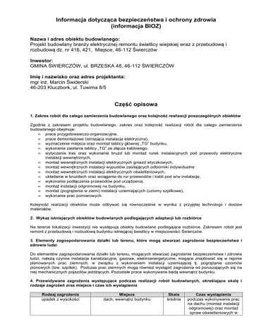 Informacja dotycząca bezpieczeństwa i ochrony zdrowia (informacja BIOZ) Nazwa i adres obiektu budowlanego: Projekt budowlany branży elektrycznej remontu świetlicy wiejskiej wraz z przebudową i rozbudową dz. nr 416, 421, Miejsce, 46-112 Świerczów Inwestor: GMINA ŚWIERCZÓW, ul. BRZESKA 48, 46-112 ŚWIERCZÓW Imię i nazwisko oraz adres projektanta: mgr inż. Marcin Świderski 46-203 Kluczbork, ul. Tuwima 8/5 Część opisowa 1. Zakres robót dla całego zamierzenia budowlanego oraz kolejność realizacji poszczególnych obiektów Zgodnie z zakresem projektu budowlanego, zakres oraz kolejność realizacji robót dla całego zamierzenia budowlanego obejmuje: • prace przygotowawczo-organizacyjne, • prace demontażowe (istniejąca instalacja elektryczna), • wyznaczenie miejsca oraz montaż tablicy głównej „TG” budynku, • wykonanie zasilania tablicy „TG” ze złącza kablowego, • wytyczenie tras oraz wykonanie bruzd lub montaż rurek instalacyjnych pod przewody elektryczne instalacji wewnętrznych, • montaż wewnętrznych instalacji elektrycznych gniazd wtyczkowych, • montaż wewnętrznych instalacji wypustów zasilających odbiorniki indywidualne • montaż wewnętrznych instalacji elektrycznych oświetleniowych, • układanie w bruzdach oraz wciąganie do rur przewodów i kabli pod w/w instalacje, • wykonanie podłączenia przewodów pod urządzenia, • montaż instalacji odgromowej na budynku, • montaż (pogrążenie w ziemi) instalacji uziemiających (uziomy szpilkowe), • wykonanie prac pomiarowych. Kolejność realizacji obiektów może odbywać się równocześnie w wynika z przyjętej technologii i dostaw materiałów. 2. Wykaz istniejących obiektów budowlanych podlegających adaptacji lub rozbiórce Na terenie lokalizacji inwestycji nie występują obiekty budowlane podlegające rozbiórce. Zakresem robót jest remont z przebudową i rozbudową budynku istniejącej świetlicy w miejscowości Świerczów. 3. Elementy zagospodarowania działki lub terenu, które mogą stwarzać zagrożenie bezpieczeństwa i zdrowia ludzi Do elementów zagospodarowania działki lub terenu, mogących stwarzać zagrożenie bezpieczeństwa i zdrowia ludzi, należą czynne instalacje kanalizacyjne, gazowe, elektroenergetyczne, mogące znajdować się w rejonie planowanych prac ziemnych, w związku z wykonaniem instalacji uziemiającej tj. pogrążanie uziomów pionowych (tzw. szpilek). Podczas prac ziemnych mogą również wystąpić zagrożenia od poruszających się na niej mechanicznych pojazdów jeżdżących. Pozostałe prace wykonywane będą wewnątrz budynku. 4. Przewidywane zagrożenia występujące podczas realizacji robót budowlanych, określające skalę i rodzaje zagrożeń oraz miejsce i czas ich wystąpienia Rodzaj zagrożenia upadek z wysokości Miejsce dach, wewnątrz budynku Skala średnia Czas wystąpienia podczas wykonywania prac na dachu (montaż instalacji odgromowej) oraz montaż opraw oświetleniowych w uszkodzenia ciała oraz rany spowodowane użyciem elektronarzędzi oraz narzędzi standardowych (młotek, obcęgi, nóż itp.) potrącenie od pojazdów mechanicznych porażenie prądem, napięcie nN 230/400 V na całym terenie budowy wysoka na drogach dojazdowych do placu budowy średnia złącze kablowe, tablica elektryczna „TG”, ewentualne istniejące linie kablowe, odbiorniki elektryczne, uszkodzenia elektronarzędzi wysoka pomieszczeniach podczas wszystkich prac elektroinstalacyjnych podczas wykonywania robót budowlanych i poruszania się w rejonie dróg dojazdowych na plac budowy podłączanie napięcia, wykonywanie uziemienia, wykonywanie pomiarów, próby, rozruch 5. Informacje o sposobie prowadzenia instruktażu pracowników przed przystąpieniem do realizacji robót szczególnie niebezpiecznych Każdy z pracowników przystępujących do wykonywania danych prac musi zostać dodatkowo poinstruowany i przeszkolony o sposobie realizacji robót budowlanych, a w szczególności jeśli chodzi o prace w wykopach ziemnych i przy robotach montażowych (elektroinstalacyjnych). Pracownicy wykonujący roboty powinni zostać zapoznani z zagrożeniami wynikającymi z wykonywanej pracy. Instruktaż powinien zostać przeprowadzony przez Kierownika budowy lub Kierownika robót. 6. Środki techniczne i organizacyjne, zapobiegające niebezpieczeństwom wynikającym z wykonywania robót budowlanych w strefach szczególnego zagrożenia zdrowia lub w ich sąsiedztwie, w tym zapewniających bezpieczną i sprawną komunikację, umożliwiającą szybką ewakuację na wypadek pożaru, awarii i innych zagrożeń Do środków typu organizacyjnego zaliczyć należy wymóg: 1. popularyzowania zasad prawidłowego użytkowania urządzeń elektrycznych, 2. nauczanie zasad udzielania pierwszej pomocy porażonym i poparzonym prądem elektrycznym, 3. obowiązkowe szkolenie okresowe pracowników zaliczanych do grupy wzmożonego ryzyka porażeniem prądem, głównie elektryków, 4. wymóg posiadania uprawnień kwalifikacyjnych przez osoby zatrudnione przy eksploatacji urządzeń i instalacji energetycznych, 5. przestrzeganie zasad i przepisów bezpieczeństwa pracy dotyczących organizacji prac przy urządzeniach elektrycznych. Środki techniczne stanowiące właściwą ochronę przeciwporażeniową obejmują w zasadzie środki ochrony przed dotykiem bezpośrednim (ochrony podstawowej), stanowiące zabezpieczenie przed porażeniami od napięć roboczych (fazowych) oraz środki ochrony przy dotyku pośrednim (ochrony dodatkowej) zabezpieczające przed porażeniami od napięć dotykowych. Do technicznych środków ochrony zaliczyć należy również środki ochrony osobistej (sprzęt ochronny) mające zastosowanie głównie przy pracach konserwacyjnoremontowych, operacjach łączeniowych i czynnościach pomiarowych. UWAGA KOŃCOWA! Na podstawie powyższej informacji, przed rozpoczęciem budowy, Kierownik budowy zobowiązany jest sporządzić lub zapewnić sporządzenie 