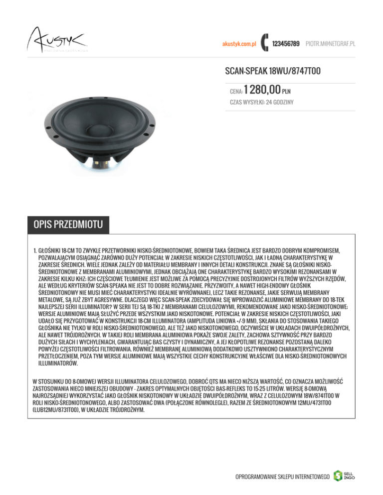 akustyk.com.pl 123456789 [email protected] SCAN-SPEAK 18WU/8747T00 CENA: 1 280,00 PLN CZAS WYSYŁKI: 24 GODZINY OPIS PRZEDMIOTU 1. GŁOŚNIKI 18-CM TO ZWYKLE PRZETWORNIKI NISKO-ŚREDNIOTONOWE, BOWIEM TAKA ŚREDNICA JEST BARDZO DOBRYM KOMPROMISEM, POZWALAJĄCYM OSIĄGNĄĆ ZARÓWNO DUŻY POTENCJAŁ W ZAKRESIE NISKICH CZĘSTOTLIWOŚCI, JAK I ŁADNĄ CHARAKTERYSTYKĘ W ZAKRESIE ŚREDNICH. WIELE JEDNAK ZALEŻY OD MATERIAŁU MEMBRANY I INNYCH DETALI KONSTRUKCJI. ZNANE SĄ GŁOŚNIKI NISKOŚREDNIOTONOWE Z MEMBRANAMI ALUMINIOWYMI, JEDNAK OBCIĄŻAJĄ ONE CHARAKTERYSTYKĘ BARDZO WYSOKIMI REZONANSAMI W ZAKRESIE KILKU KHZ; ICH CZĘŚCIOWE TŁUMIENIE JEST MOŻLIWE ZA POMOCĄ PRECYZYJNIE DOSTROJONYCH FILTRÓW WYŻSZYCH RZĘDÓW, ALE WEDŁUG KRYTERIÓW SCAN-SPEAKA NIE JEST TO DOBRE ROZWIĄZANIE. PRZYZWOITY, A NAWET HIGH-ENDOWY GŁOŚNIK ŚREDNIOTONOWY NIE MUSI MIEĆ CHARAKTERYSTYKI IDEALNIE WYRÓWNANEJ, LECZ TAKIE REZONANSE, JAKIE SERWUJĄ MEMBRANY METALOWE, SĄ JUŻ ZBYT AGRESYWNE. DLACZEGO WIĘC SCAN-SPEAK ZDECYDOWAŁ SIĘ WPROWADZIĆ ALUMINIOWE MEMBRANY DO 18-TEK NAJLEPSZEJ SERII ILLUMINATOR? W SERII TEJ SĄ 18-TKI Z MEMBRANAMI CELULOZOWYMI, REKOMENDOWANE JAKO NISKO-ŚREDNIOTONOWE; WERSJE ALUMINIOWE MAJĄ SŁUŻYĆ PRZEDE WSZYSTKIM JAKO NISKOTONOWE. POTENCJAŁ W ZAKRESIE NISKICH CZĘSTOTLIWOŚCI, JAKI UDAŁO SIĘ PRZYGOTOWAĆ W KONSTRUKCJI 18-CM ILLUMINATORA (AMPLITUDA LINIOWA +/-9 MM), SKŁANIA DO STOSOWANIA TAKIEGO GŁOŚNIKA NIE TYLKO W ROLI NISKO-ŚREDNIOTONOWEGO, ALE TEŻ JAKO NISKOTONOWEGO, OCZYWIŚCIE W UKŁADACH DWUIPÓŁDROŻNYCH, ALE NAWET TRÓJDROŻNYCH. W TAKIEJ ROLI MEMBRANA ALUMINIOWA POKAŻE SWOJE ZALETY, ZACHOWA SZTYWNOŚĆ PRZY BARDZO DUŻYCH SIŁACH I WYCHYLENIACH, GWARANTUJĄC BAS CZYSTY I DYNAMICZNY, A JEJ KŁOPOTLIWE REZONANSE POZOSTANĄ DALEKO POWYŻEJ CZĘSTOTLIWOŚCI FILTROWANIA. RÓWNIEŻ MEMBRANĘ ALUMINIOWĄ DODATKOWO USZTYWNIONO CHARAKTERYSTYCZNYM PRZETŁOCZENIEM, POZA TYM WERSJE ALUMINIOWE MAJĄ WSZYSTKIE CECHY KONSTRUKCYJNE WŁAŚCIWE DLA NISKO-ŚREDNIOTONOWYCH ILLUMINATORÓW. W STOSUNKU DO 8-OMOWEJ WERSJI ILLUMINATORA CELULOZOWEGO, DOBROĆ QTS MA NIECO NIŻSZĄ WARTOŚĆ, CO OZNACZA MOŻLIWOŚĆ ZASTOSOWANIA NIECO MNIEJSZEJ OBUDOWY - ZAKRES OPTYMALNYCH OBJĘTOŚCI BAS-REFLEKS TO 15-25 LITRÓW. WERSJĘ 8-OMOWĄ NAJROZSĄDNIEJ WYKORZYSTAĆ JAKO GŁOŚNIK NISKOTONOWY W UKŁADZIE DWUIPÓŁDROŻNYM, WRAZ Z CELULOZOWYM 18W/8741T00 W ROLI NISKO-ŚREDNIOTONOWEGO, ALBO ZASTOSOWAĆ DWA (POŁĄCZONE RÓWNOLEGLE), RAZEM ZE ŚREDNIOTONOWYM 12MU/4731T00 (LUB12MU/8731T00), W UKŁADZIE TRÓJDROŻNYM. OPROGRAMOWANIE SKLEPU INTERNETOWEGO