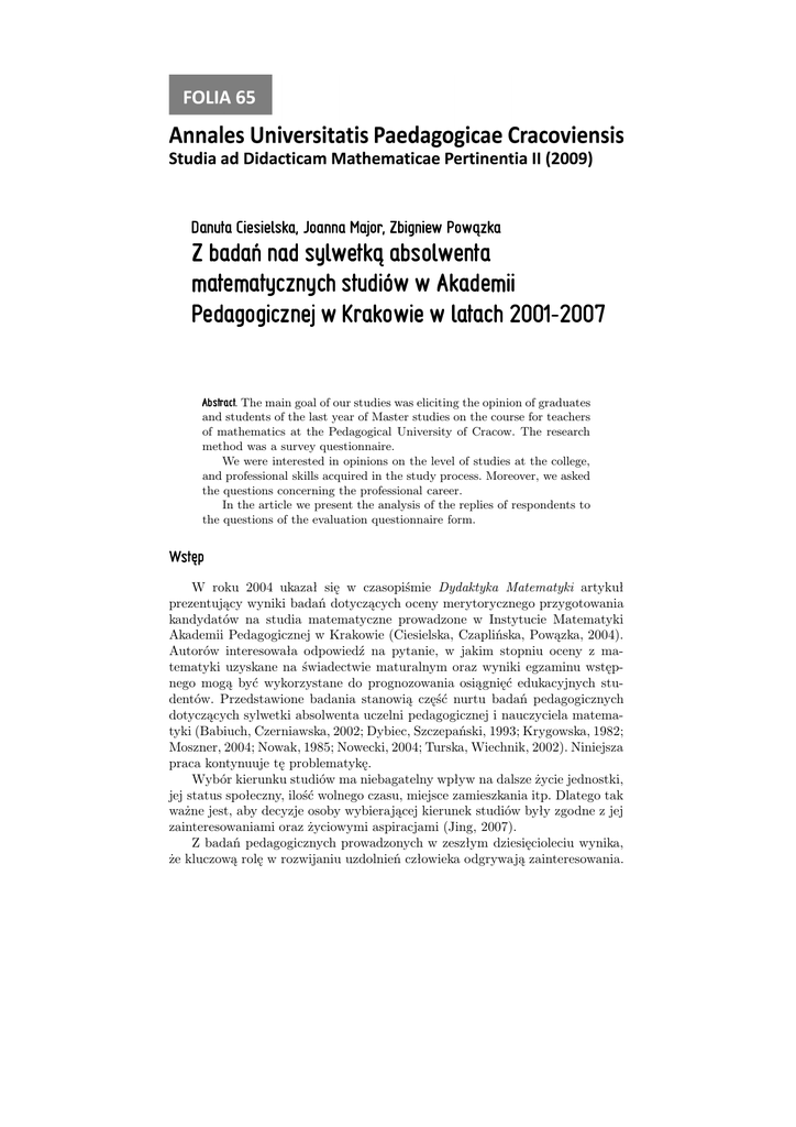 na studia dzienne na kierunek matematyka w Akademii Pedagogicznej w Krakowie, Roczniki Polskiego Towarzystwa Matematycznego, Seria V, Dydaktyka Matematyki 26, 35 - 60.