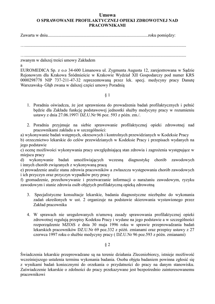 Umowa O SPRAWOWANIE PROFILAKTYCZNEJ OPIEKI ZDROWOTNEJ NAD PRACOWNIKAMI Zawarta w dniu.............................................................................................roku pomiędzy: …..................................................................................................................................................... …..................................................................................................................................................... zwanym w dalszej treści umowy Zakładem a EUROMEDICA Sp. z o.o 34-600 Limanowa ul. Zygmunta Augusta 12, zarejestrowana w Sądzie Rejonowym dla Krakowa Śródmieście w Krakowie Wydział XII Gospodarczy pod numer KRS 0000298778 NIP 737-211-47-32 reprezentowaną przez lek. specj. medycyny pracy Danutę Warszawską- Głąb zwana w dalszej części umowy Poradnią §1 1. Poradnia oświadcza, że jest uprawniona do prowadzenia badań profilaktycznych i pełnić będzie dla Zakładu funkcję podstawowej jednostki służby medycyny pracy w rozumieniu ustawy z dnia 27.06.1997/ DZ.U.Nr 96 poz. 593 z późn. zm./. 2. Poradnia przyjmuje na siebie sprawowanie profilaktycznej opieki zdrowotnej nad pracownikami zakładu a w szczególności: a) wykonywanie badań wstępnych, okresowych i kontrolnych przewidzianych w Kodeksie Pracy b) orzecznictwo lekarskie do celów przewidzianych w Kodeksie Pracy i przepisach wydanych na jego podstawie c) ocenę możliwości wykonywania pracy uwzględniającą stan zdrowia i zagrożenia występujące w miejscu pracy d) wykonywanie badań umożliwiających wczesną diagnostykę chorób zawodowych i innych chorób związanych z wykonywaną pracą e) prowadzenie analiz stanu zdrowia pracowników a zwłaszcza występowania chorób zawodowych i ich przyczyn oraz przyczyn wypadków przy pracy f) gromadzenie, przechowywanie i przetwarzanie informacji o narażaniu zawodowym, ryzyku zawodowym i stanie zdrowia osób objętych profilaktyczną opieką zdrowotną 3. Specjalistyczne konsultacje lekarskie, badania diagnostyczne niezbędne do wykonania zadań określonych w ust. 2 organizuje na podstawie skierowania wystawionego przez Zakład pracownika 4. W sprawach nie uregulowanych n/umową zasady sprawowania profilaktycznej opieki zdrowotnej regulują przepisy Kodeksu Pracy i wydane na jego podstawie a w szczególności rozporządzenie MZOiS z dnia 30 maja 1996 roku w sprawie przeprowadzania badań lekarskich pracowników DZ.U.Nr 69 poz.332 z późń. zmianami oraz przepisy ustawy z 27 czerwca 1997 roku o służbie medycyny pracy ( DZ.U.Nr 96 poz.593 z późn. zmianami) §2 Świadczenia lekarskie przeprowadzane są na terenie działania Zleceniobiorcy, istnieje możliwość wcześniejszego ustalenia terminu wykonania badania. Osoba objęta badaniem powinna zgłosić się z wynikami badań koniecznymi do orzekania o przydatności do pracy na danym stanowisku. Zaświadczenie lekarskie o zdolności do pracy przekazywane jest bezpośrednio zainteresowanemu pracownikowi §3 Zakład zobowiązany jest: przekazać poradni informacje o występowaniu czynników szkodliwych dla zdrowia lub warunkach uciążliwych wraz z aktualnymi wynikami badań i pomiaru tych czynników w skierowaniu indywidualnie dla każdego stanowiska pracy zapewnić możliwość przeglądu stanowisk pracy w celu dokonania oceny warunków pracy udostępnić dokumentację wyników kontroli warunków pracy w części odnoszącej się do ochrony zdrowia §4 Poradnia zapewnia, że wyposażenie i sprzęt jakim dysponuje i jakim się posługuje spełnia wymagania przepisów prawa §5 Usługi określone w poprzednich paragrafach umowy Poradnia świadczy w Limanowej, ul. Zygmunta Augusta 12 w godzinach pracy wg harmonogramu §6 Strony ustalają, że koszt badania jednego pracownika wraz z wydaniem stosownego zaświadczenia będzie wg obowiązującego cennika. Zapłata za usługi następować będzie na podstawie wystawionej faktury płatnej gotówką bądź przelewem w terminie 14 dni od wystawienia faktury na podany numer konta bankowego: PKO BP SA 69 1020 3453 0000 8102 0099 8484. §7 Za rozliczenie finansowe odpowiedzialna jest EUROMEDICA Sp z o.o 34-600 Limanowa, ul. Zygmunta Augusta nr 12 NIP 737-211-47-32 §8 Umowę niniejszą zawarto na czas............................................................................................. z zachowaniem jednomiesięcznego okresu wypowiedzenia przez każdą ze stron. §9 W sprawach nieuregulowanych niniejszą umową stosuje się przepisy Kodeksu Cywilnego § 10 Zmiana umowy może nastąpić jedynie w formie pisemnej pod rygorem nieważności. § 11 Umowę sporządzono w dwóch jednobrzmiących egzemplarzach po jednym dla każdej ze stron. ZAKŁAD …............................................. PORADNIA …................................................