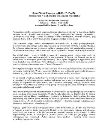 Jean-Pierre Dopagne -„Belfer!” (Prof!) monodram w wykonaniu Wojciecha Pszoniaka przekład – Bogusława Frosztęga reżyseria – Michał Kwieciński scenografia i kostiumy - Irena Biegańska Antagonizm między uczniami i nauczycielem jest zjawiskiem tak starym jak szkoła. Każdy pamięta hasła „Śmierć nauczycielom!”, „Dobry nauczyciel to martwy nauczyciel”, „Nauczyciel twój wróg!”, każdy też pamięta chwilę opamiętania, moment refleksji, gdy poczucie buntu wobec szkoły i nauczycieli ustępuje nostalgii za młodością. Gdy samemu stając wobec obowiązków rodzicielskich, a więc pedagogicznych, nieoczekiwanie dla samego siebie nagle docenia się wysiłek ich włożony w naszą edukację. To wówczas odkrywa się, że surowy belfer w rzeczywistości jest przyjacielem ucznia, w codziennych utarczkach z otoczeniem walczącym o godność – swoją i swoich wychowanków. Bez dwóch zdań – praca w szkole wymaga siły, zdecydowania i osobowości: cech we współczesnym gronie pedagogicznych, wstyd przyznać, deficytowych. Prędzej można się spodziewać, że nauczyciel podda się wcześniej lub w ogóle zrezygnuje z wypełniania swej misji kształtowania młodzieży. Albo skorzysta ze sposobu bohatera monodramu „Belfer” pióra belgijskiego dramaturga Jean – Pierre’a Dopagne’a. Wśród przeznaczonych na scenę utworów trudno o tekst bardziej naszpikowany znaczeniami i stawiający więcej pytań. W swej warstwie fabularnej jest to historia nauczyciela licealnego, któremu przyszło uczyć literatury w szkole dla tak zwanej trudnej młodzieży. W ten sposób wrażliwy, rozkochany w literaturze człowiek o duszy poety, mąż śpiewaczki występującej w chórze operowym, z dnia na dzień staje oko w oko ze współczesną młodzieżą, mającą w pogardzie nie tylko naukę, ale i wszelkie autorytety. Mający poczucie misji nauczyciel nie poddaje się, traktuje swoją pracę jako rodzaj gry, choć bardziej pasowałoby określenie „szkoła przetrwania”. Musi znosić nie tylko brak zainteresowania swoich uczniów, co wydaje się niejako naturalne, ale i świadome prowokacje młodzieży. W chwili, gdy udało mu się doprowadzić do pewnej równowagi między klasą i wykładowcą, dochodzi do katastrofy. Były profesor literatury pasjonujący się teatrem został skazany na wieczną spowiedź: musi publicznie opowiadać swoją historię. Oto oś fabularna monodramu „Belfer” – dramatu zarazem wzruszającego i okrutnego, śmiesznego i przerażającego. Krytycy i publiczność byli zachwyceni tonem sztuki. Podkreślali, że „Belfer” nie opowiada wyłącznie o trudnym życiu nauczycieli. Uznali, że ten monodram, opisując mikrokosmos szkoły daje pod rozwagę, o ile nie kwestionuje, wartości naszego społeczeństwa. A także współczesnego teatru. W recenzjach z „Belfra” pisano, że sztuka jest jak gdyby lustrem odbijającym nas wszystkich. Piękny dramat pełen czułości i humoru, choć czasem wywołujący zgrzytanie zębów.