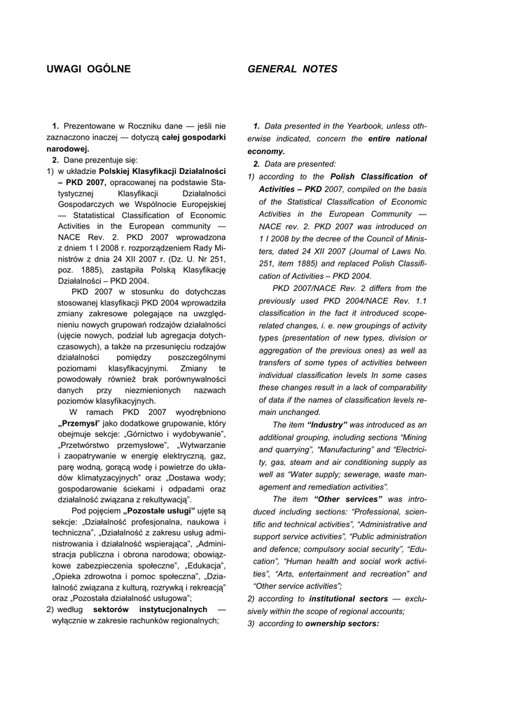 UWAGI OGÓLNE 1. Prezentowane w Roczniku dane — jeśli nie zaznaczono inaczej — dotyczą całej gospodarki narodowej. 2. Dane prezentuje się: 1) w układzie Polskiej Klasyfikacji Działalności – PKD 2007, opracowanej na podstawie Statystycznej Klasyfikacji Działalności Gospodarczych we Wspólnocie Europejskiej — Statatistical Classification of Economic Activities in the European community — NACE Rev. 2. PKD 2007 wprowadzona z dniem 1 I 2008 r. rozporządzeniem Rady Ministrów z dnia 24 XII 2007 r. (Dz. U. Nr 251, poz. 1885), zastąpiła Polską Klasyfikację Działalności – PKD 2004. PKD 2007 w stosunku do dotychczas stosowanej klasyfikacji PKD 2004 wprowadziła zmiany zakresowe polegające na uwzględnieniu nowych grupowań rodzajów działalności (ujęcie nowych, podział lub agregacja dotychczasowych), a także na przesunięciu rodzajów działalności pomiędzy poszczególnymi poziomami klasyfikacyjnymi. Zmiany te powodowały również brak porównywalności danych przy niezmienionych nazwach poziomów klasyfikacyjnych. W ramach PKD 2007 wyodrębniono „Przemysł” jako dodatkowe grupowanie, który obejmuje sekcje: „Górnictwo i wydobywanie”, „Przetwórstwo przemysłowe”, „Wytwarzanie i zaopatrywanie w energię elektryczną, gaz, parę wodną, gorącą wodę i powietrze do układów klimatyzacyjnych” oraz „Dostawa wody; gospodarowanie ściekami i odpadami oraz działalność związana z rekultywacją”. Pod pojęciem „Pozostałe usługi” ujęte są sekcje: „Działalność profesjonalna, naukowa i techniczna”, „Działalność z zakresu usług administrowania i działalność wspierająca”, „Administracja publiczna i obrona narodowa; obowiązkowe zabezpieczenia społeczne”, „Edukacja”, „Opieka zdrowotna i pomoc społeczna”, „Działalność związana z kulturą, rozrywką i rekreacją” oraz „Pozostała działalność usługowa”; 2) według sektorów instytucjonalnych — wyłącznie w zakresie rachunków regionalnych; GENERAL NOTES 1. Data presented in the Yearbook, unless otherwise indicated, concern the entire national economy. 2. Data are presented: 1) according to the Polish Classification of Activities – PKD 2007, compiled on the basis of the Statistical Classification of Economic Activities in the European Community — NACE rev. 2. PKD 2007 was introduced on 1 I 2008 by the decree of the Council of Ministers, dated 24 XII 2007 (Journal of Laws No. 251, item 1885) and replaced Polish Classification of Activities – PKD 2004. PKD 2007/NACE Rev. 2 differs from the previously used PKD 2004/NACE Rev. 1.1 classification in the fact it introduced scoperelated changes, i. e. new groupings of activity types (presentation of new types, division or aggregation of the previous ones) as well as transfers of some types of activities between individual classification levels In some cases these changes result in a lack of comparability of data if the names of classification levels remain unchanged. The item “Industry” was introduced as an additional grouping, including sections “Mining and quarrying”, “Manufacturing” and “Electricity, gas, steam and air conditioning supply as well as “Water supply; sewerage, waste management and remediation activities”. The item “Other services” was introduced including sections: “Professional, scientific and technical activities”, “Administrative and support service activities”, “Public administration and defence; compulsory social security”, “Education”, “Human health and social work activities”, “Arts, entertainment and recreation” and “Other service activities”; 2) according to institutional sectors — exclusively within the scope of regional accounts; 3) according to ownership sectors: GENERAL NOTES 3) według sektorów własności: — sektor publiczny — grupujący własność państwową (Skarbu Państwa i państwowych osób prawnych), własność jednostek samorządu terytorialnego oraz „własność mieszaną” z przewagą kapitału (mienia) podmiotów sektora publicznego, — sektor prywatny — grupujący własność prywatną krajową (osób fizycznych i pozostałych jednostek prywatnych), własność zagraniczną (osób zagranicznych) oraz „własność mieszaną” z przewagą kapitału (mienia) podmiotów sektora prywatnego i brakiem przewagi sektorowej w kapitale (mieniu) podmiotu. „Własność mieszana” określana jest głównie dla spółek i wyznaczana na podstawie struktury kapitału (mienia) deklarowanego we wniosku rejestracyjnym spółki. 3. Prezentowane informacje przedstawione zostały stosownie do zakresu prowadzonych badań, uwzględniających podmioty klasyfikowane według kryterium liczby pracujących i — jeśli nie zaznaczono inaczej — obejmują podmioty o liczbie pracujących: — do 9 osób, — od 10 do 49 osób, — powyżej 49 osób. 4. Dane — jeśli nie zaznaczono inaczej — opracowano zgodnie z każdorazowym stanem organizacyjnym gospodarki narodowej. 5. Dane w podziale według sekcji, działów i grup PKD opracowano — jeśli nie zaznaczono inaczej — tzw. metodą przedsiębiorstw. Metoda przedsiębiorstw (podmiotowa) oznacza przyjmowanie całych podmiotów gospodarki narodowej za podstawę grupowania wszystkich danych charakteryzujących ich działalność według poszczególnych poziomów klasyfikacyjnych i podziałów terytorialnych. 6. Przez podmioty gospodarki narodowej rozumie się jednostki prawne, tj.: osoby prawne, jednostki organizacyjne niemające osobowości prawnej oraz osoby fizyczne prowadzące działalność gospodarczą. Pod pojęciem podmiotów gospodarczych rozumie się podmioty prowadzące działalność gospodarczą (produkcyjną i usługową) na własny rachunek w celu osiągnięcia zysku. 7. Z ważniejszych klasyfikacji, według których prezentuje się dane w Roczniku — obok PKD 2007 — należy wymienić: 1) Klasyfikację Zawodów i Specjalności, na 25 — publ