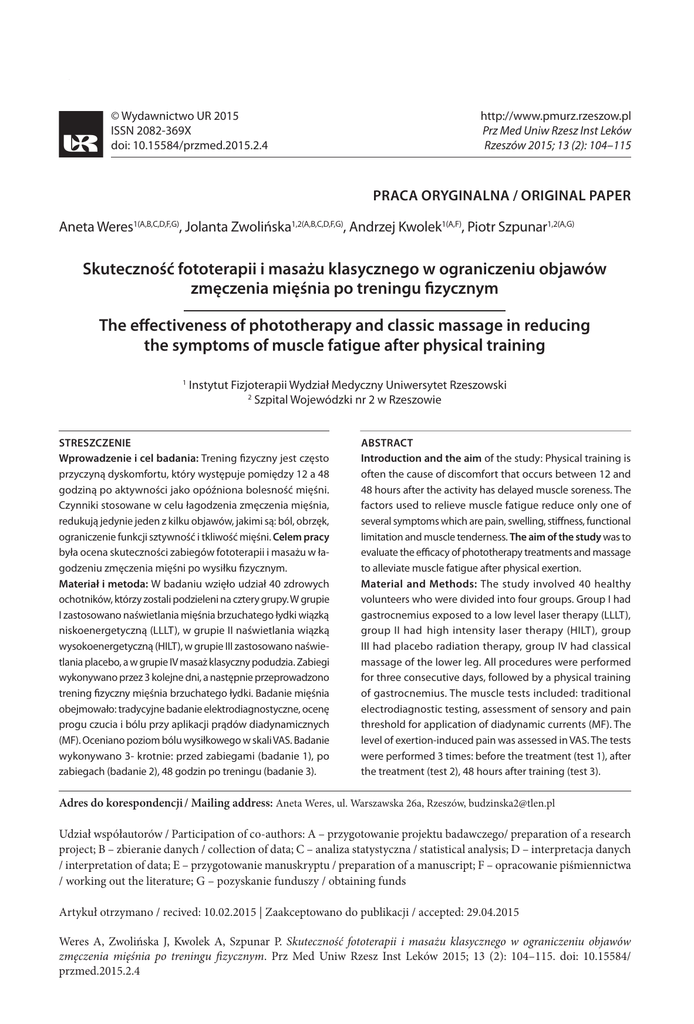 104 Prz Med Uniw Rzesz Inst Leków 2015; 13 (2): 104–115 © Wydawnictwo UR 2015 ISSN 2082-369X doi: 10.15584/przmed.2015.2.4 http://www.pmurz.rzeszow.pl Prz Med Uniw Rzesz Inst Leków Rzeszów 2015; 13 (2): 104–115 PracA oryginalnA / ORIGINAL PAPER Aneta Weres1(A,B,C,D,F,G), Jolanta Zwolińska1,2(A,B,C,D,F,G), Andrzej Kwolek1(A,F), Piotr Szpunar1,2(A,G) Skuteczność fototerapii i masażu klasycznego w ograniczeniu objawów zmęczenia mięśnia po treningu fizycznym The effectiveness of phototherapy and classic massage in reducing the symptoms of muscle fatigue after physical training 1 Instytut Fizjoterapii Wydział Medyczny Uniwersytet Rzeszowski 2 Szpital Wojewódzki nr 2 w Rzeszowie Streszczenie Wprowadzenie i cel badania: Trening fizyczny jest często przyczyną dyskomfortu, który występuje pomiędzy 12 a 48 godziną po aktywności jako opóźniona bolesność mięśni. Czynniki stosowane w celu łagodzenia zmęczenia mięśnia, redukują jedynie jeden z kilku objawów, jakimi są: ból, obrzęk, ograniczenie funkcji sztywność i tkliwość mięśni. Celem pracy była ocena skuteczności zabiegów fototerapii i masażu w łagodzeniu zmęczenia mięśni po wysiłku fizycznym. Materiał i metoda: W badaniu wzięło udział 40 zdrowych ochotników, którzy zostali podzieleni na cztery grupy. W grupie I zastosowano naświetlania mięśnia brzuchatego łydki wiązką niskoenergetyczną (LLLT), w grupie II naświetlania wiązką wysokoenergetyczną (HILT), w grupie III zastosowano naświetlania placebo, a w grupie IV masaż klasyczny podudzia. Zabiegi wykonywano przez 3 kolejne dni, a następnie przeprowadzono trening fizyczny mięśnia brzuchatego łydki. Badanie mięśnia obejmowało: tradycyjne badanie elektrodiagnostyczne, ocenę progu czucia i bólu przy aplikacji prądów diadynamicznych (MF). Oceniano poziom bólu wysiłkowego w skali VAS. Badanie wykonywano 3- krotnie: przed zabiegami (badanie 1), po zabiegach (badanie 2), 48 godzin po treningu (badanie 3). Abstract Introduction and the aim of the study: Physical training is often the cause of discomfort that occurs between 12 and 48 hours after the activity has delayed muscle soreness. The factors used to relieve muscle fatigue reduce only one of several symptoms which are pain, swelling, stiffness, functional limitation and muscle tenderness. The aim of the study was to evaluate the efficacy of phototherapy treatments and massage to alleviate muscle fatigue after physical exertion. Material and Methods: The study involved 40 healthy volunteers who were divided into four groups. Group I had gastrocnemius exposed to a low level laser therapy (LLLT), group II had high intensity laser therapy (HILT), group III had placebo radiation therapy, group IV had classical massage of the lower leg. All procedures were performed for three consecutive days, followed by a physical training of gastrocnemius. The muscle tests included: traditional electrodiagnostic testing, assessment of sensory and pain threshold for application of diadynamic currents (MF). The level of exertion-induced pain was assessed in VAS. The tests were performed 3 times: before the treatment (test 1), after the treatment (test 2), 48 hours after training (test 3). Adres do korespondencji / Mailing address: Aneta Weres, ul. Warszawska 26a, Rzeszów, [email protected] Udział współautorów / Participation of co-authors: A – przygotowanie projektu badawczego/ preparation of a research project; B – zbieranie danych / collection of data; C – analiza statystyczna / statistical analysis; D – interpretacja danych / interpretation of data; E – przygotowanie manuskryptu / preparation of a manuscript; F – opracowanie piśmiennictwa / working out the literature; G – pozyskanie funduszy / obtaining funds Artykuł otrzymano / recived: 10.02.2015 | Zaakceptowano do publikacji / accepted: 29.04.2015 Weres A, Zwolińska J, Kwolek A, Szpunar P. Skuteczność fototerapii i masażu klasycznego w ograniczeniu objawów zmęczenia mięśnia po treningu fizycznym. Prz Med Uniw Rzesz Inst Leków 2015; 13 (2): 104–115. doi: 10.15584/ przmed.2015.2.4 Weres, Zwolińska, Kwolek, Szpunar Skuteczność fototerapii i masażu klasycznego w ograniczeniu objawów zmęczenia mięśnia… 105 Wyniki: Po wykonaniu zabiegów (badanie1–2) największy wzrost wartości reobazy oraz największy wzrost poziomu bólu ocenianego przy aplikacji prądu MF odnotowano w grupie masażu. W całym okresie badawczym (badanie 1–3) w grupie LLLT nastąpił istotny statystycznie wzrost wartości progowej akomodacji. W drugiej dobie po treningu (badanie 2–3) we wszystkich grupach odnotowano obniżenie wartości chronaksji z wyjątkiem grupy placebo, a różnice pomiędzy grupami były istotne statystycznie. Wnioski: Masaż klasyczny poprzez wzrost wartości reobazy i podwyższenie progu bólu może podnosić odporność zdrowego mięśnia na działanie czynników zewnętrznych i redukować objawy opóźnionej bolesności mięśni szkieletowych. Laseroterapia niskoenergetycznna (LLLT) zastosowana przed treningiem mięśnia pozwala na utrzymanie jego odporności na czynniki zewnętrzne i może być przydatna w ograniczaniu objawów opóźnionej bolesności mięśni szkieletowych. Słowa kluczowe: trening fizyczny, opóźniona bolesność mięśni szkieletowych (DOMS), promieniowanie laserowe, masaż, badanie elektrodiagnostyczne, pobudliwość nerwowo-mięśniowa Results: After treatment (tests 1–2) the most significant increase in the value of rheobase and the largest increase in the level of pain assessed at MF current application were reported in the group who had massage. In the entire test period (test 1–3) in the group who had LLLT there was a statistically significant increase in the threshold value of accommodation. In the second day after the training (test 2–3) all groups had a decrease in the value of chronaxie with the exception of the placebo group and the differences between the g